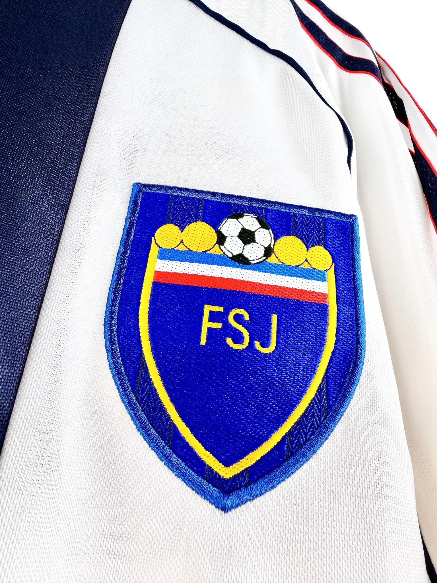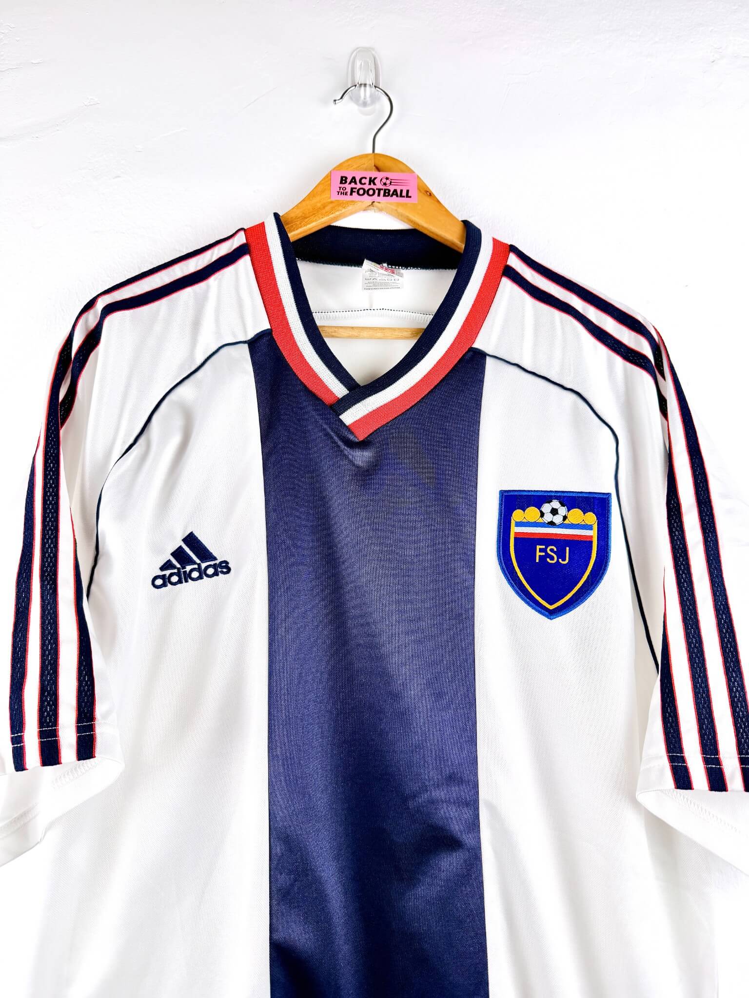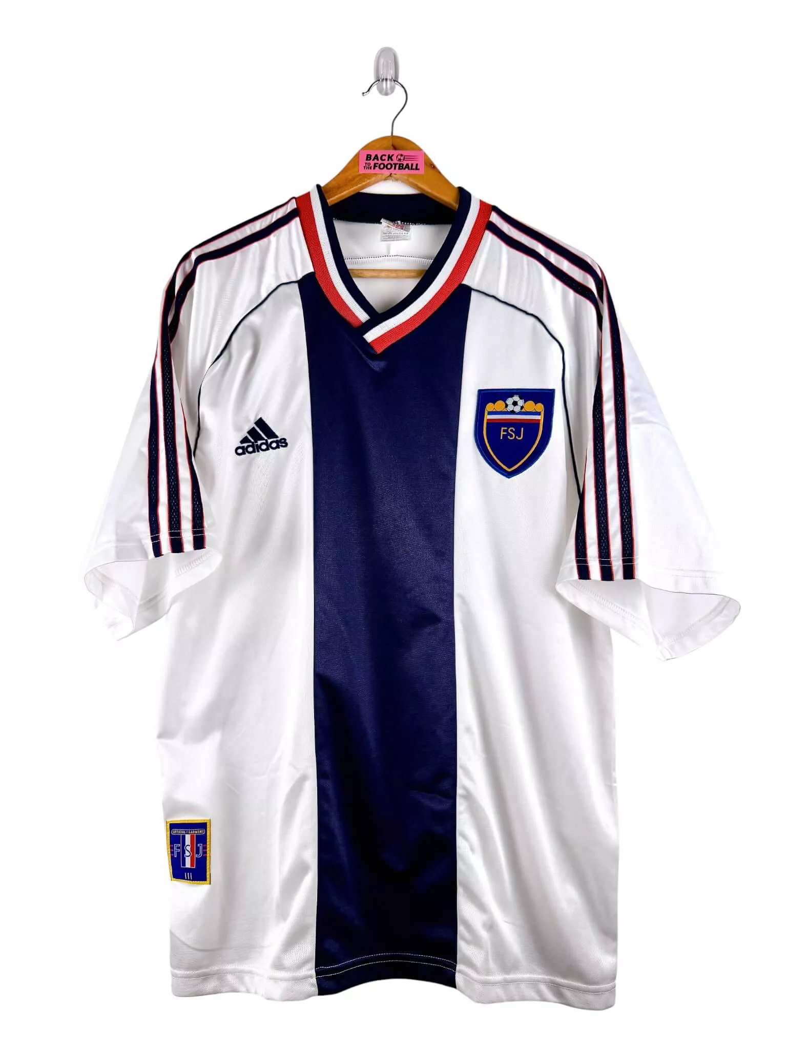 Taille : L Largeur : 57cm (aisselle à aisselle) Longueur : 74cm (base du col au bas) Si tu veux plus de détails, tu peux nous contacter par mail ou sur les réseaux 😉 Etat : 9/10, excellent état Le maillot : maillot vintage extérieur de la Yougoslavie 1998. L’écusson et le logo Adidas sont brodés. Très beau maillot rétro de la Yougoslavie ! Histoire : après avoir terminés 2èmes en phase de groupe pendant la Coupe du Monde 98, les yougoslaves sont éliminés 2-1 en huitièmes contre les Pays-Bas avec des buts de Bergkamp et Davids. Quelques joueurs :…