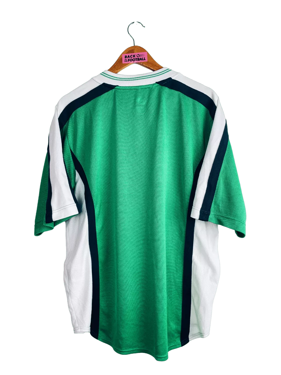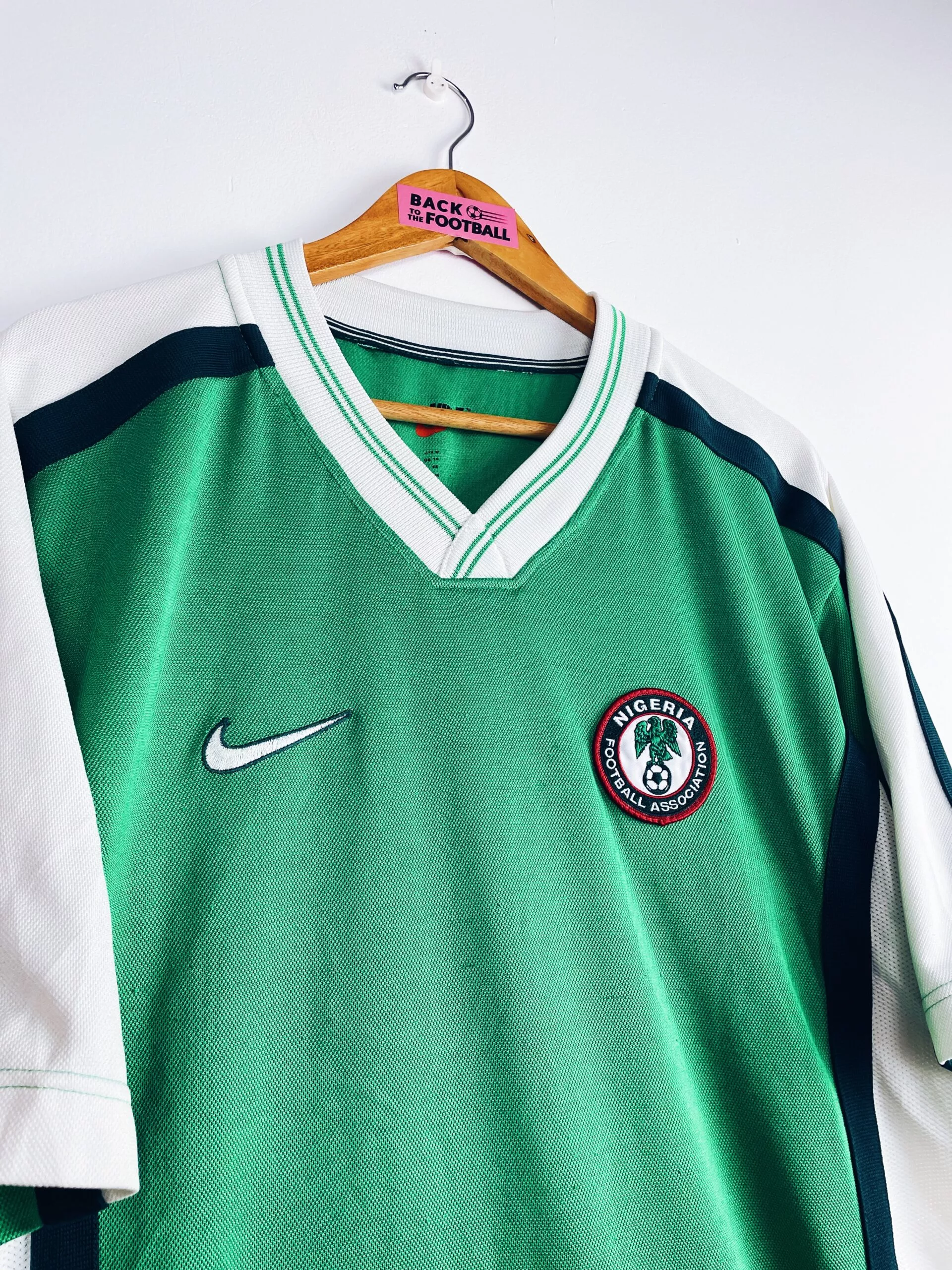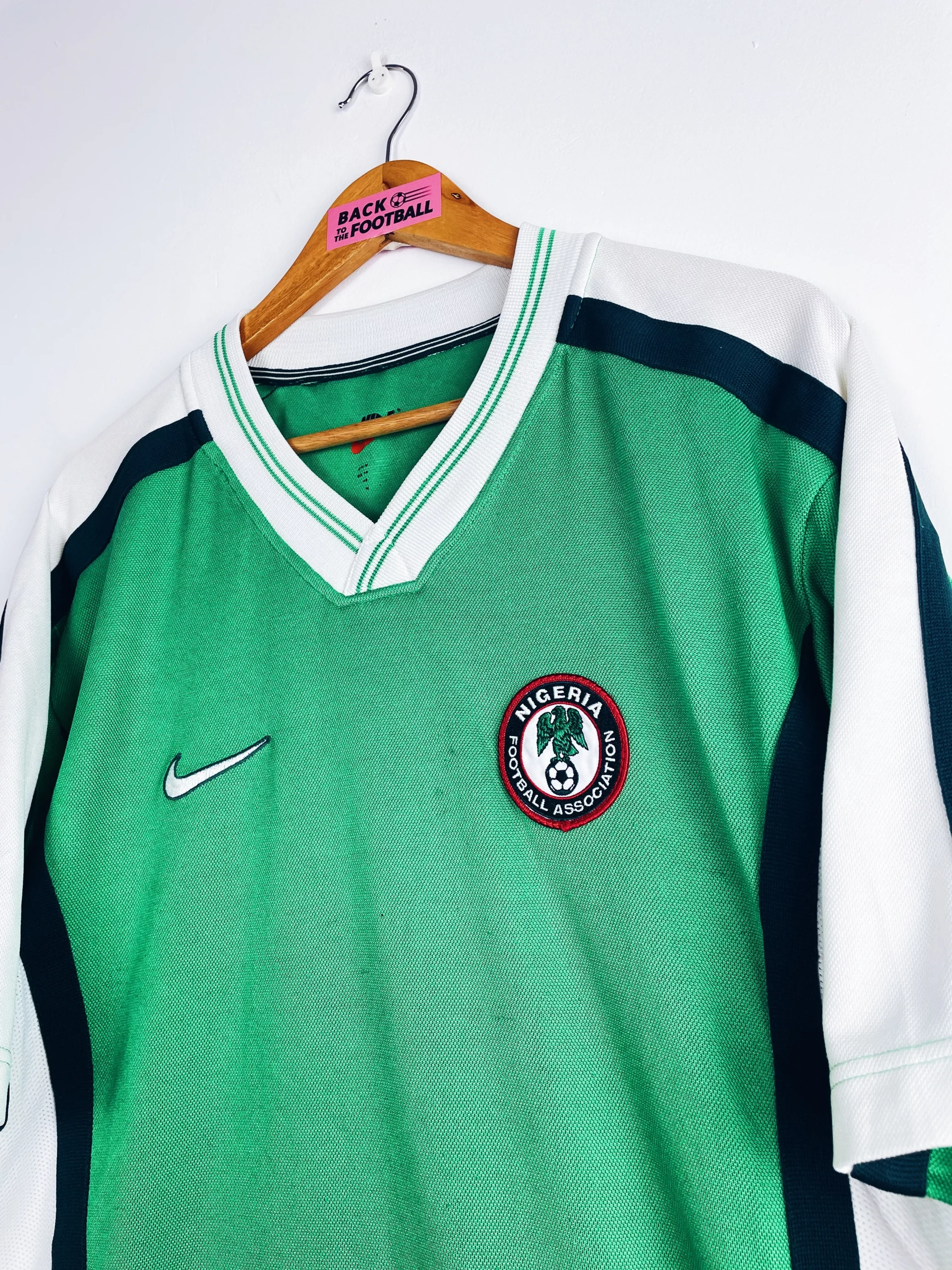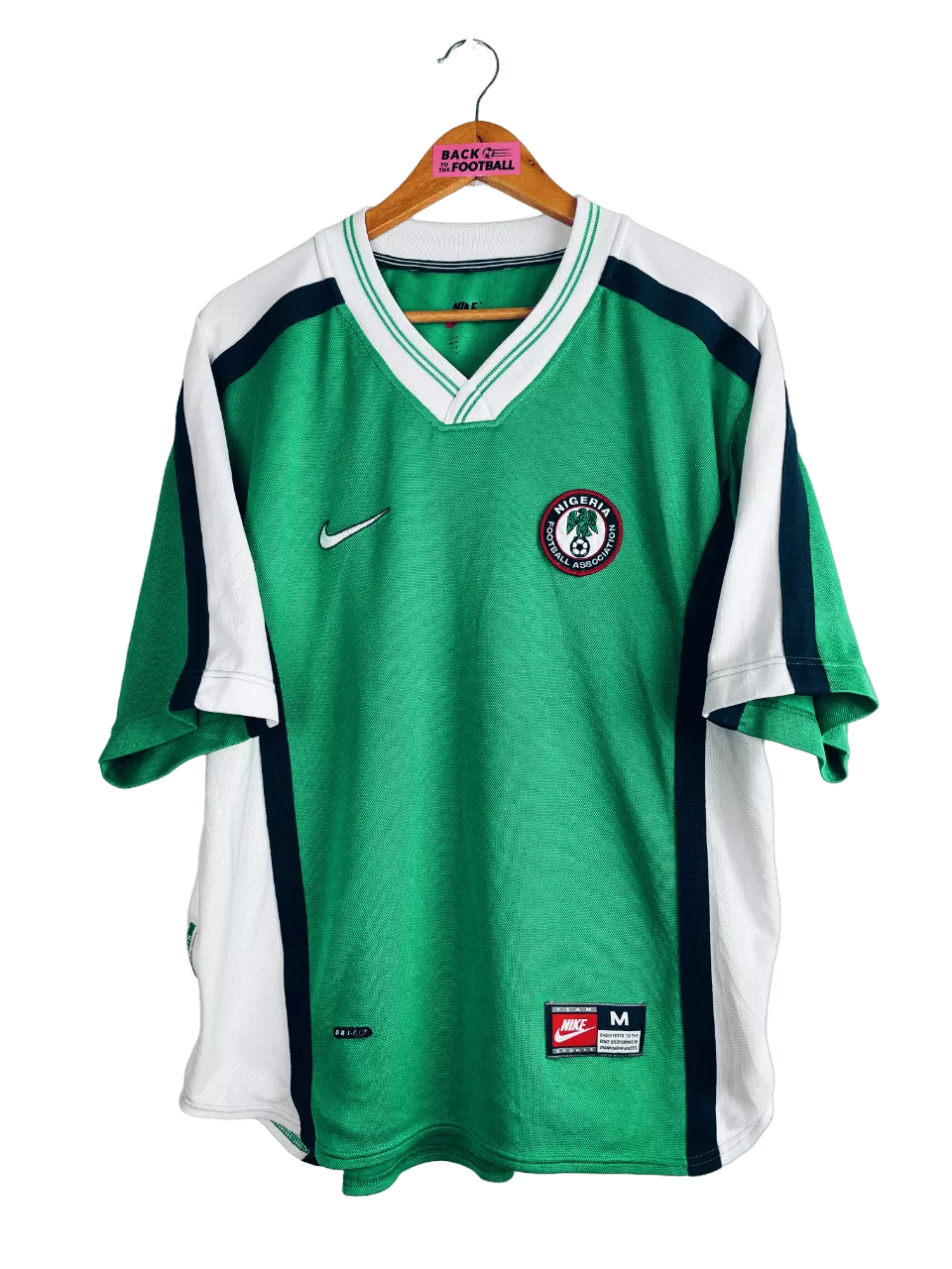 Taille : M Etat : 8/10, très bon état mais des micros traces à noter (voir photo) Le maillot : maillot vintage domicile du Nigéria 1998, utilisé pour la coupe du Monde. L’écusson et le logo Nike sont brodés. Très beau maillot rétro du Nigéria ! Histoire : les Nigérians participent de justesse à la Coupe du Monde en France. Le pays, sous la dictature du militaire Sani Abacha, est sous les feux des critiques internationales suite à des manquements aux droits de l’Homme. Les Super Eagles sont bannis de la CAN 1998. Mais la France accepte leur participation au…