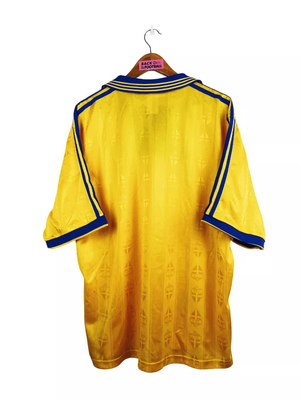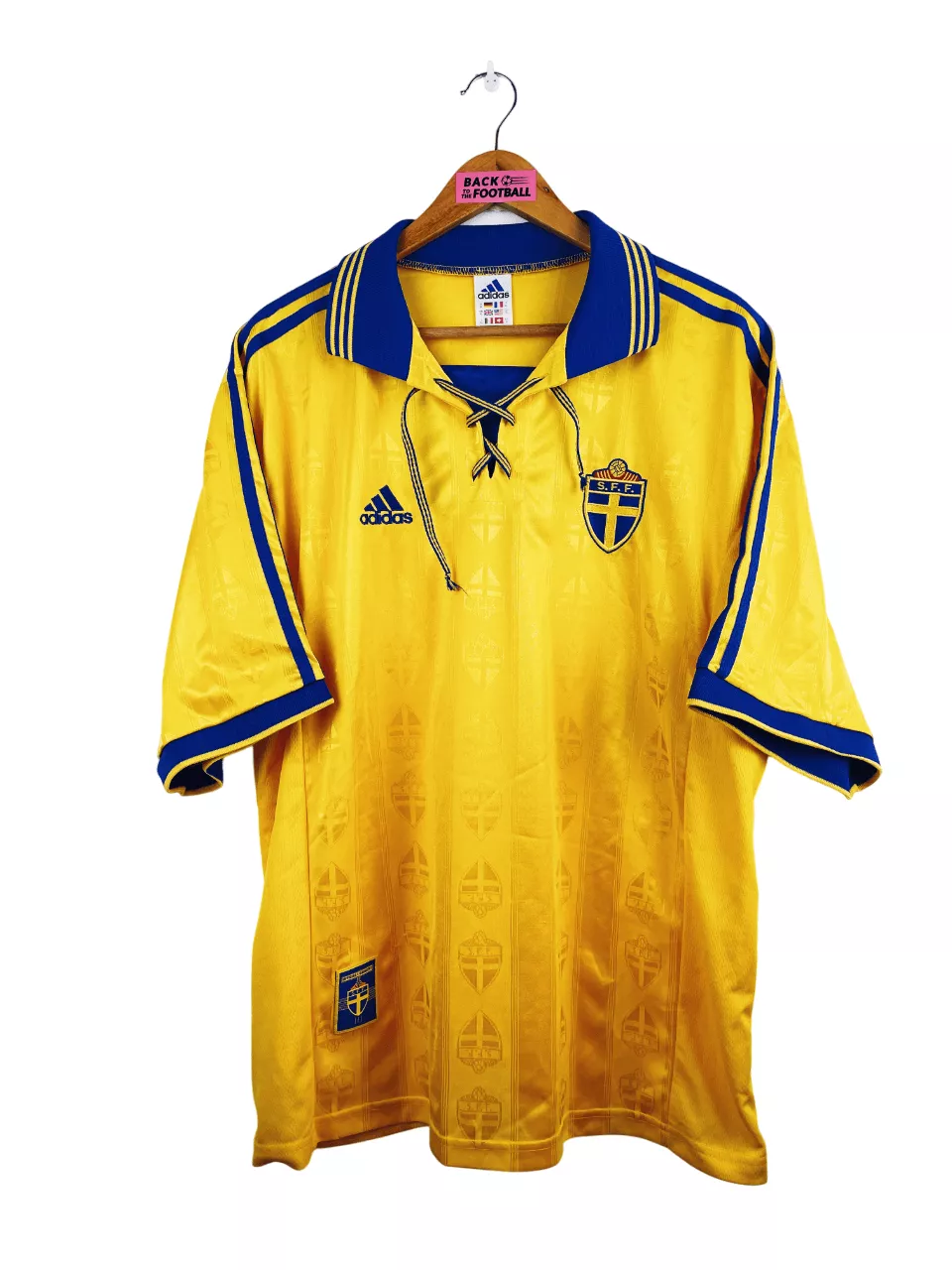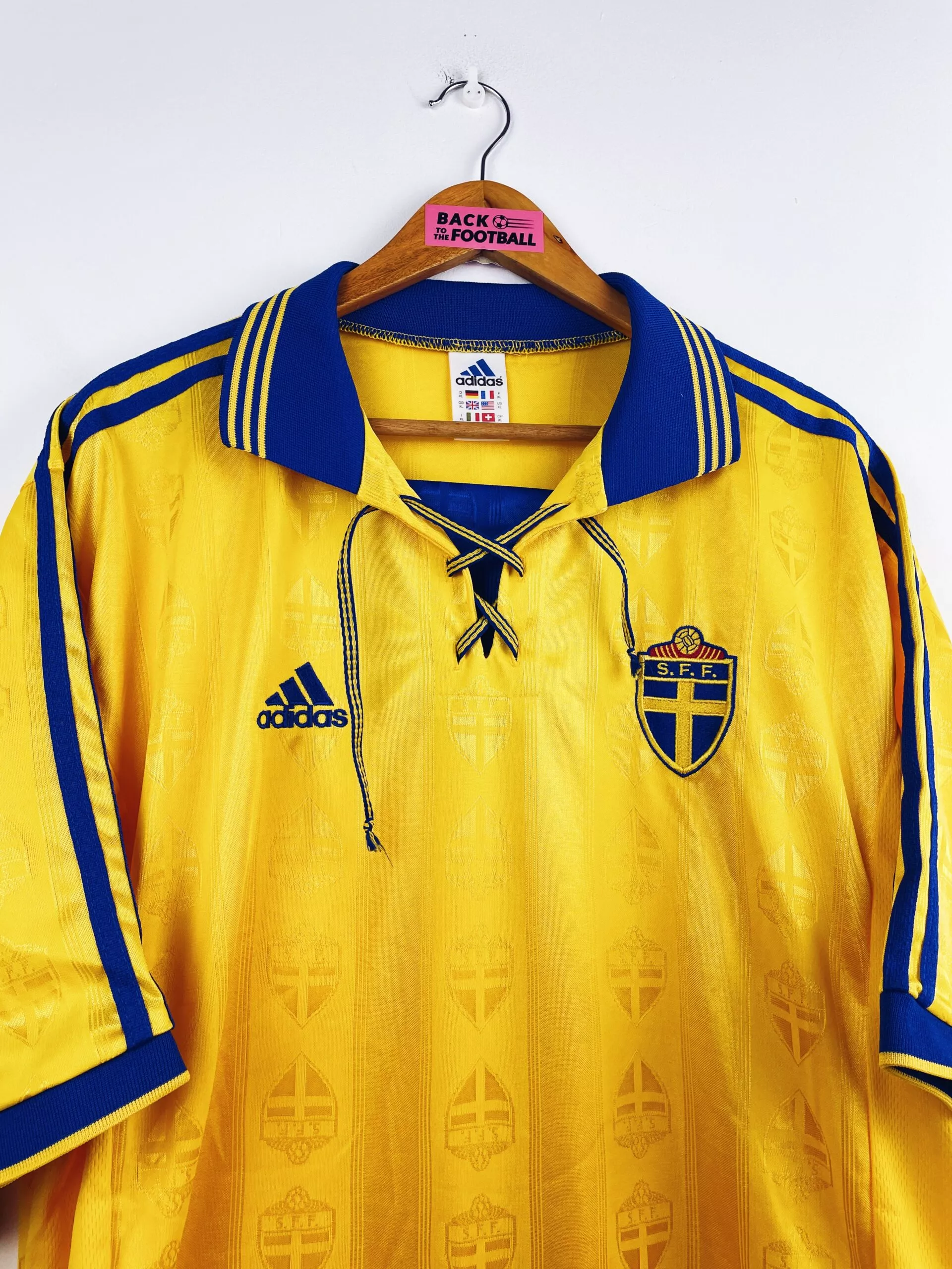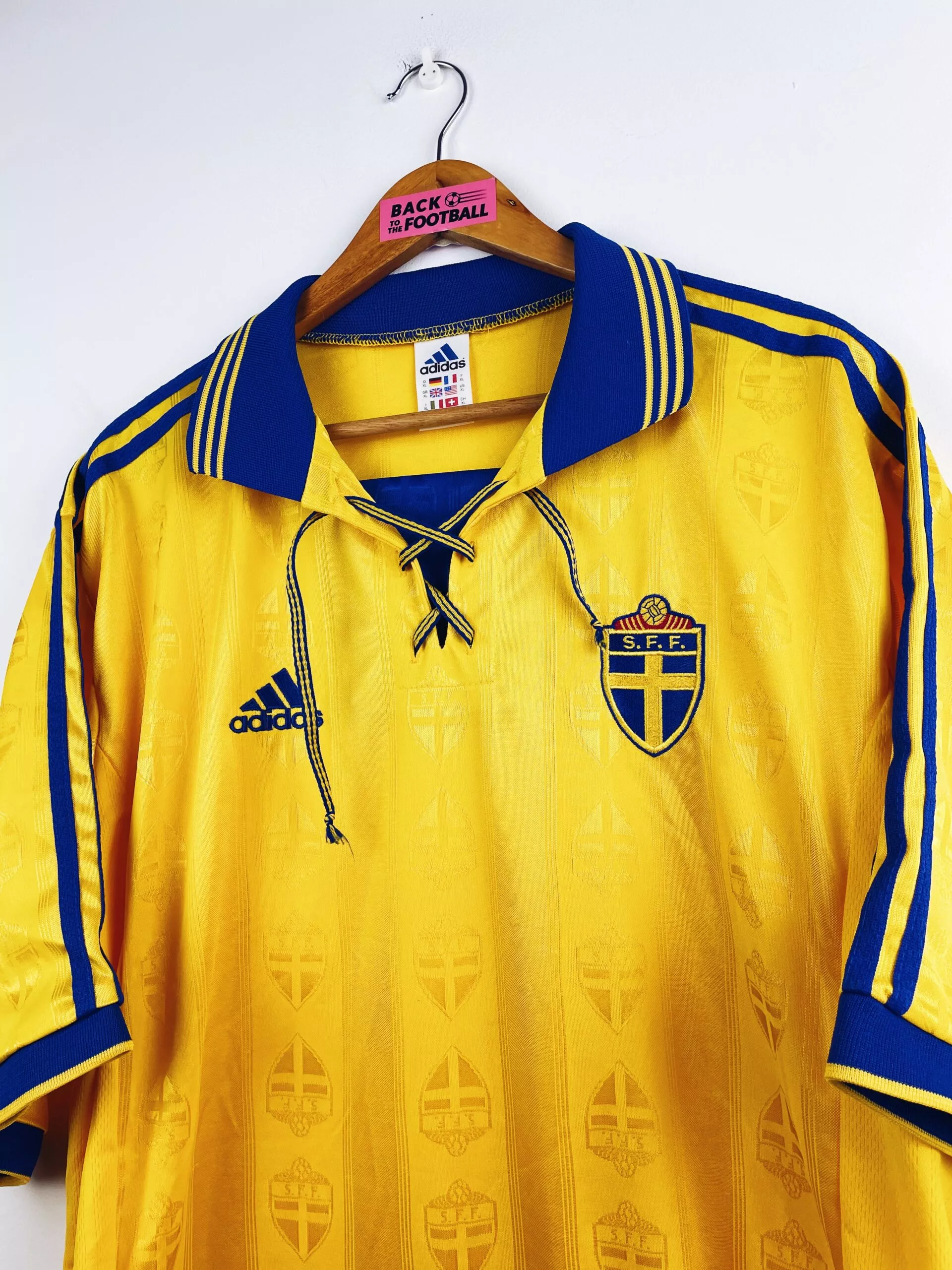 Taille : XL Si tu veux plus de détails, tu peux nous contacter par mail ou sur les réseaux 😉 Etat : 8/10, très bon état, quelques bouloches Le maillot : maillot vintage domicile de la Suède 1998. L’écusson et le logo Adidas sont brodés. On peut voir en tramé l’écusson sur tout le maillot. Le col à lacets est magnifique. Très beau maillot rétro de la Suède ! Histoire : les suedois échouent à se qualifier pour la Coupe du Monde 1998 avec une 3ème place dans leur groupe, derrière l’Autriche et l’Ecosse.