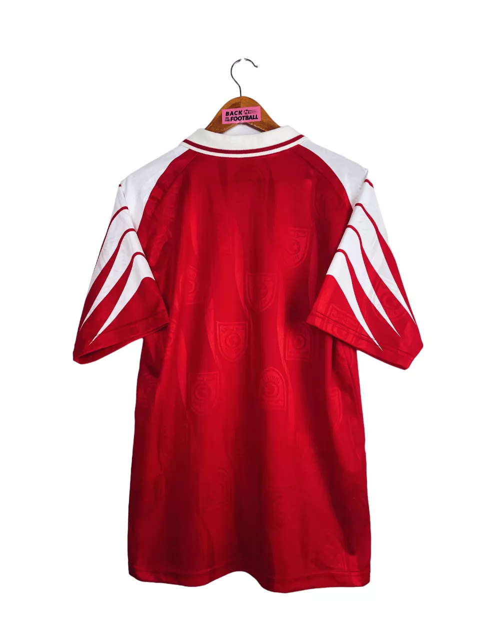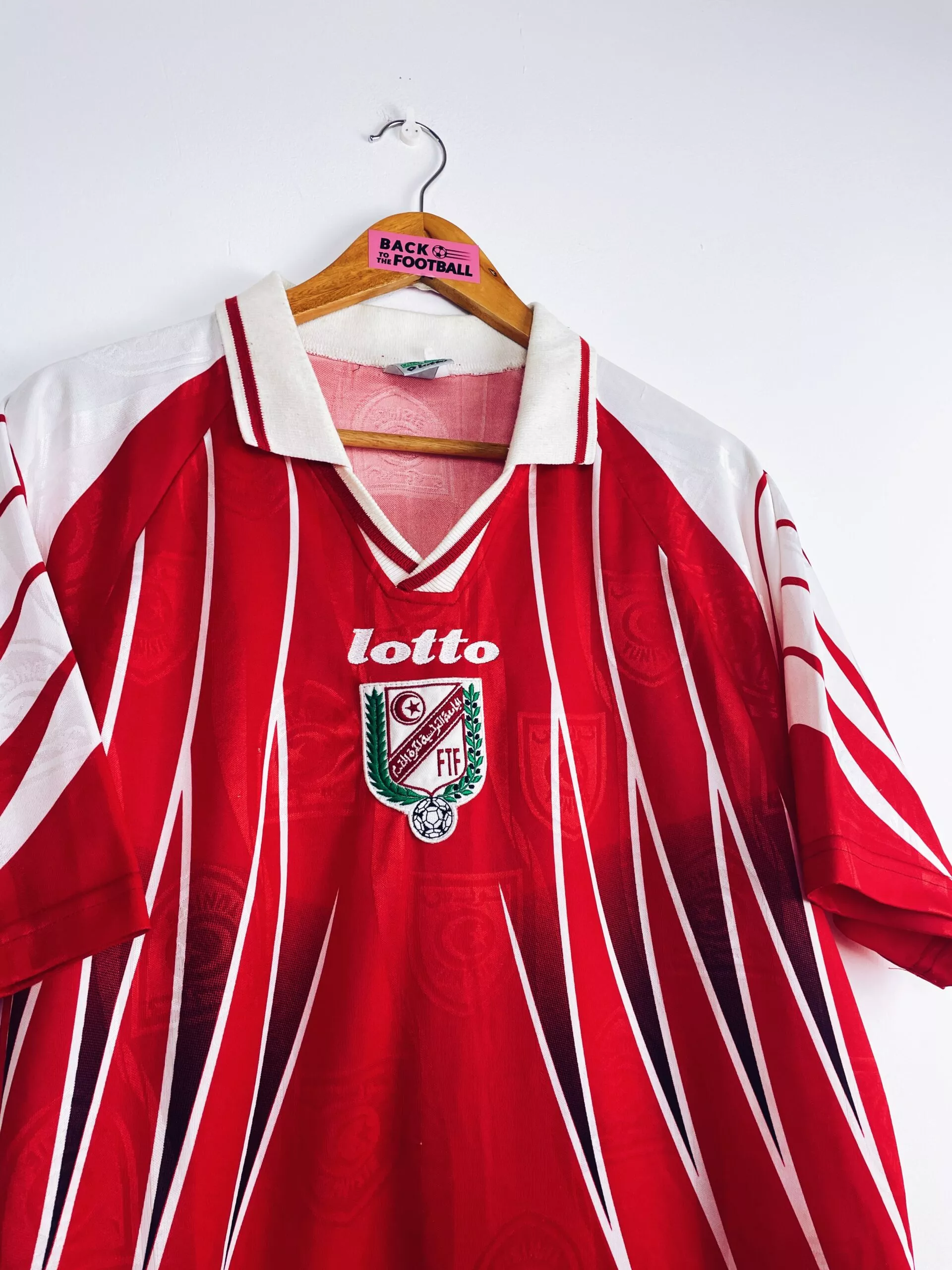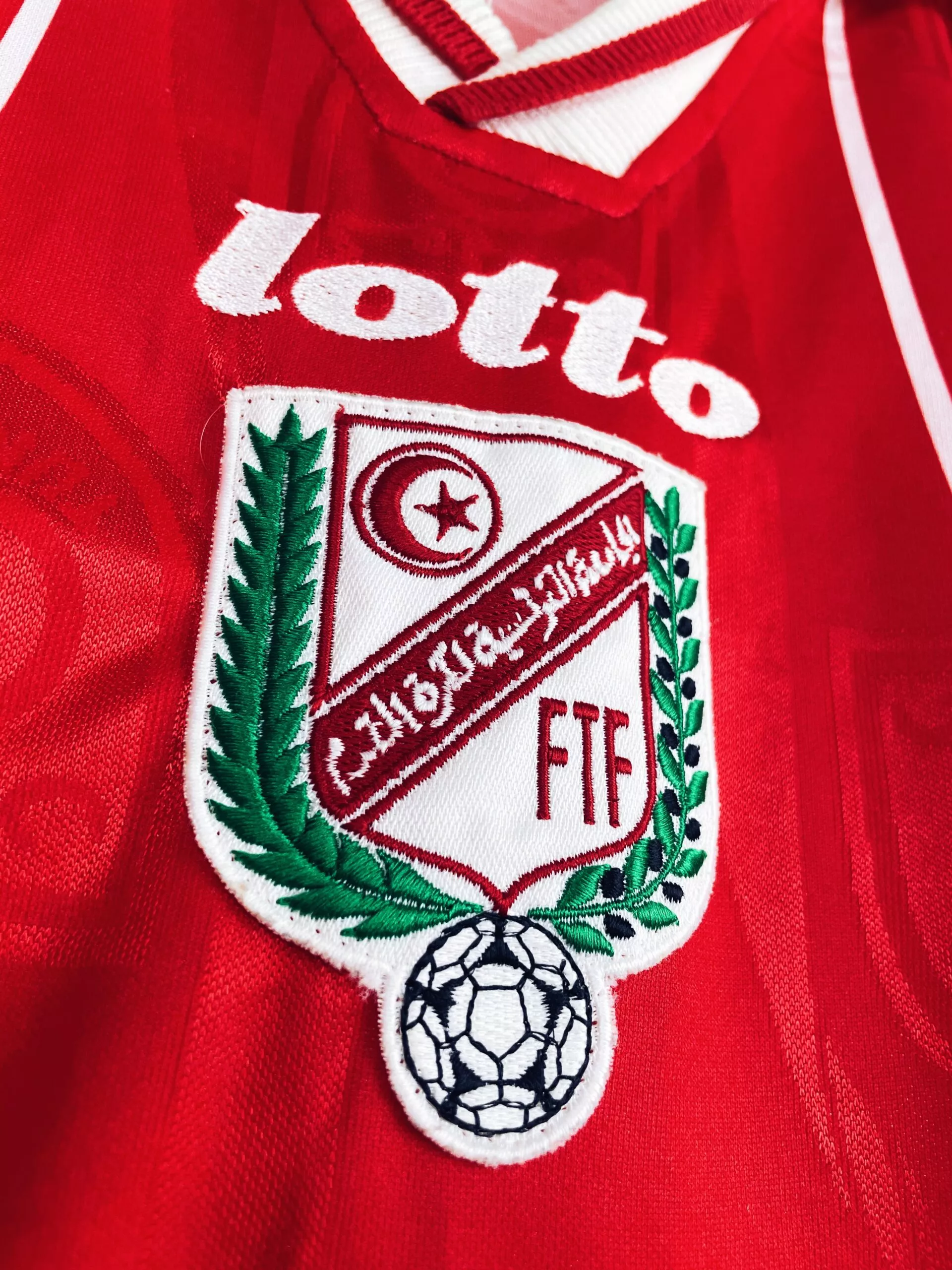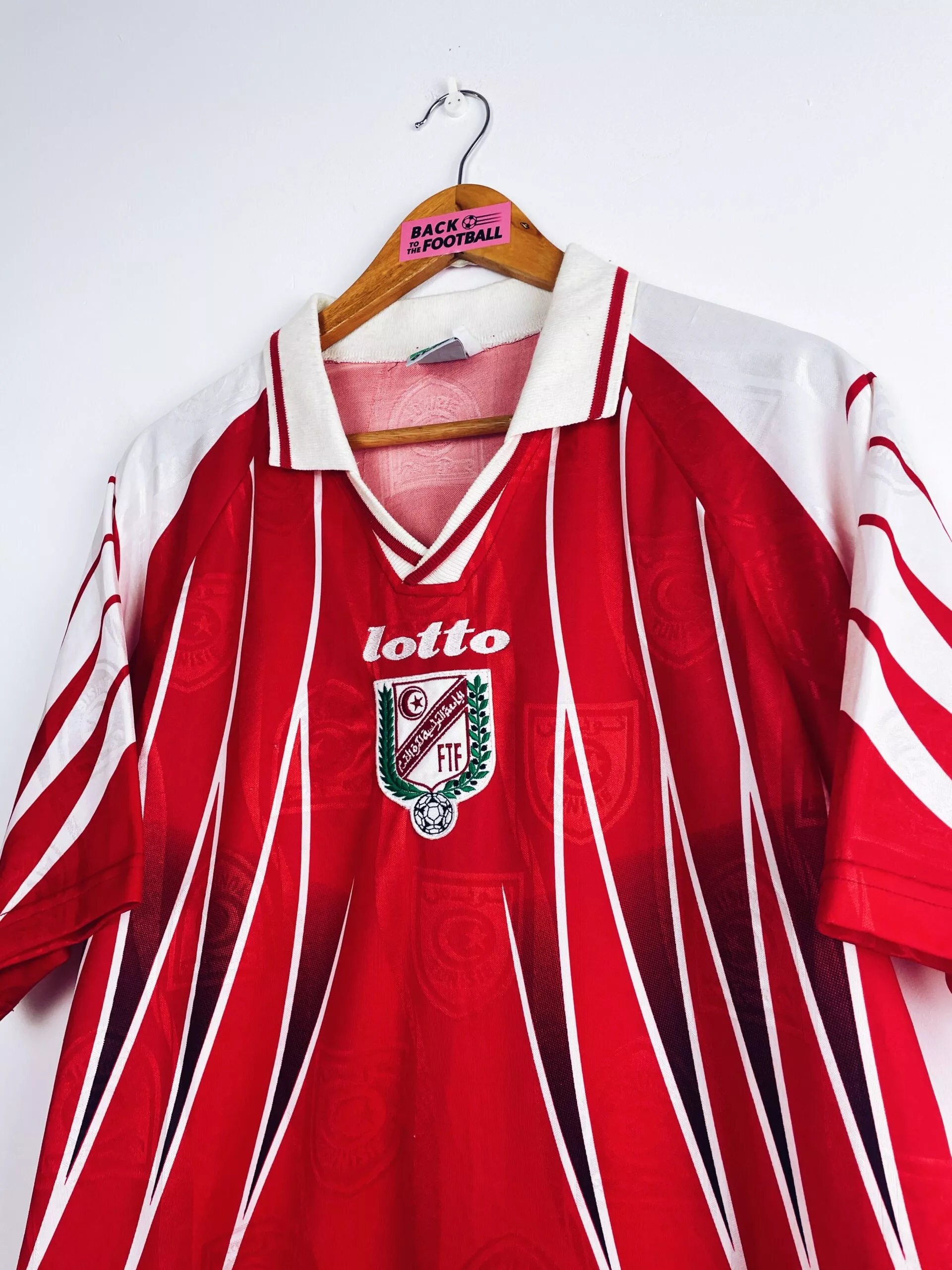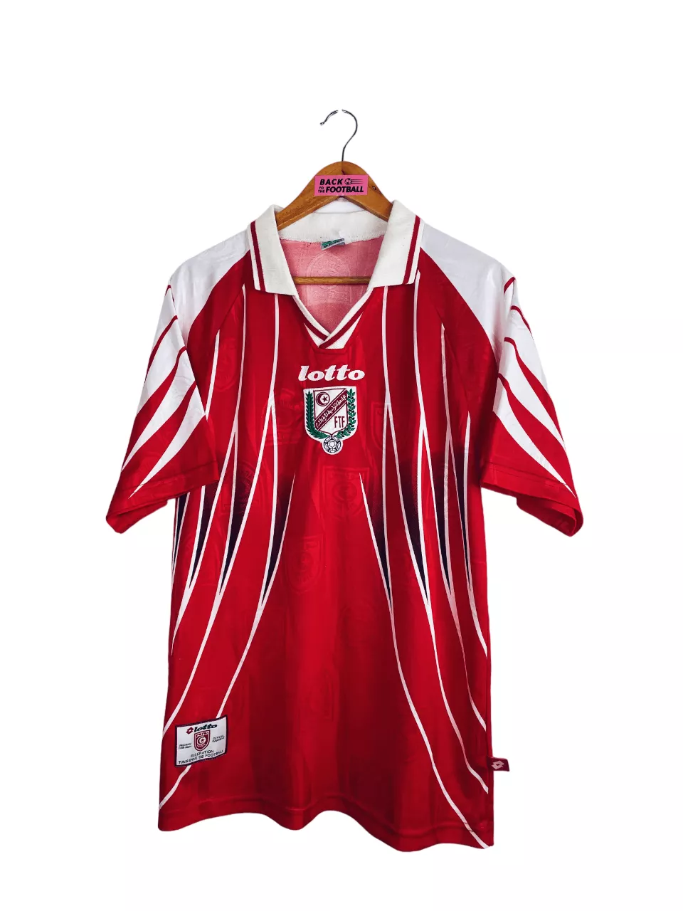 Taille : L Largeur : 51cm (aisselle à aisselle) Longueur : 71cm (base du col au bas) Etat : 8/10, très bon état, très légère trace au niveau de l’épaule, quasi invisible (voir photo) Le maillot : maillot vintage domicile de la Tunisie 1998. L’écusson et le logo Lotto sont brodés. On peut voir en tramé sur tout le maillot l’écusson de la Tunisie. Très beau maillot rétro de la Tunisie ! Histoire : les Tunisiens participent pour la 2ème fois de leur histoire à la Coupe du Monde. Ils tombent dans un groupe relevé avec la Roumanie, l’Angleterre et…