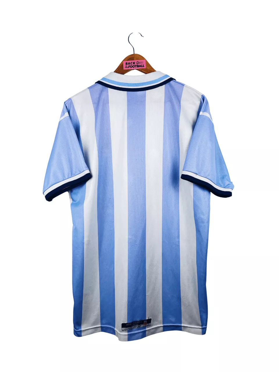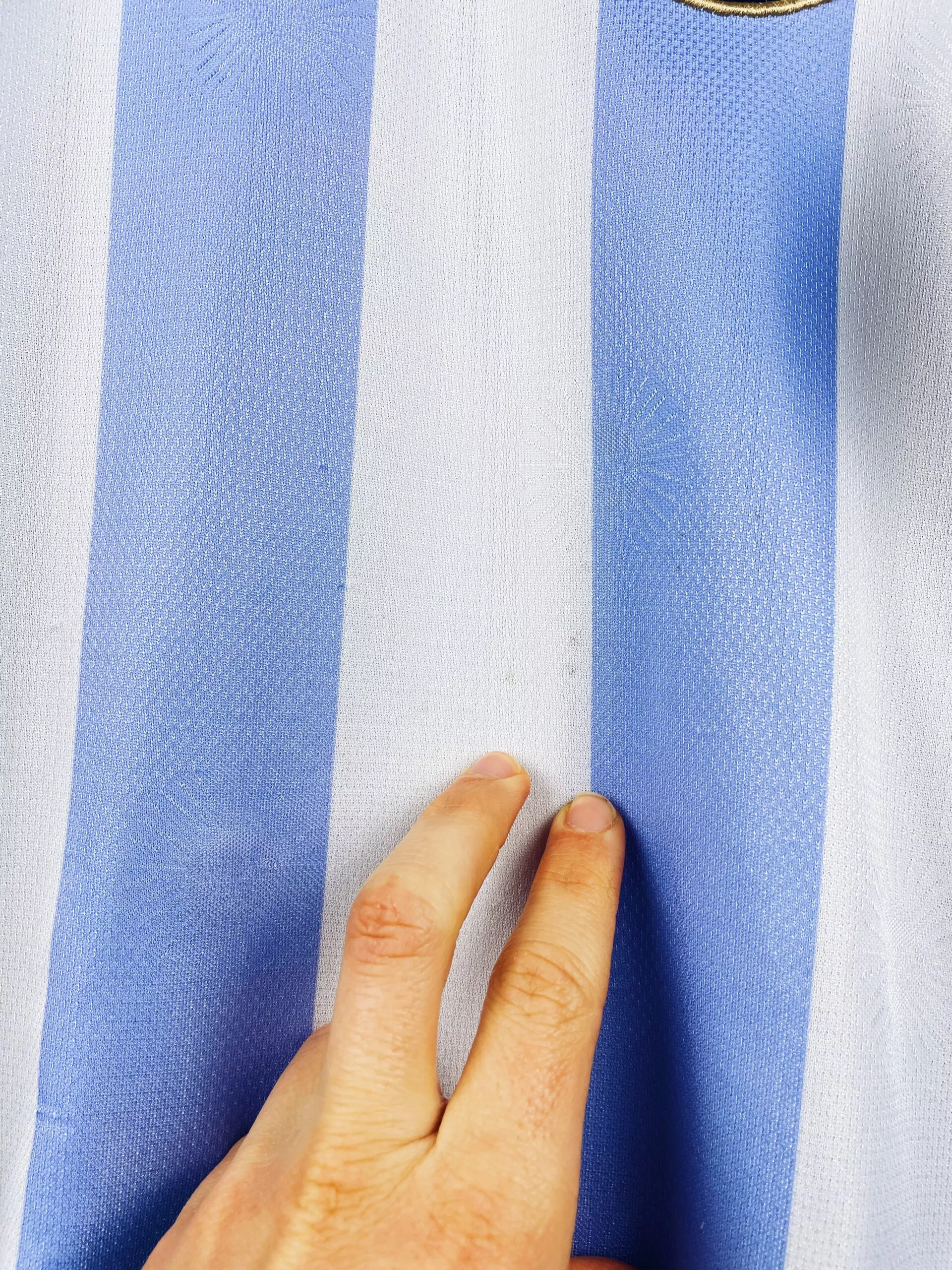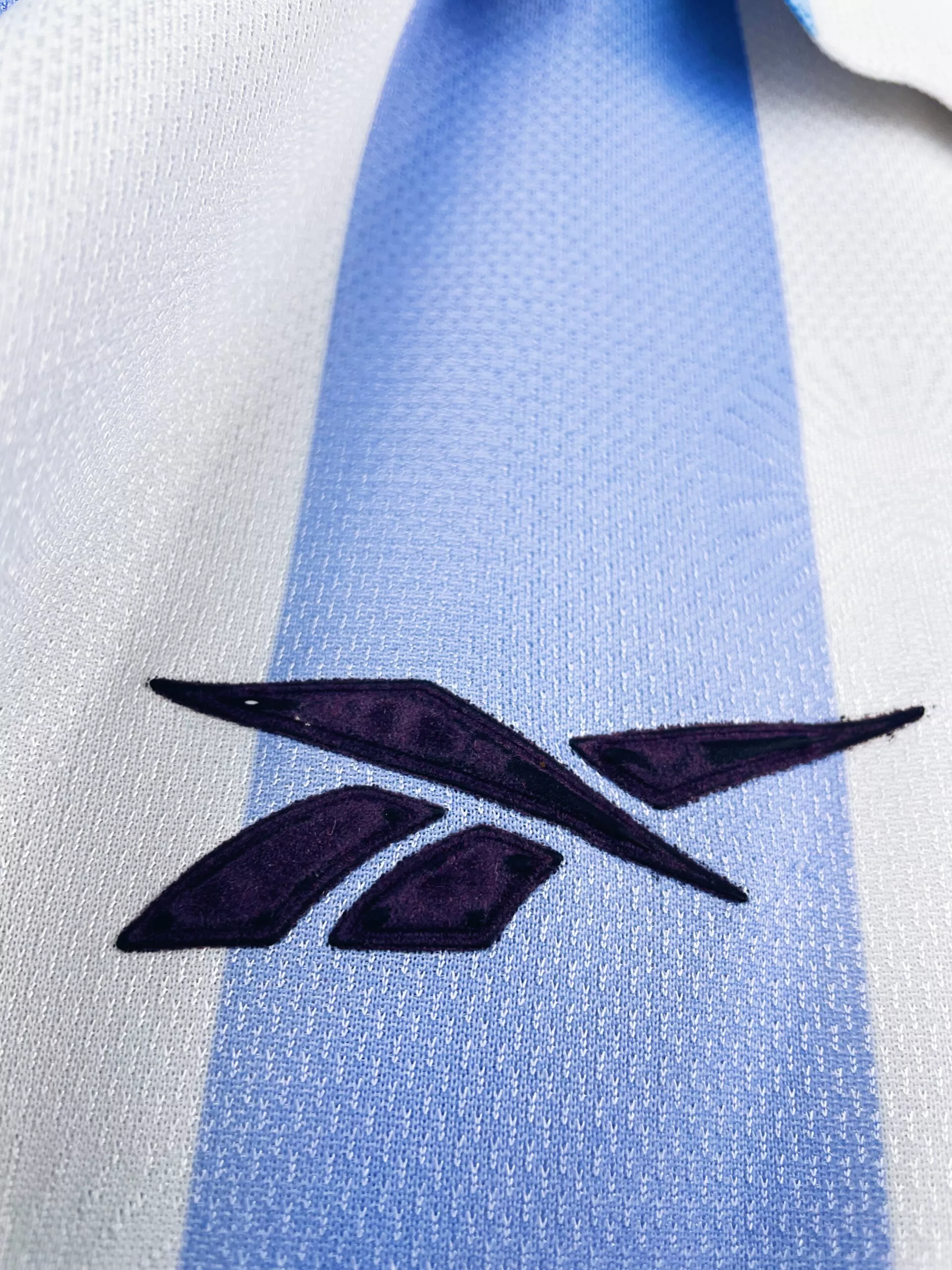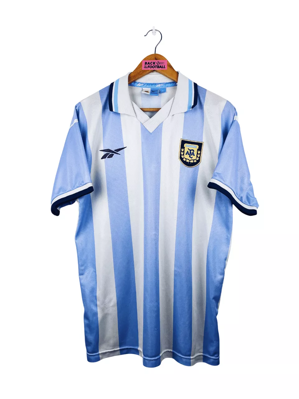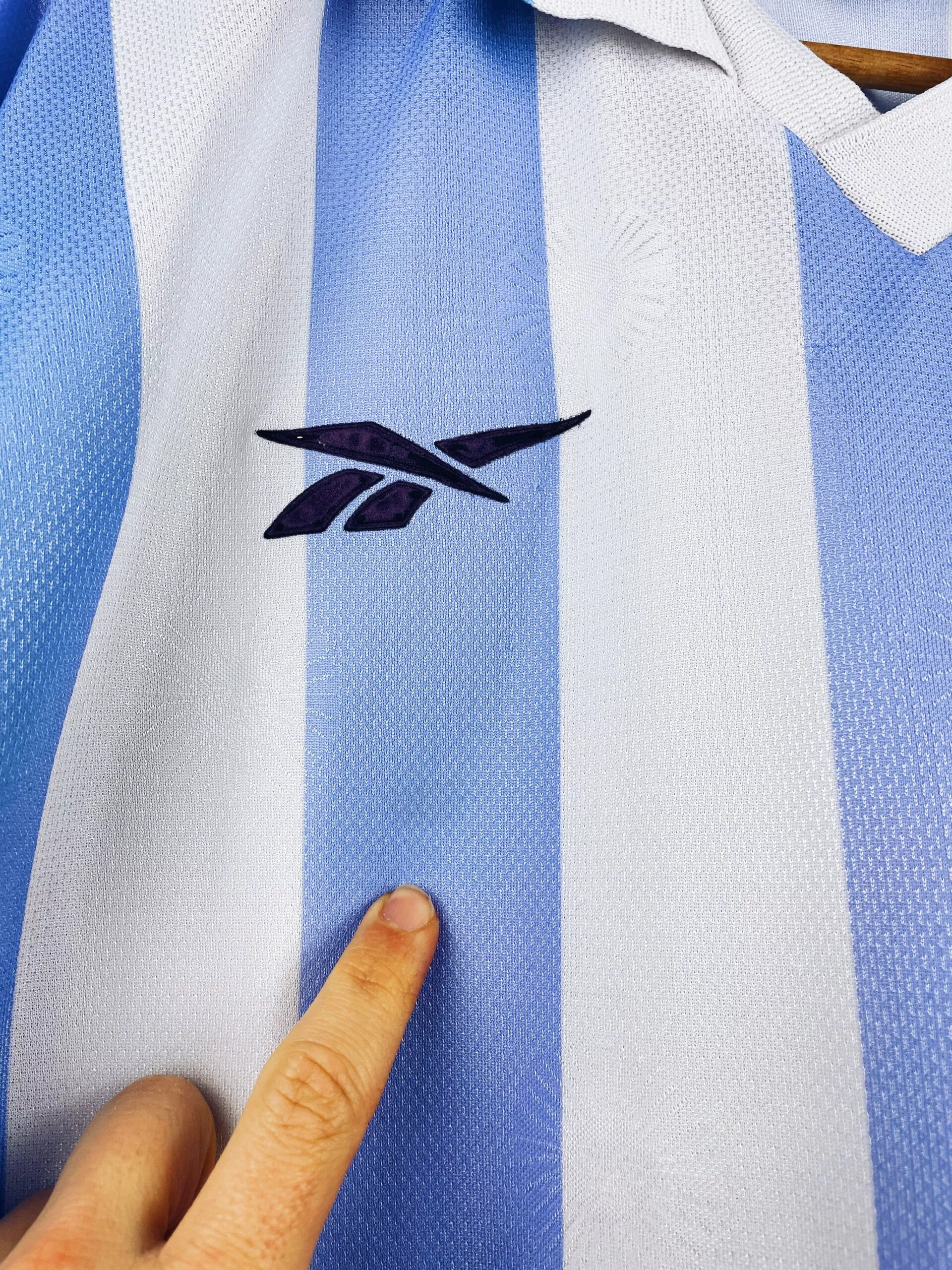 Taille : M Si tu veux plus d’infos, tu peux nous contacter par mail ou sur les réseaux 😉 Etat : 7.5/10, très bon état mais à noter quelques bouloches et micros traces (voir photos) Le maillot : maillot vintage domicile Argentine 1999/2000. L’écusson et le logo Reebok sont brodés. Très beau maillot rétro de l’Argentine ! Histoire : les argentins terminent deuxièmes de leur groupe lors de la Copa America 99. Ils tomben ensuite en quart contre le Brésil et seront éliminés, 2 buts à 1. Quelques joueurs : Palermo, Riquelme, Ortega, Zanetti, Simeone, Pocchettino…