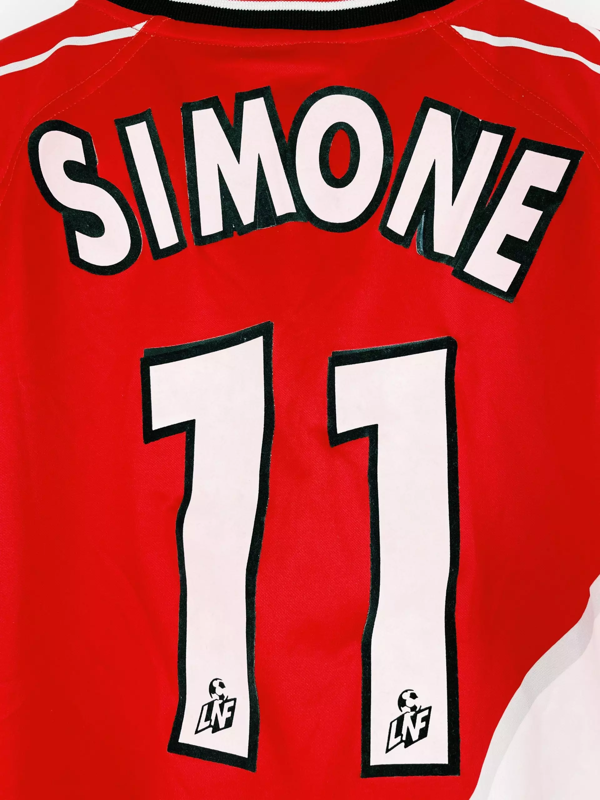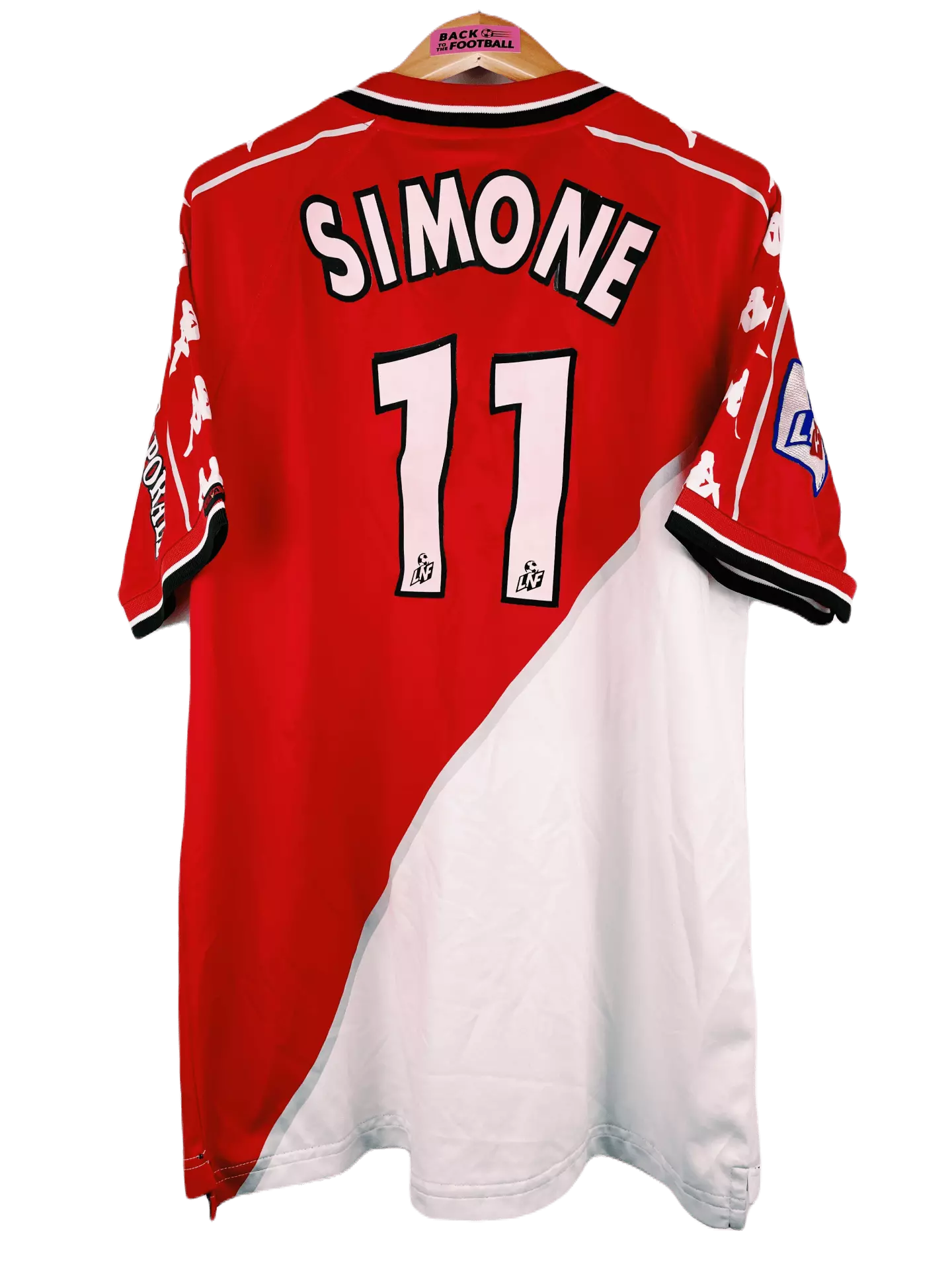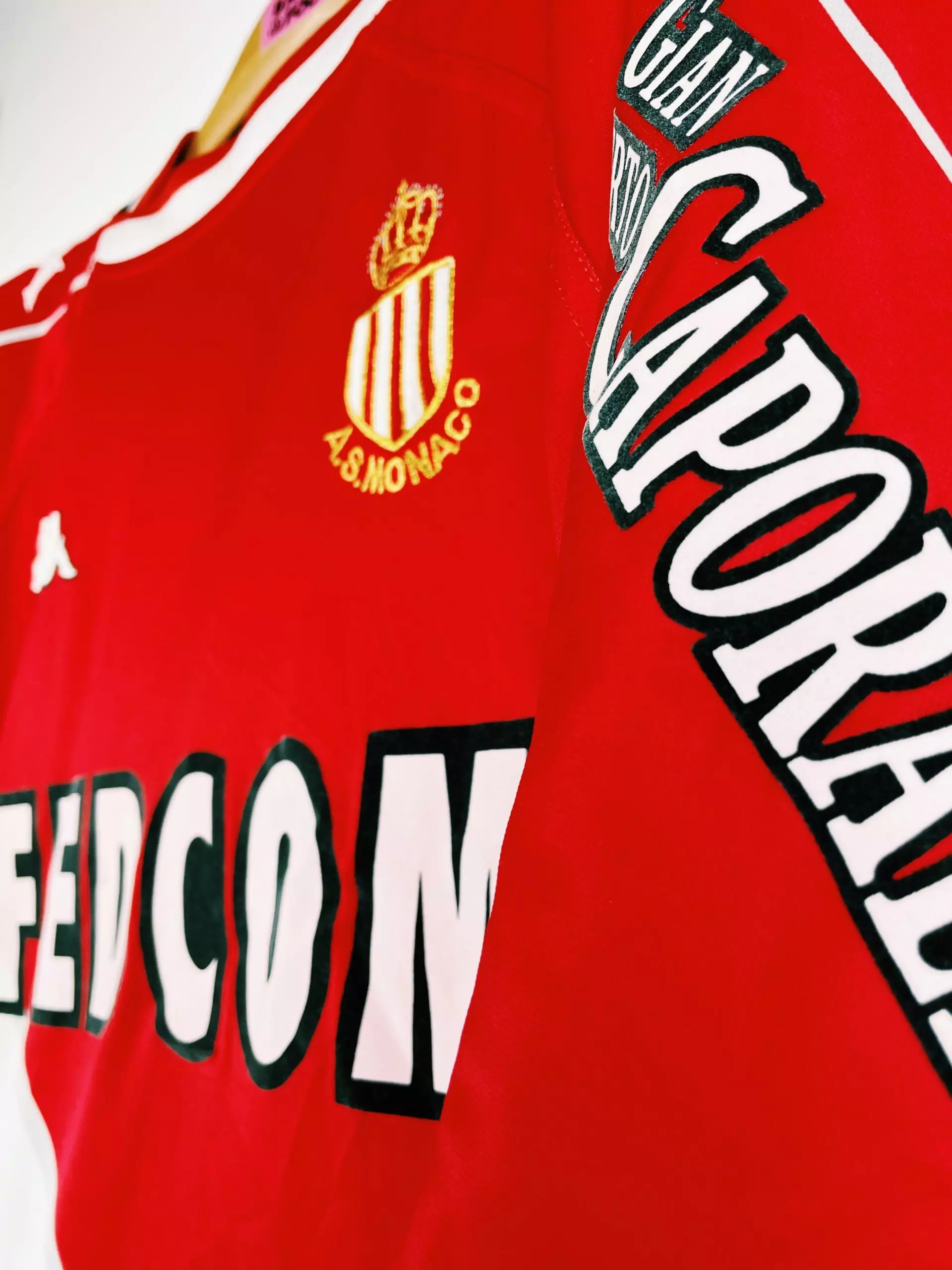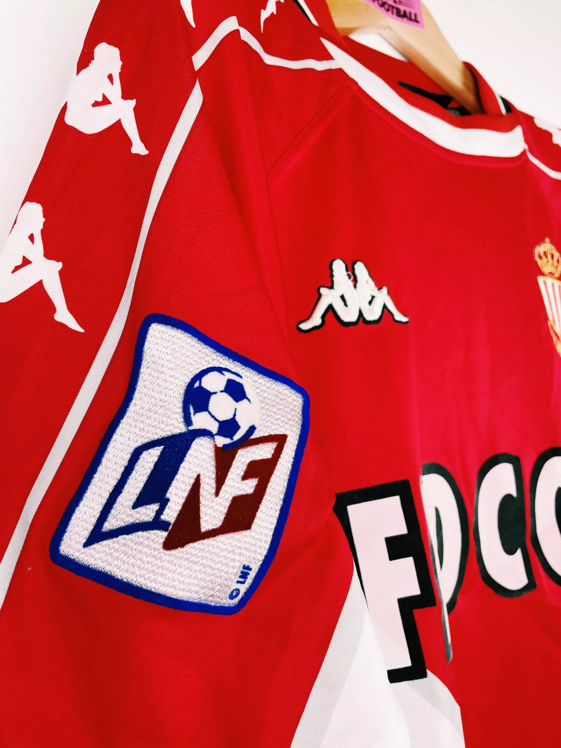 Taille : XL Etat : très bon état général, hormis un fil décousu sur 2cm sur le devant. Le flocage est mal réalisé par endroit (les lettres M, N et E sont mal découpées) Le maillot : maillot vintage domicile Kappa de l’AS Monaco, saison 1999/2000, floqué Simone #11. Le maillot reprend les couleurs classiques du club avec le duo rouge et blanc. L’écusson et le logo sont brodés. Le patch LNF, le sponsor et le flocage sont en feutrine. Les manches Kappa sont magnifiques ! Histoire : magnifique saison pour les Monégasques qui gagneront le titre en Ligue 1…
