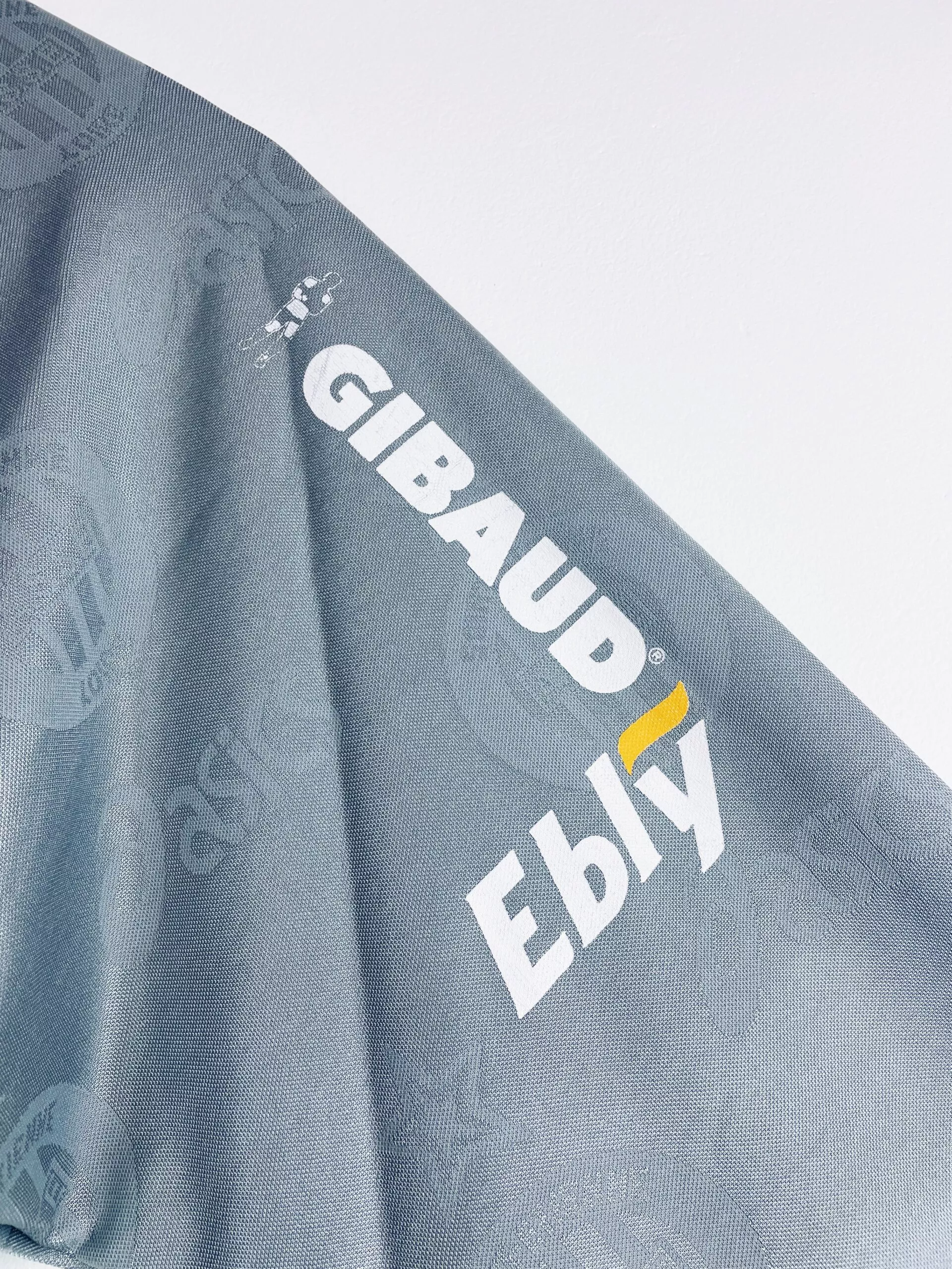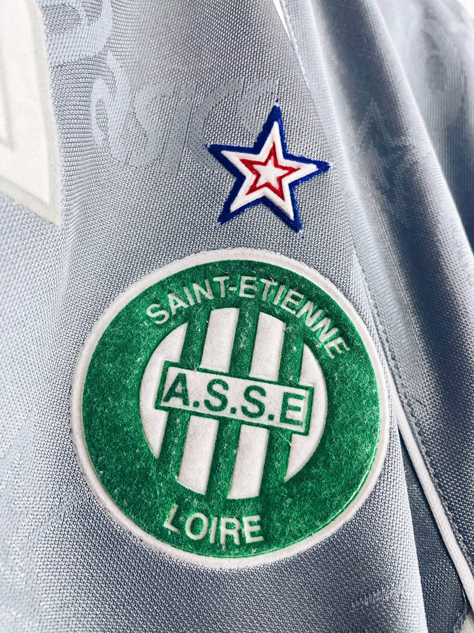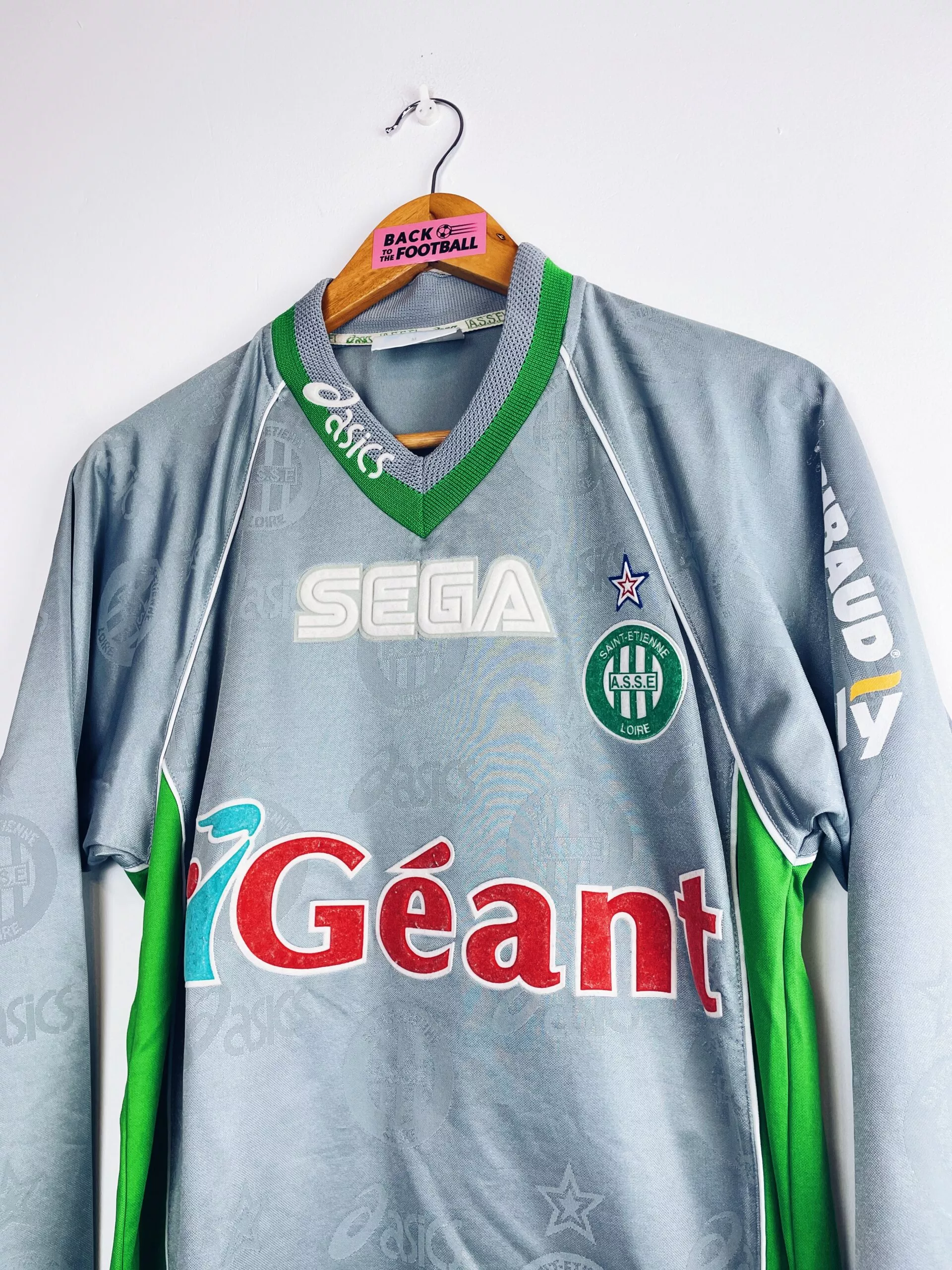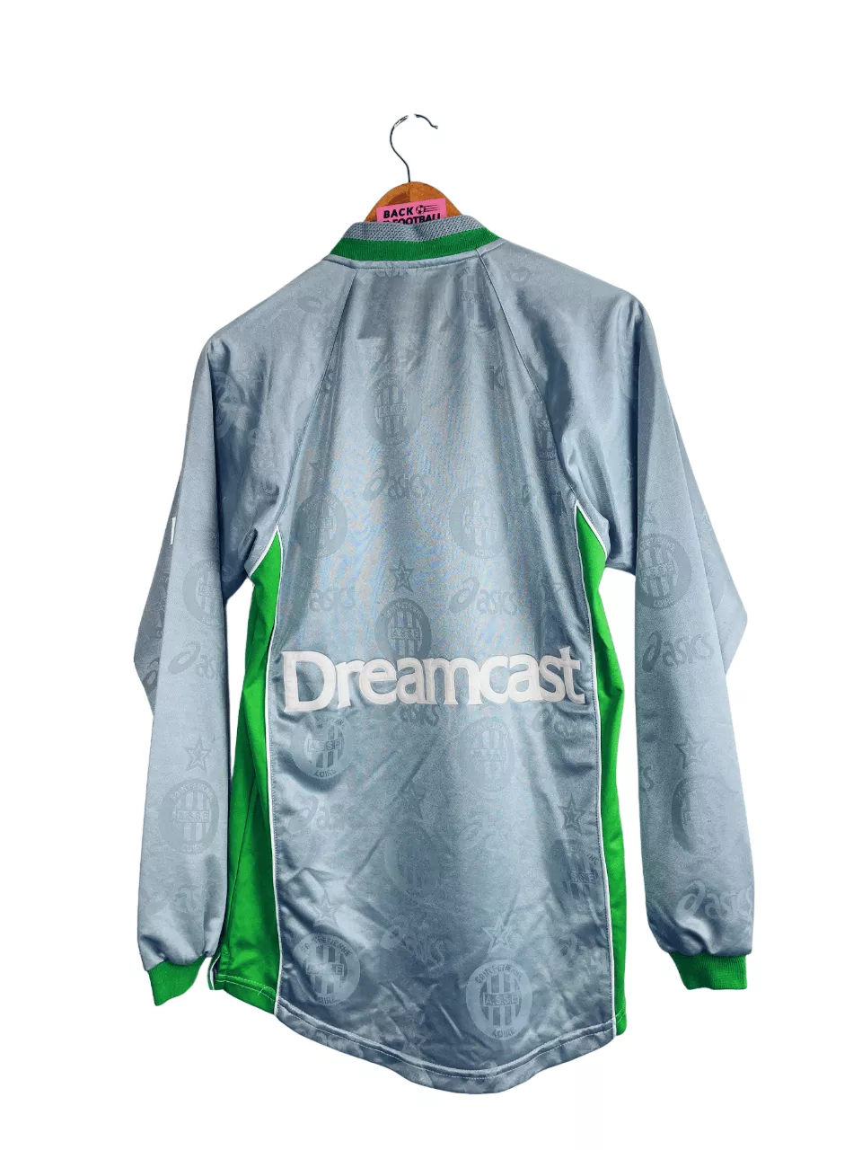Taille : M Si tu veux plus d’infos, tu peux nous contacter par mail ou sur les réseaux 😉 Etat : 8/10, excellent état, quelques bouloches Le maillot : maillot vintage extérieur de l’AS Saint-Etienne 1999/2000 en manches longues. L’écusson, le logo Asics et les sponsors Géant et Sega sont en feutrine. Le sponsor Dreamcast au dos est aussi en feutrine. On peut voir l’écusson et le logo Asics en tramé sur tout le maillot. Très beau maillot rétro de Saint-Etienne ! Histoire : l’ASSE est de retour en Division 1 cette saison. Et beau retour puisque les Verts termineront…