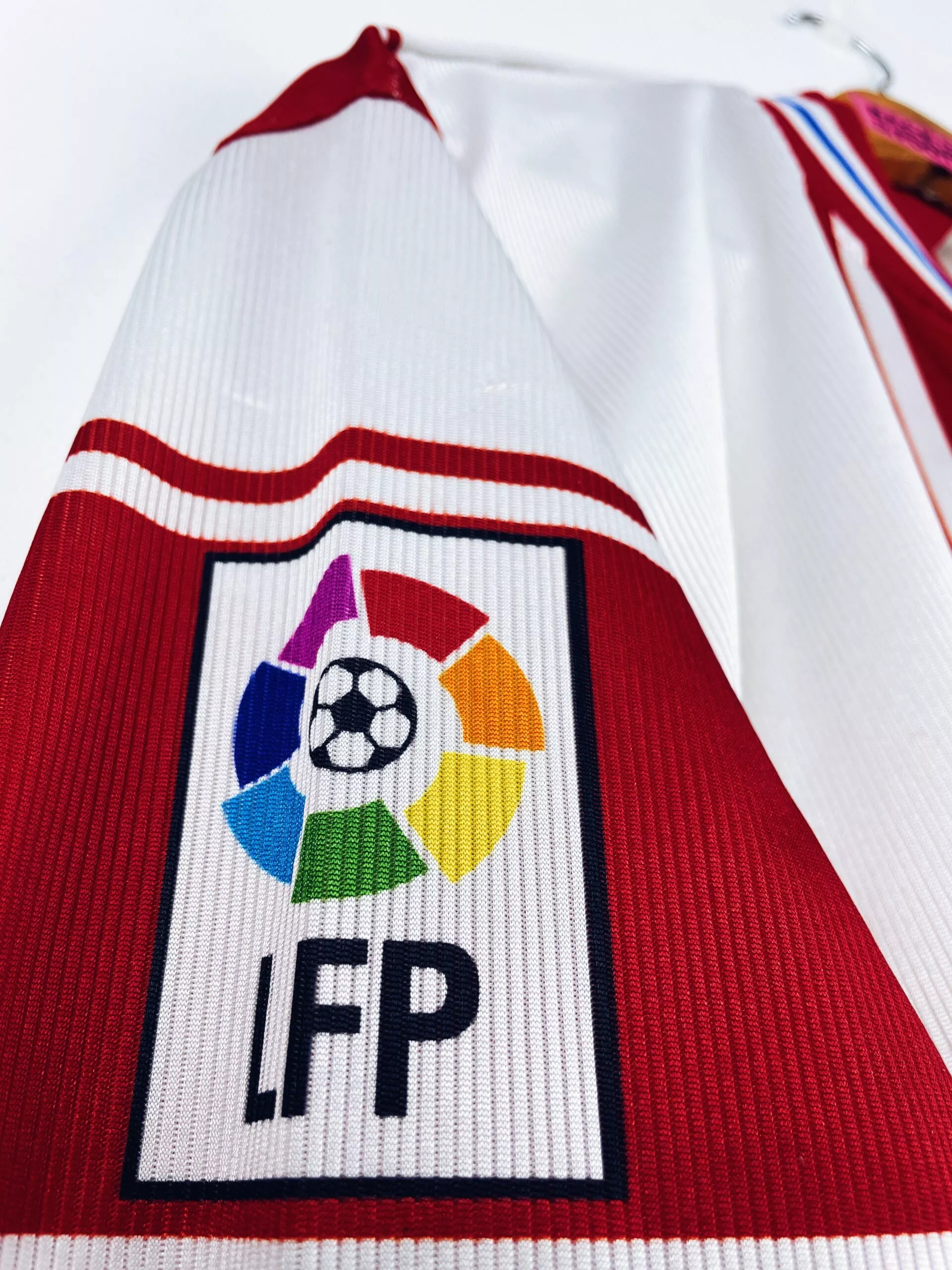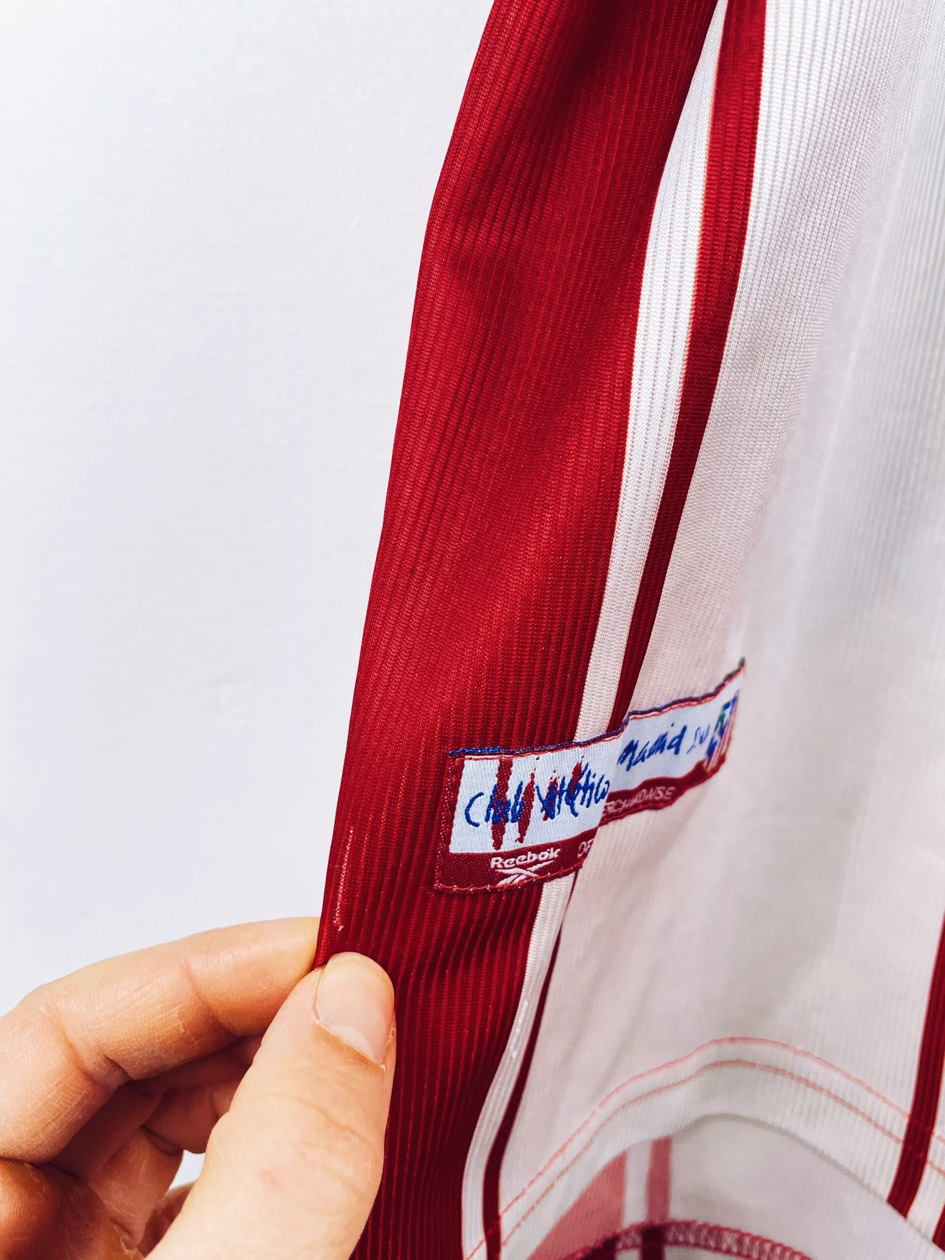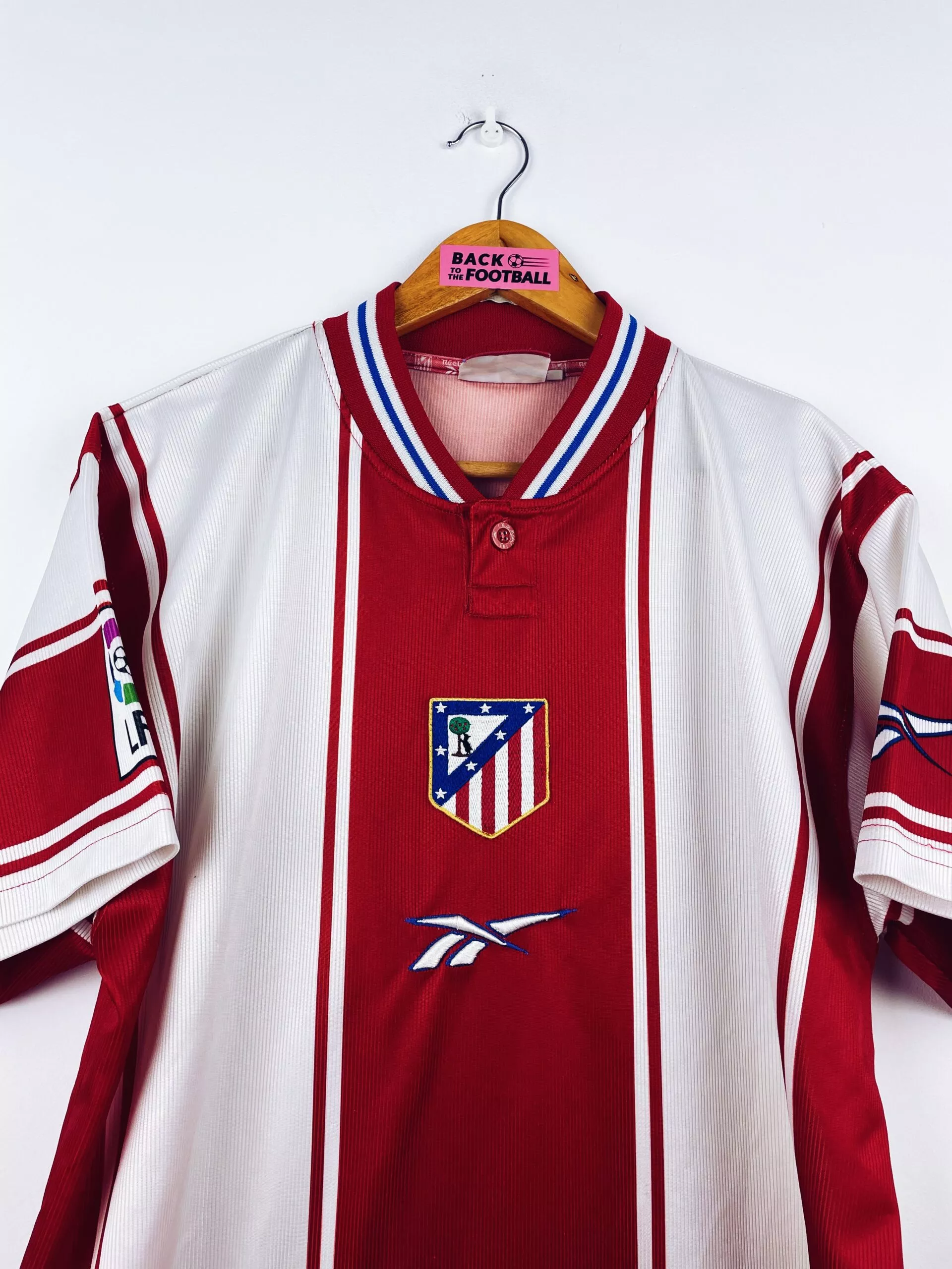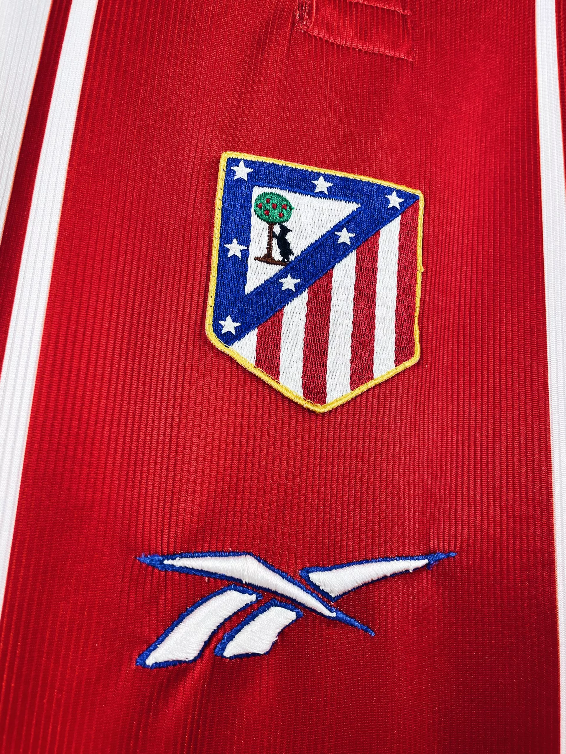 Taille : M Si tu veux plus de détails, tu peux nous contacter par mail ou sur les réseaux 😉 Etat : 8/10, très bon état hormis un fil tiré en haut du dos (voir photo) Le maillot : maillot vintage domicile de l’Atlético Madrid 1999/2000. L’écusson et le logo Reebok sont brodés. Pas de sponsor sur cette version. Très beau maillot rétro de l’Atlético ! Histoire : très mauvaise saison des Colchoneros avec une 19ème place en Liga, synonyme de descente… Ils iront pourtant en finale de Coupe du Roi mais seront battus 2-1 par l’Espanyol. En Coupe UEFA,…