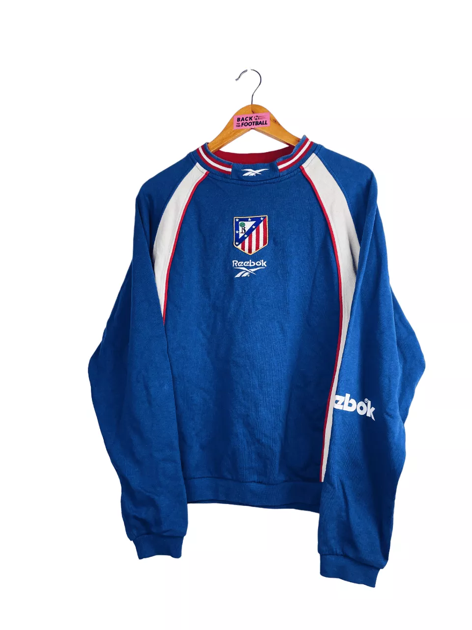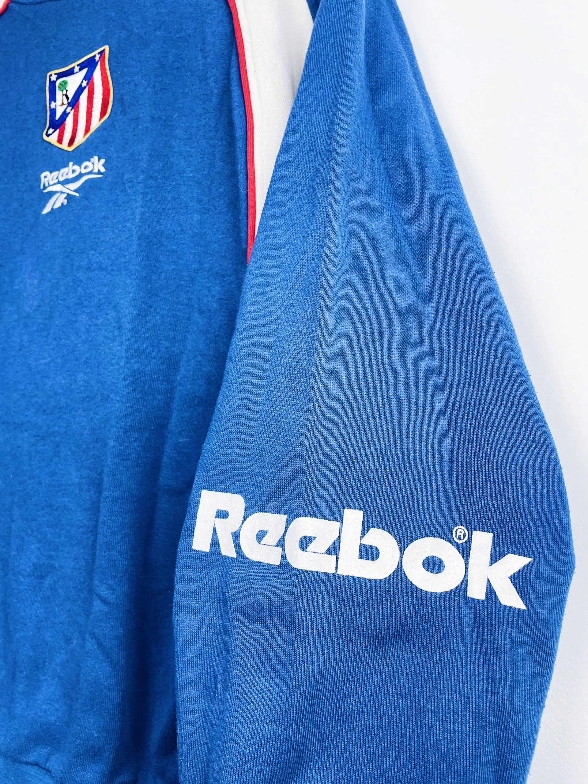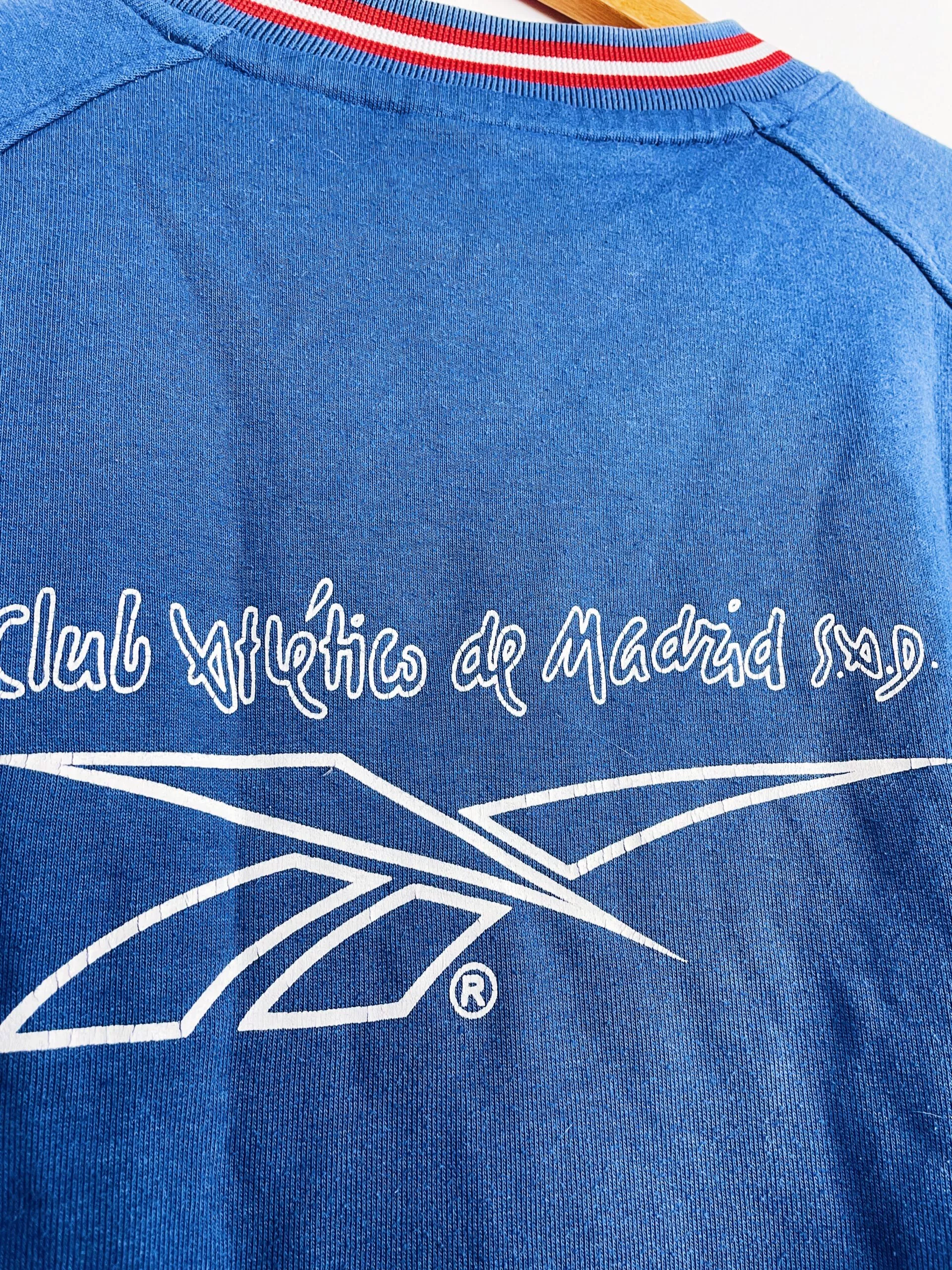 Taille : M Si tu veux plus de détails, tu peux nous contacter par mail ou sur les réseaux 😉 Etat : 7.5/10, très bon état général mais le flocage au dos est légèrement craquelé, des bouloches (voir photo) Le sweat : sweatshirt vintage de l’Atlético Madrid 1999/2000. L’écusson et le logo Reebok sont brodés. Sur la manche et dans le dos, les éléments sont floqués. Très beau sweat rétro de l’Atlético Madrid ! Histoire : très mauvaise saison des Colchoneros avec une 19ème place en Liga, synonyme de descente… Ils iront pourtant en finale de Coupe du Roi mais…
