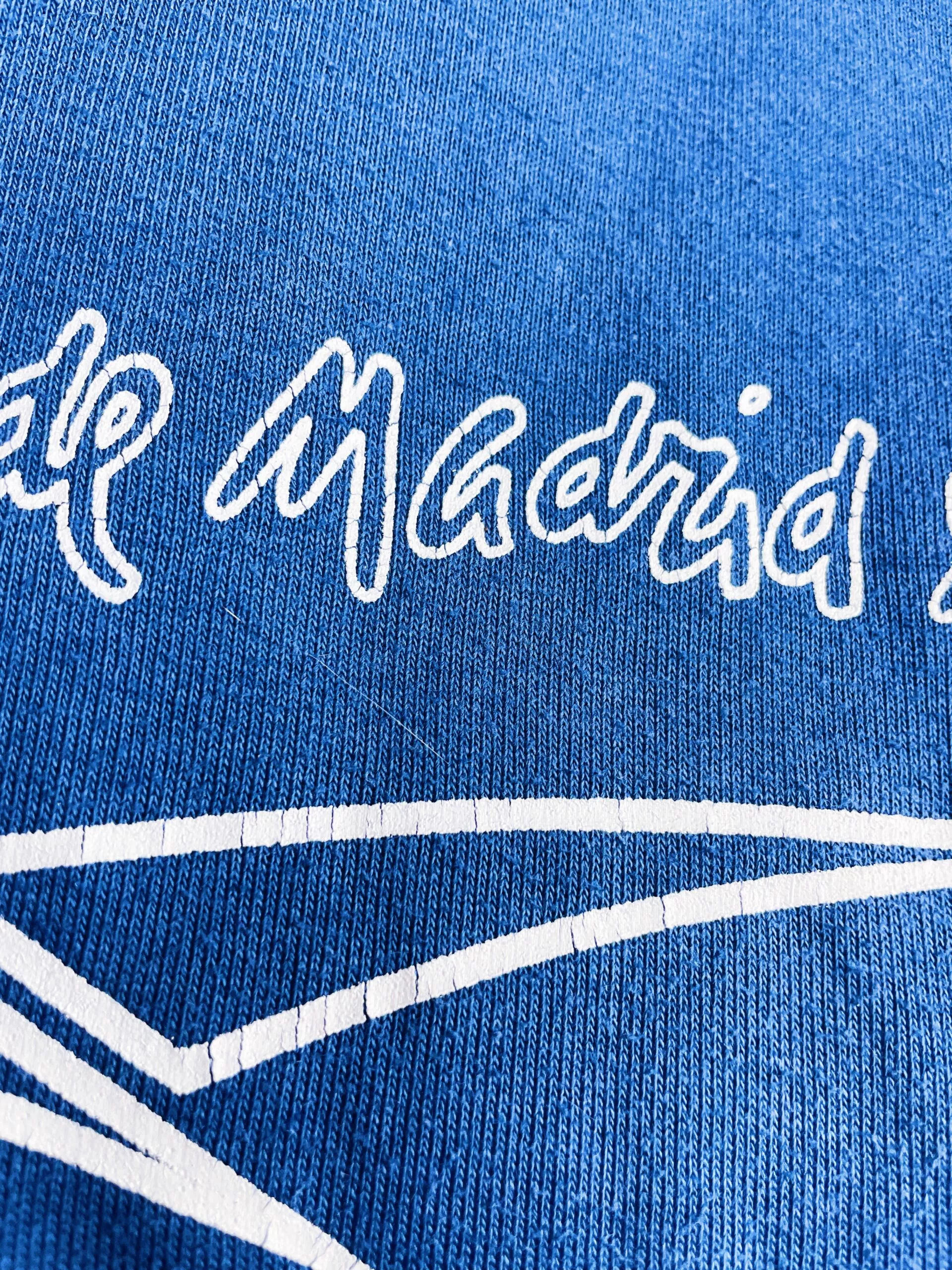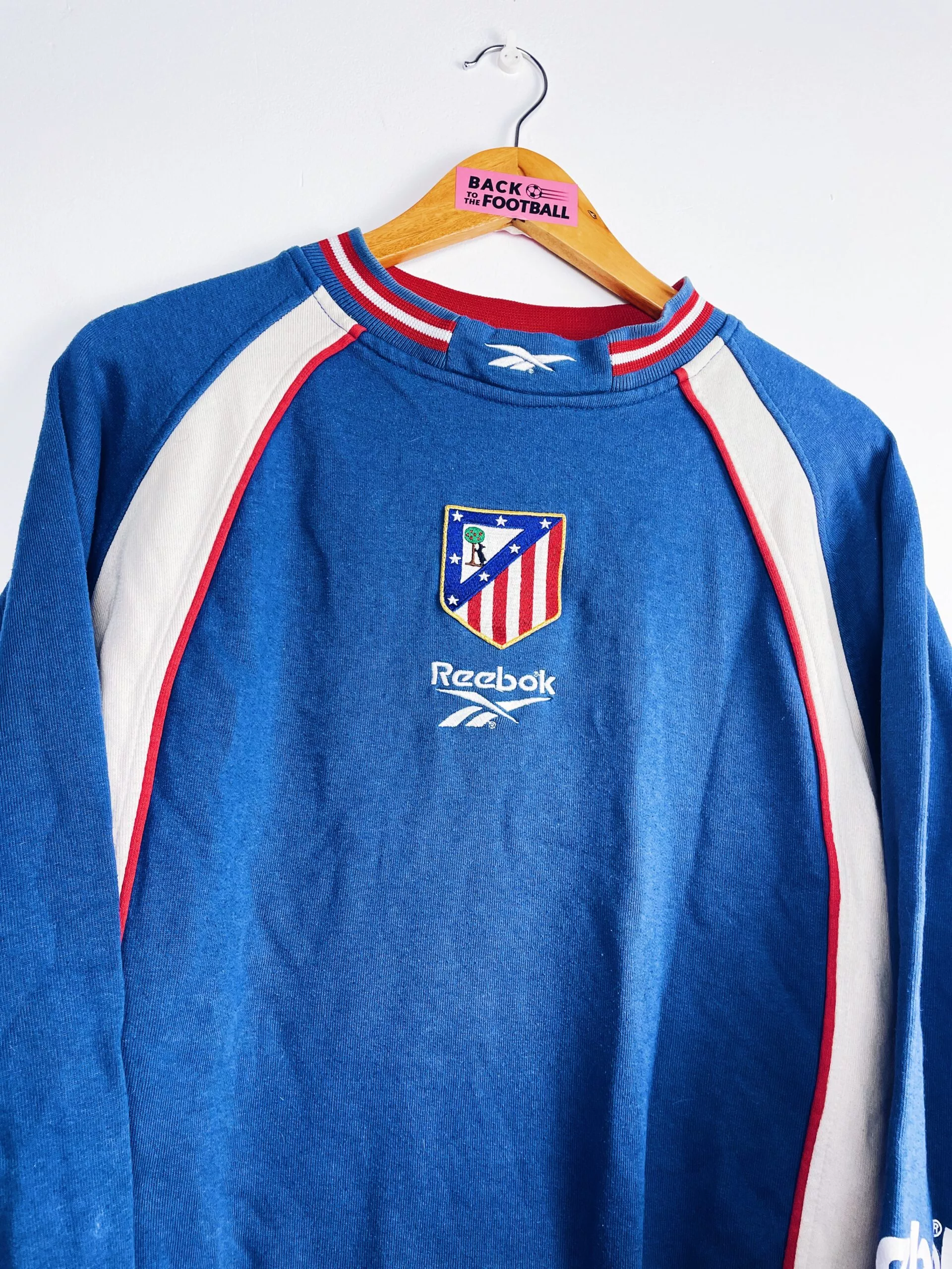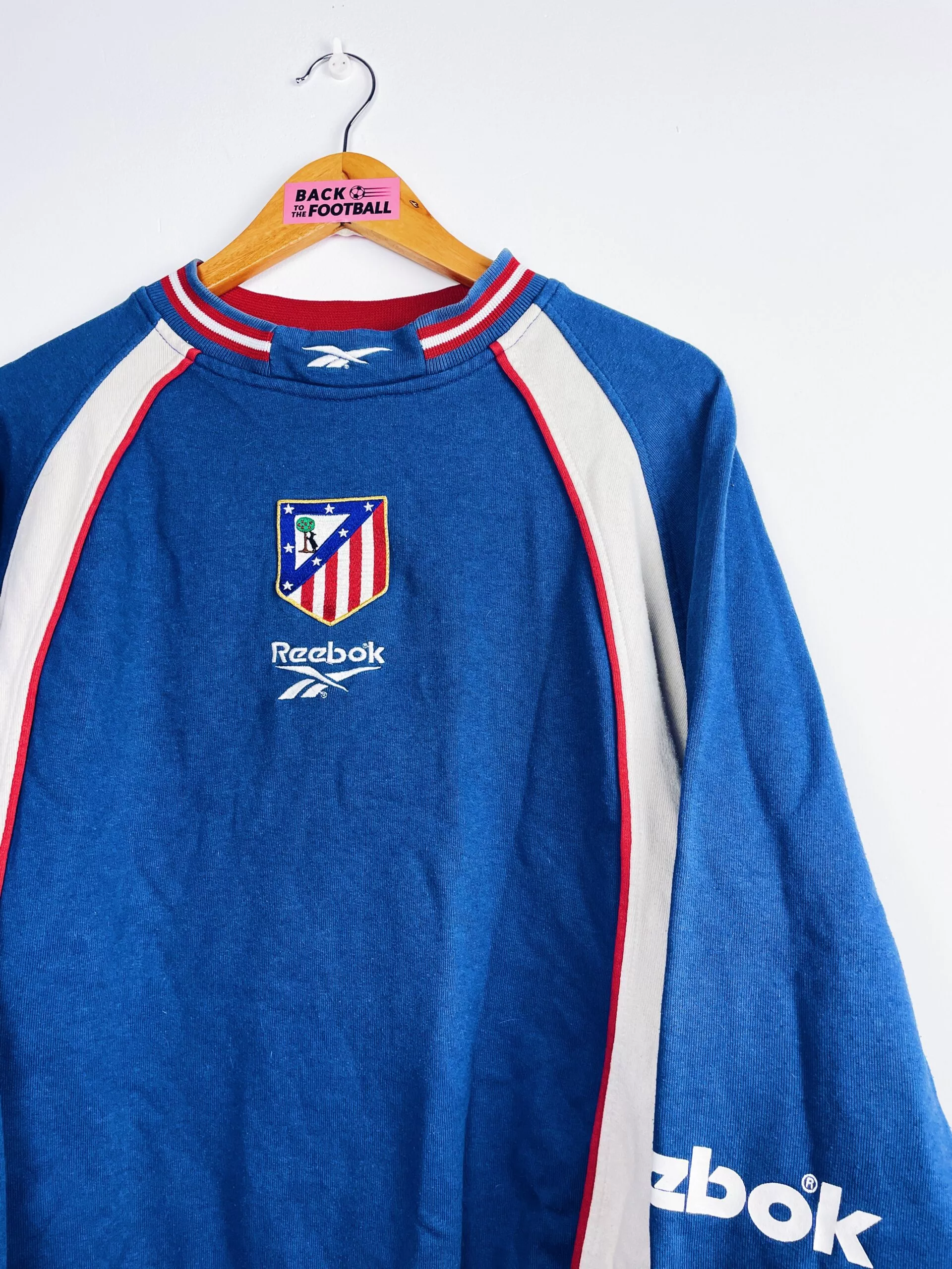 Taille : M Si tu veux plus de détails, tu peux nous contacter par mail ou sur les réseaux 😉 Etat : 7.5/10, très bon état général mais le flocage au dos est légèrement craquelé, des bouloches (voir photo) Le sweat : sweatshirt vintage de l’Atlético Madrid 1999/2000. L’écusson et le logo Reebok sont brodés. Sur la manche et dans le dos, les éléments sont floqués. Très beau sweat rétro de l’Atlético Madrid ! Histoire : très mauvaise saison des Colchoneros avec une 19ème place en Liga, synonyme de descente… Ils iront pourtant en finale de Coupe du Roi mais…