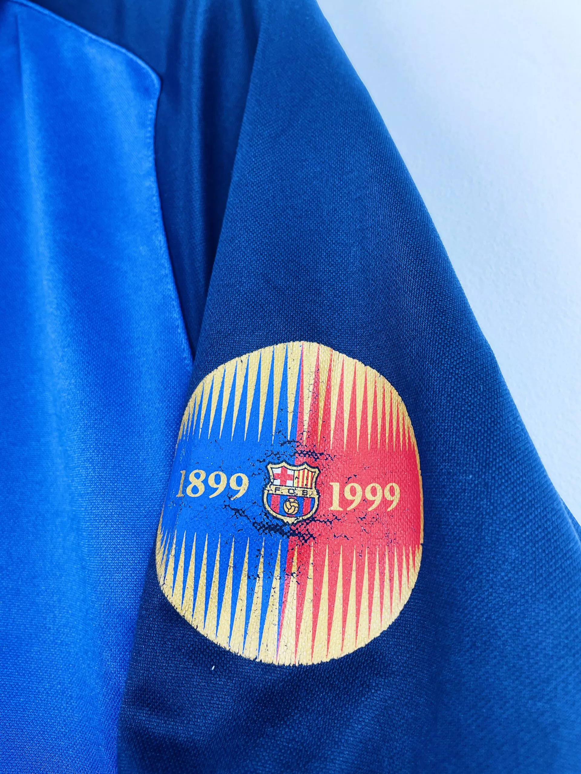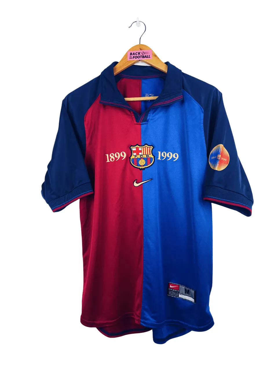 Taille : M Largeur : 52cm (aisselle à aisselle) Longueur : 67cm (base du col au bas) Si tu veux plus d’infos, tu peux nous contacter par mail ou sur les réseaux 😉 Etat : 8/10, très bon état hormis le flocage sur la manche (voir photo) Le maillot : maillot vintage domicile du FC Barcelone 1999/2000 spécial centenaire. L’écusson et le logo Nike sont brodés, le patch sur la manche est floqué. Très beau maillot rétro de Barcelone ! Histoire : saison frustrante pour les Blaugranas avec une 2ème place en Liga, une demi-finale en Ligue des Champions et…