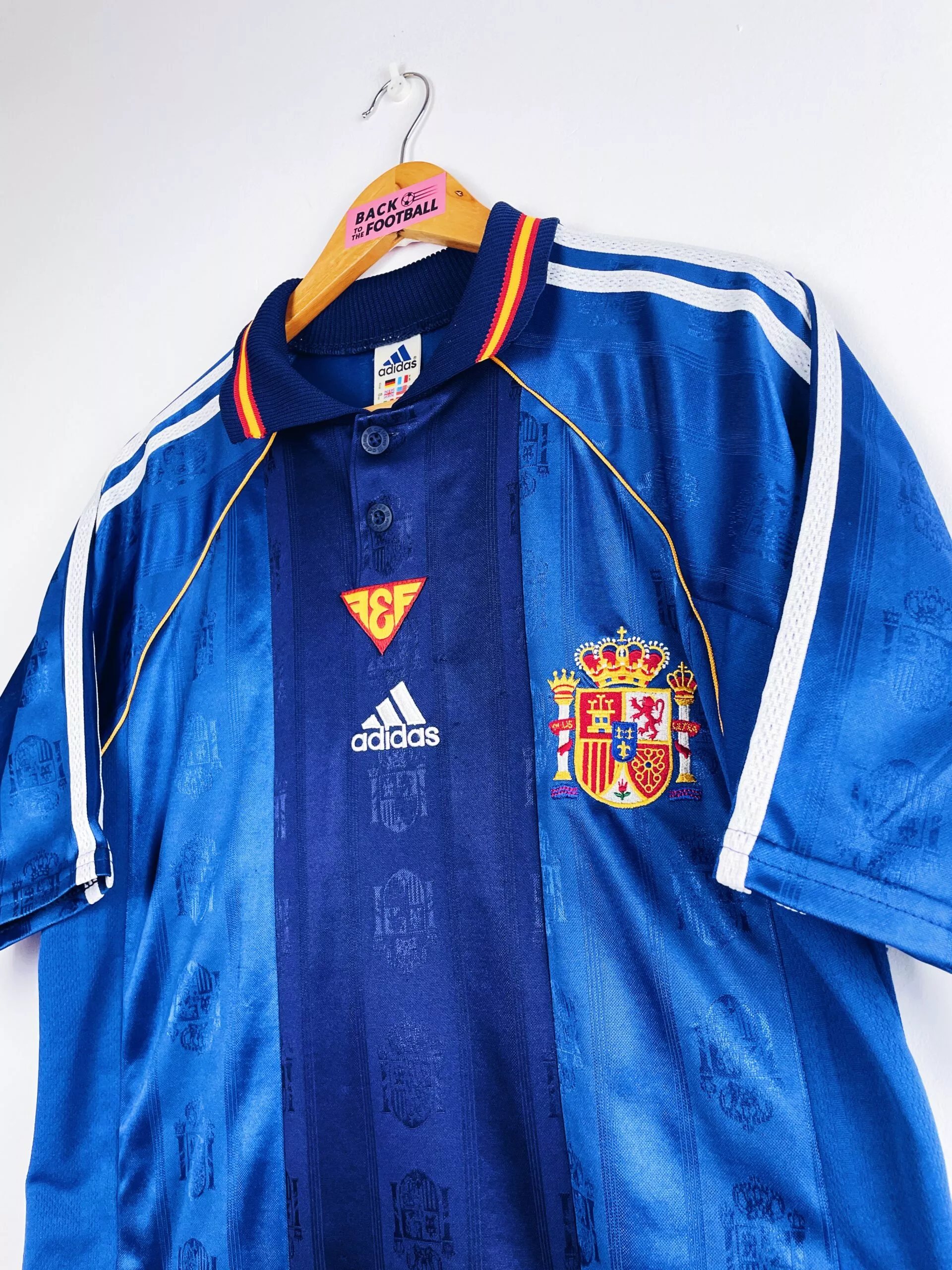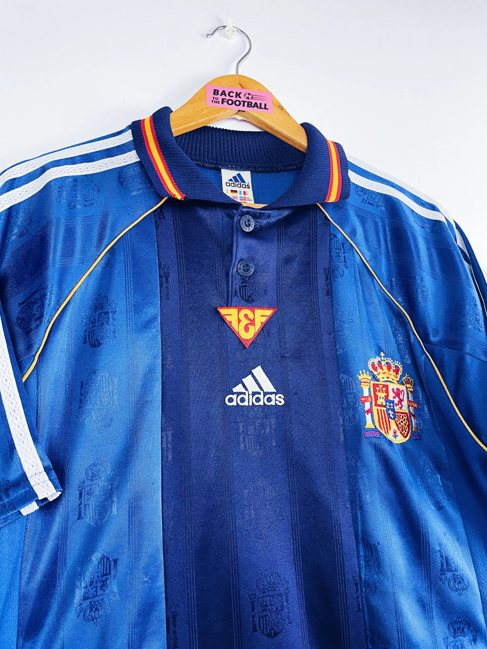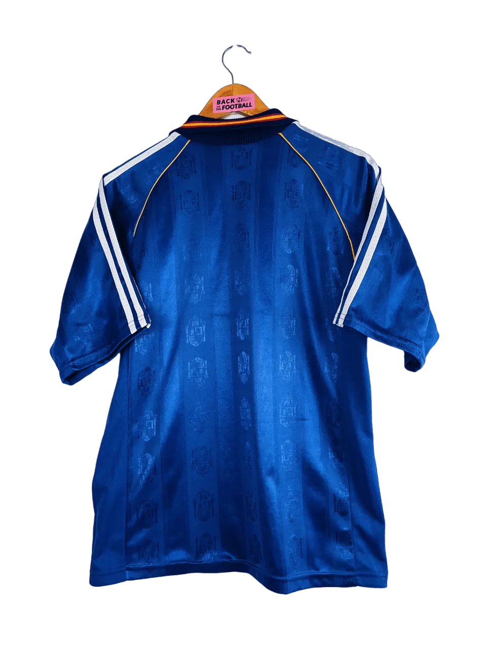 Taille : S Etat : 8/10, excellent état, quelques légères bouloches Le maillot : maillot vintage extérieur de l’Espagne 1999/2000, utilisé pour les qualifications à l’Euro 2000. L’écusson et le logo Adidas sont brodés. On peut voir l’écusson en tramé sur tout le maillot. Très beau maillot rétro de l’Espagne ! Histoire : la Roja négocie parfaitement sa phase de qualification pour l’Euro 2000, avec une première place dans un groupe plutôt facile, devant Israël, l’Autriche, Chypre et Saint-Marin. Les espagnols gagneront 7 matchs pour une seule défaite. Ils marqueront 42 buts ! Quelques joueurs : Raul, Morientes, Guardiola, Hierro,…
