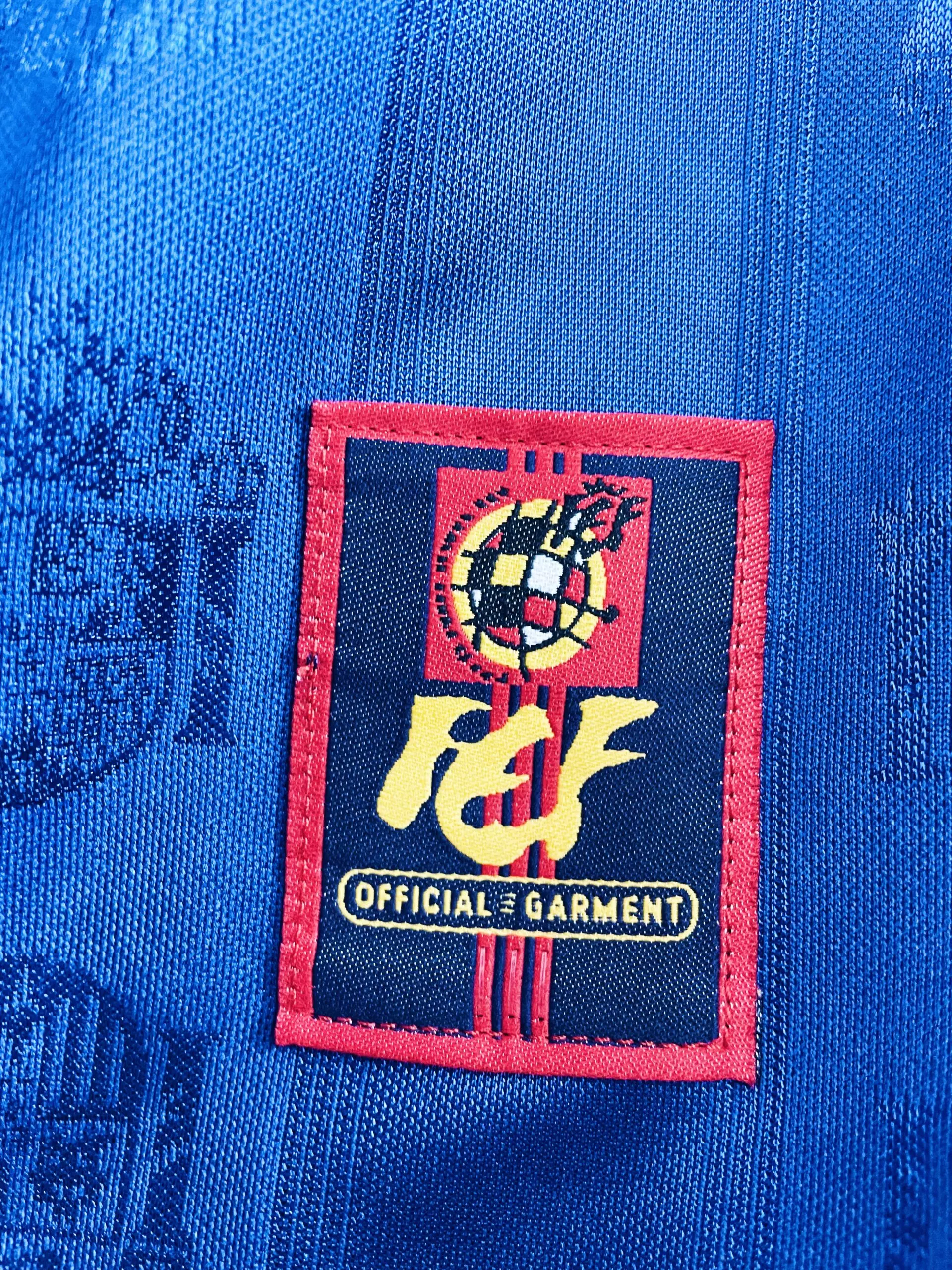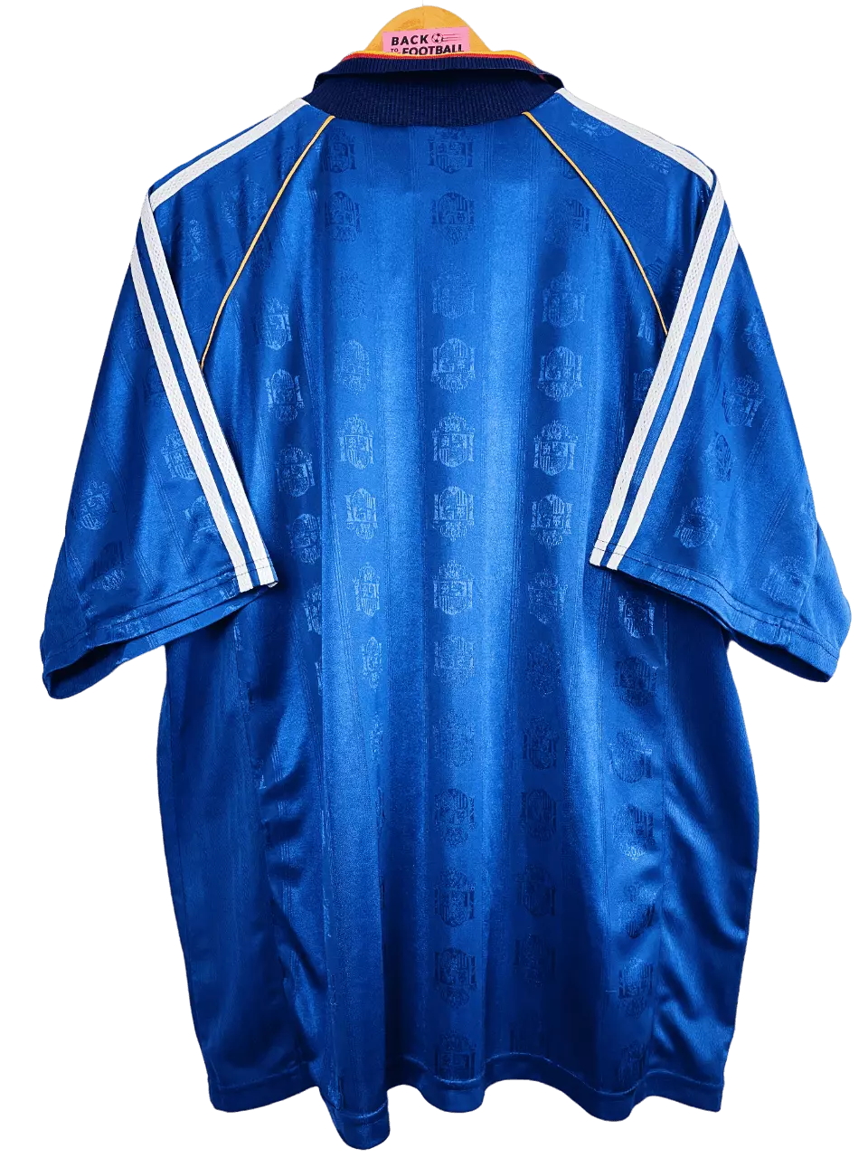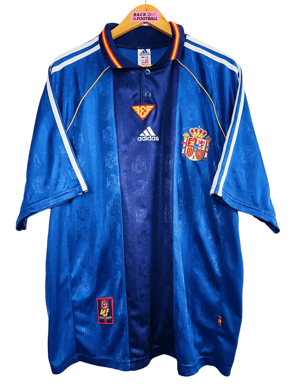 Taille : XL Etat : 8/10, très bon Ă©tat Le maillot : maillot vintage extĂ©rieur de l’Espagne 1999/2000, utilisĂ© pour les qualifications Ă l’Euro 2000. L’Ă©cusson et le logo Adidas sont brodĂ©s. On peut voir l’Ă©cusson en tramĂ© sur tout le maillot. Très beau maillot rĂ©tro de l’Espagne ! Histoire : la Roja nĂ©gocie parfaitement sa phase de qualification pour l’Euro 2000, avec une première place dans un groupe plutĂ´t facile, devant IsraĂ«l, l’Autriche, Chypre et Saint-Marin. Les espagnols gagneront 7 matchs pour une seule dĂ©faite. Ils marqueront 42 buts ! Quelques joueurs : Raul, Morientes, Guardiola, Hierro, Sergi…