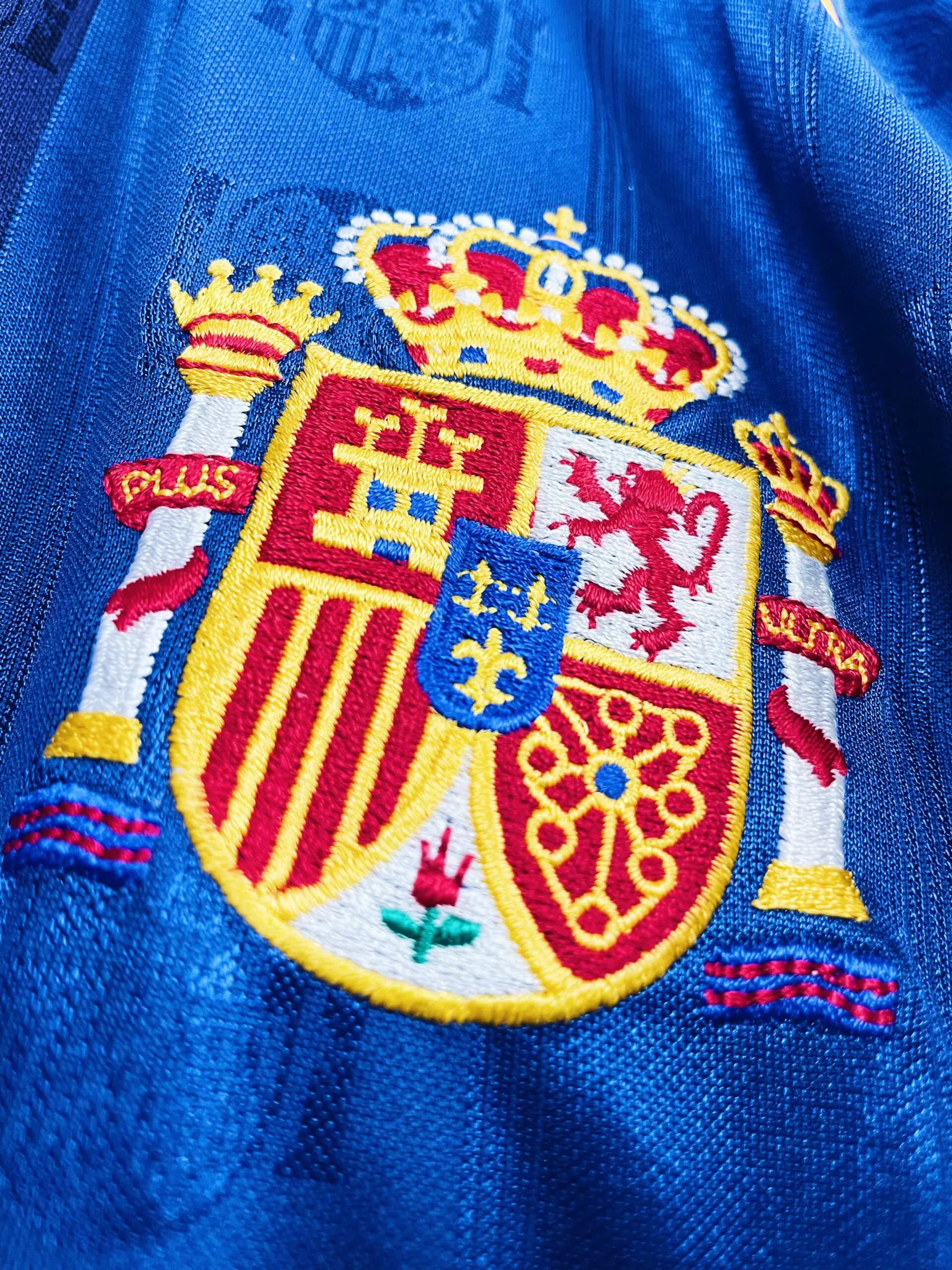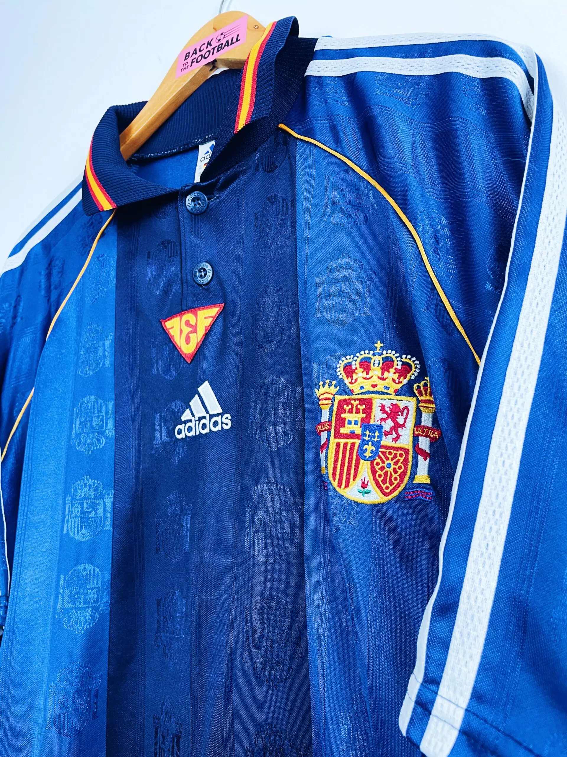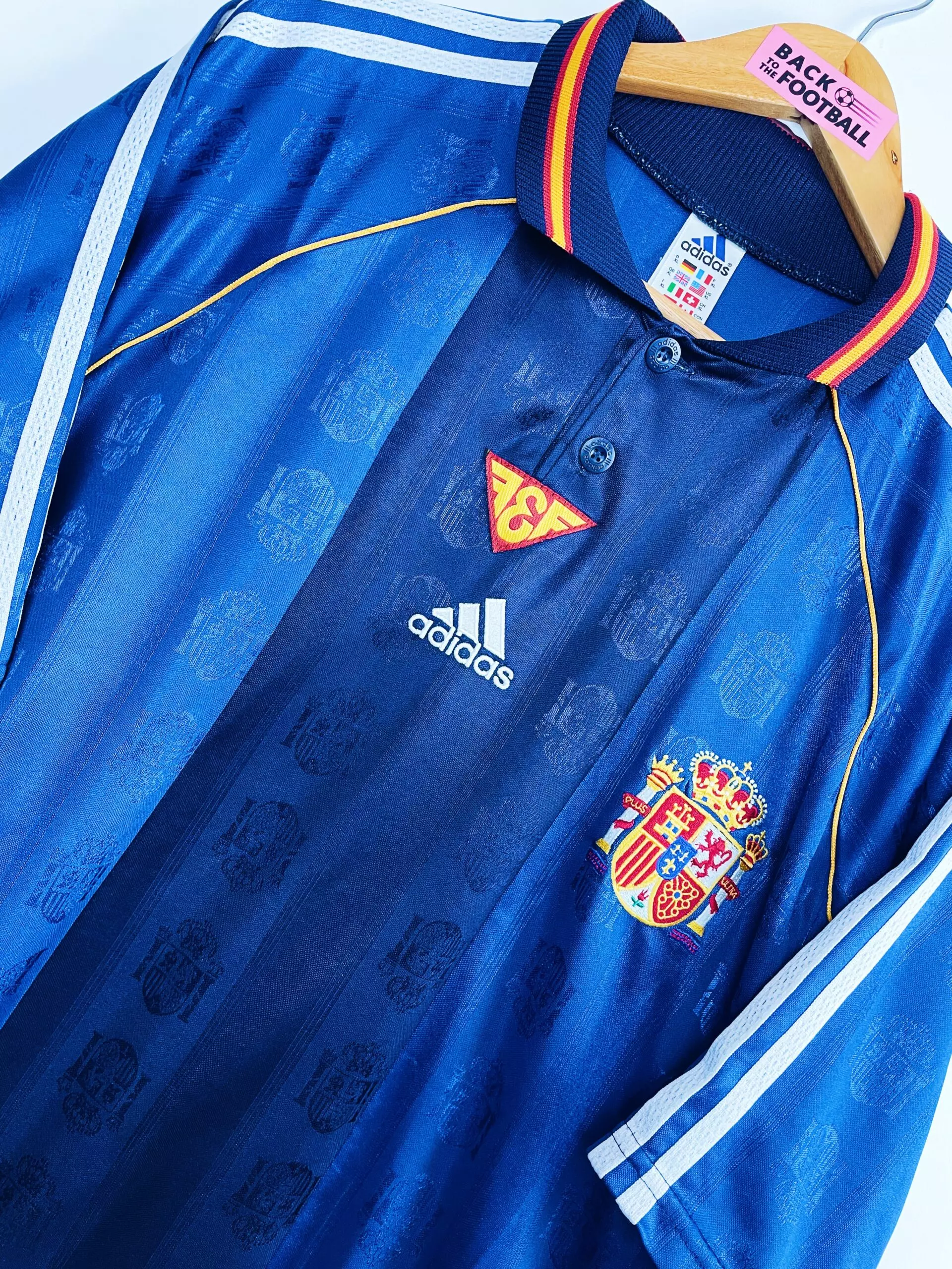 Taille : XL Etat : 8/10, très bon Ă©tat Le maillot : maillot vintage extĂ©rieur de l’Espagne 1999/2000, utilisĂ© pour les qualifications Ă l’Euro 2000. L’Ă©cusson et le logo Adidas sont brodĂ©s. On peut voir l’Ă©cusson en tramĂ© sur tout le maillot. Très beau maillot rĂ©tro de l’Espagne ! Histoire : la Roja nĂ©gocie parfaitement sa phase de qualification pour l’Euro 2000, avec une première place dans un groupe plutĂ´t facile, devant IsraĂ«l, l’Autriche, Chypre et Saint-Marin. Les espagnols gagneront 7 matchs pour une seule dĂ©faite. Ils marqueront 42 buts ! Quelques joueurs : Raul, Morientes, Guardiola, Hierro, Sergi…