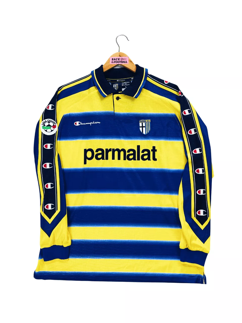 Taille : L Largeur : 57cm (aisselle à aisselle) Longueur : 74cm (base du col au bas) Si tu veux plus de détails, tu peux nous contacter par mail ou sur les réseaux 😉 Etat : 9/10, excellent état Le maillot : maillot vintage domicile de Parme 1999/2000 préparé pour le numéro 20 : manches longues, patch Serie A, numéro 20 floqué. L’écusson est brodé, le logo Champion est en feutrine, le sponsor Parmalat est incrusté. Très beau maillot rétro de Parma ! Histoire : encore une belle saison en Serie A pour Parme avec une 5ème place en Serie…