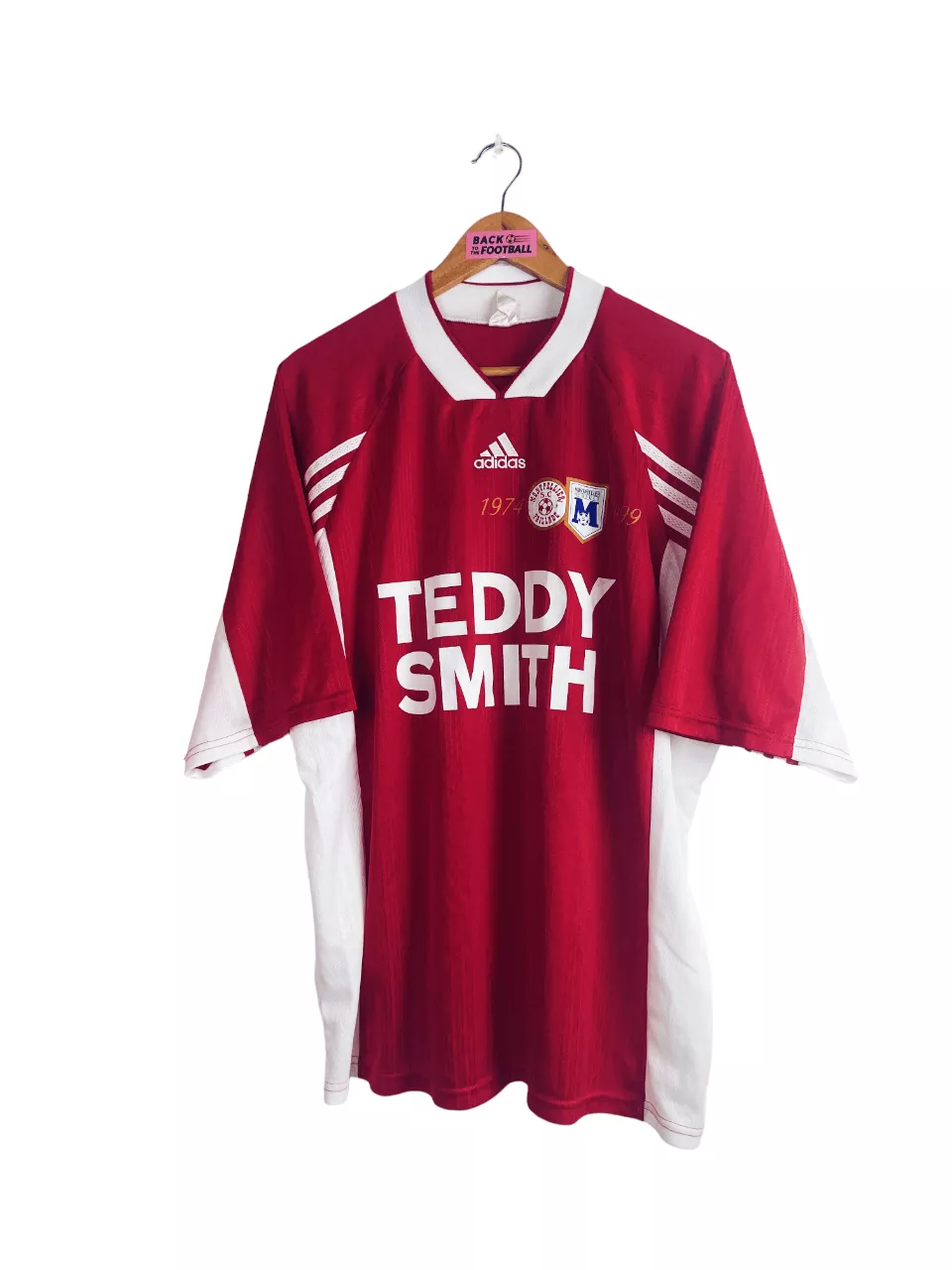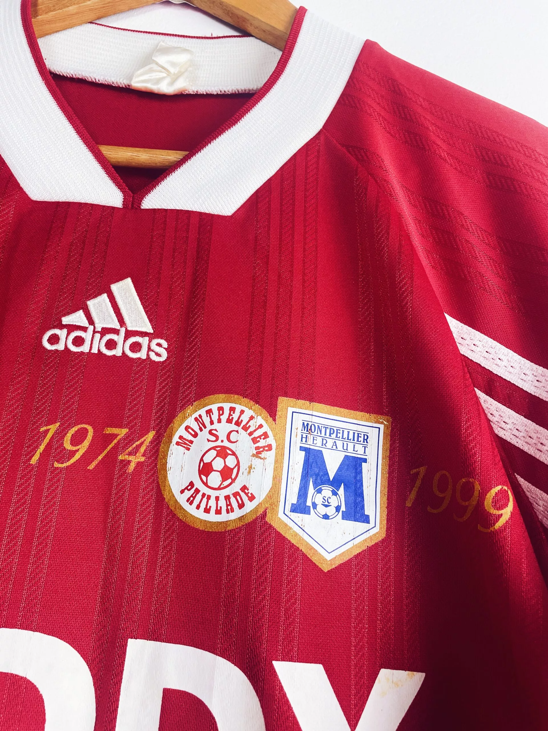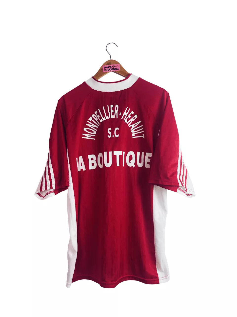 Taille : XL Si tu veux plus de détails, tu peux nous contacter par mail ou sur les réseaux 😉 Etat : 8/10, très bon état général. L’écusson est un peu abimé et il y a des traces sur le flocage dans le dos (voir photos) Le maillot : maillot vintage extérieur de Montpellier 1999/2000. L’écusson est floqué, le logo Adidas brodé, le sponsor est floqué. Au dos le sponsor est floqué aussi. Il doit s’agir d’un maillot de la boutique du club. Très beau maillot rétro du MHSC ! Histoire : très mauvaise saison pour les Pailladins qui terminent…