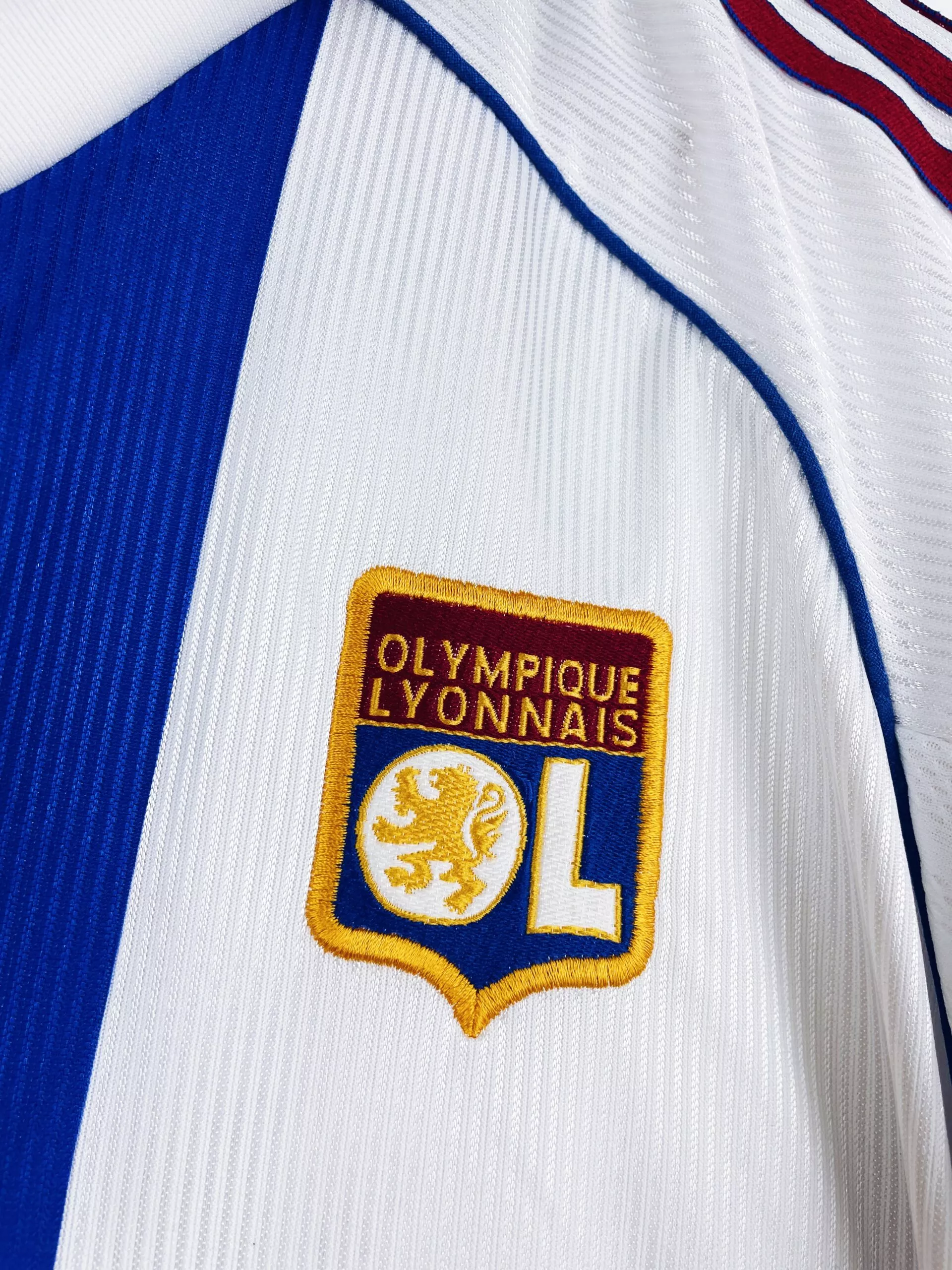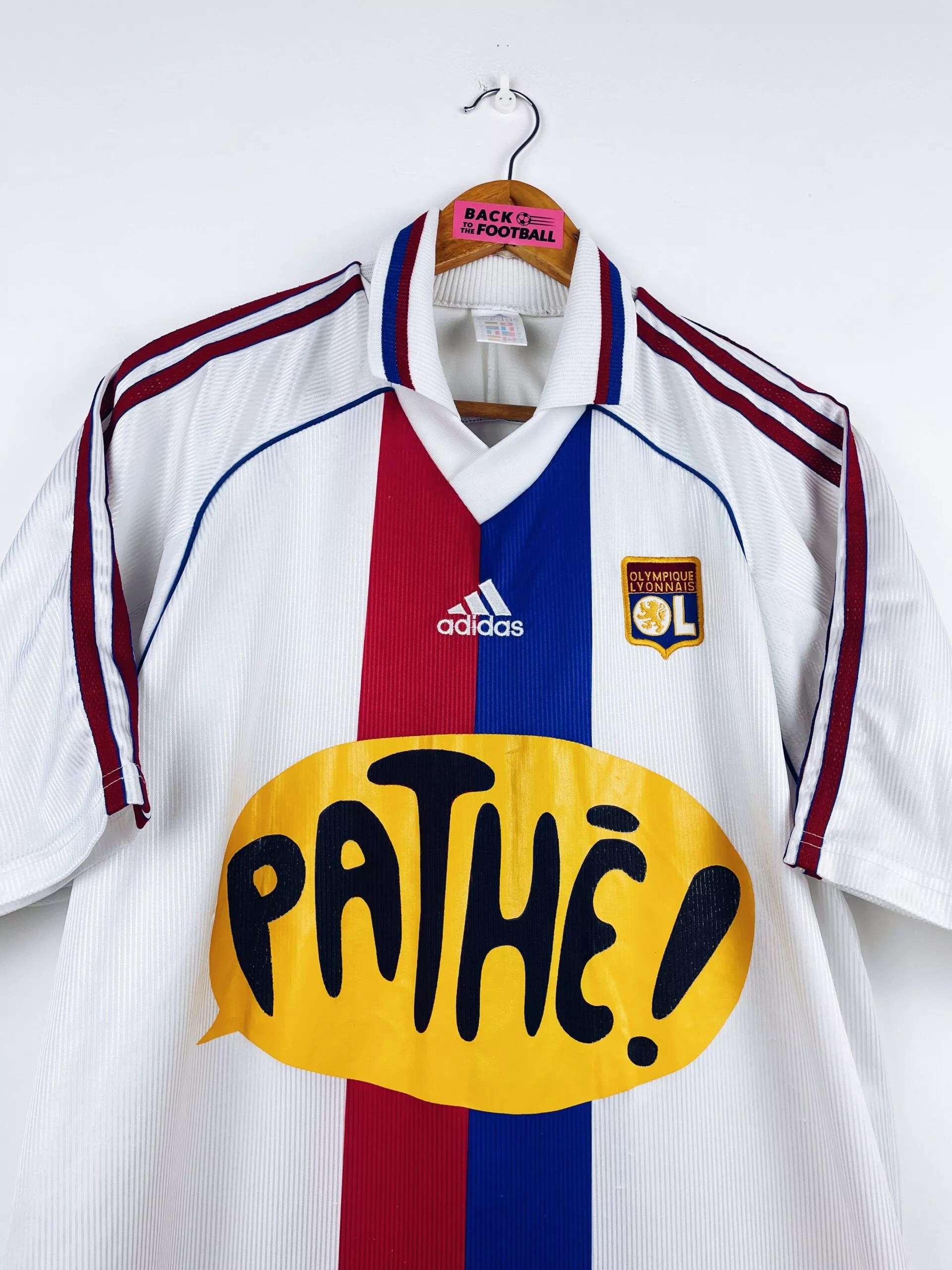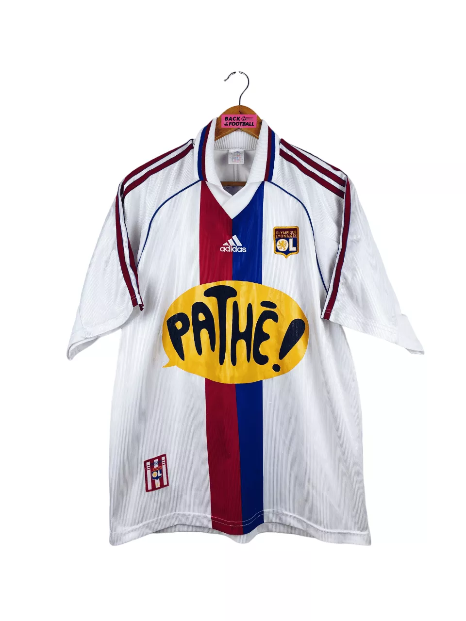 Taille : L Si tu veux plus de détails, tu peux nous contacter par mail ou sur les réseaux 😉 Etat : 7.5/10, très bon état, quelques bouloches, le sponsor Pathé légèrement abimé (voir photos) Le maillot : maillot vintage domicile de l’OL 1999/2000. L’écusson et le logo Adidas sont brodés. Le sponsor Pathé est floqué. Très beau maillot rétro de l’Olympique Lyonnais ! Histoire : belle saison pour l’OL qui termine sur le podium de la ligue 1, derrière Monaco et le PSG. En Coupe de l’UEFA, ils n’iront pas plus loin que le troisième tour après leur défaite…