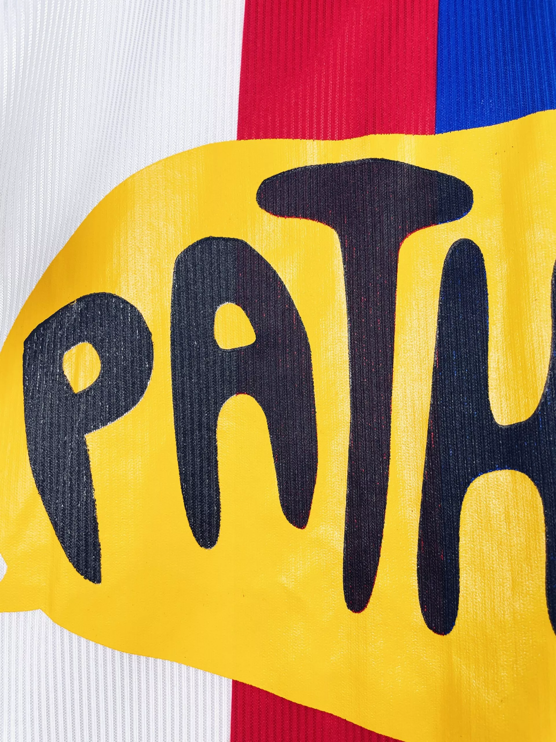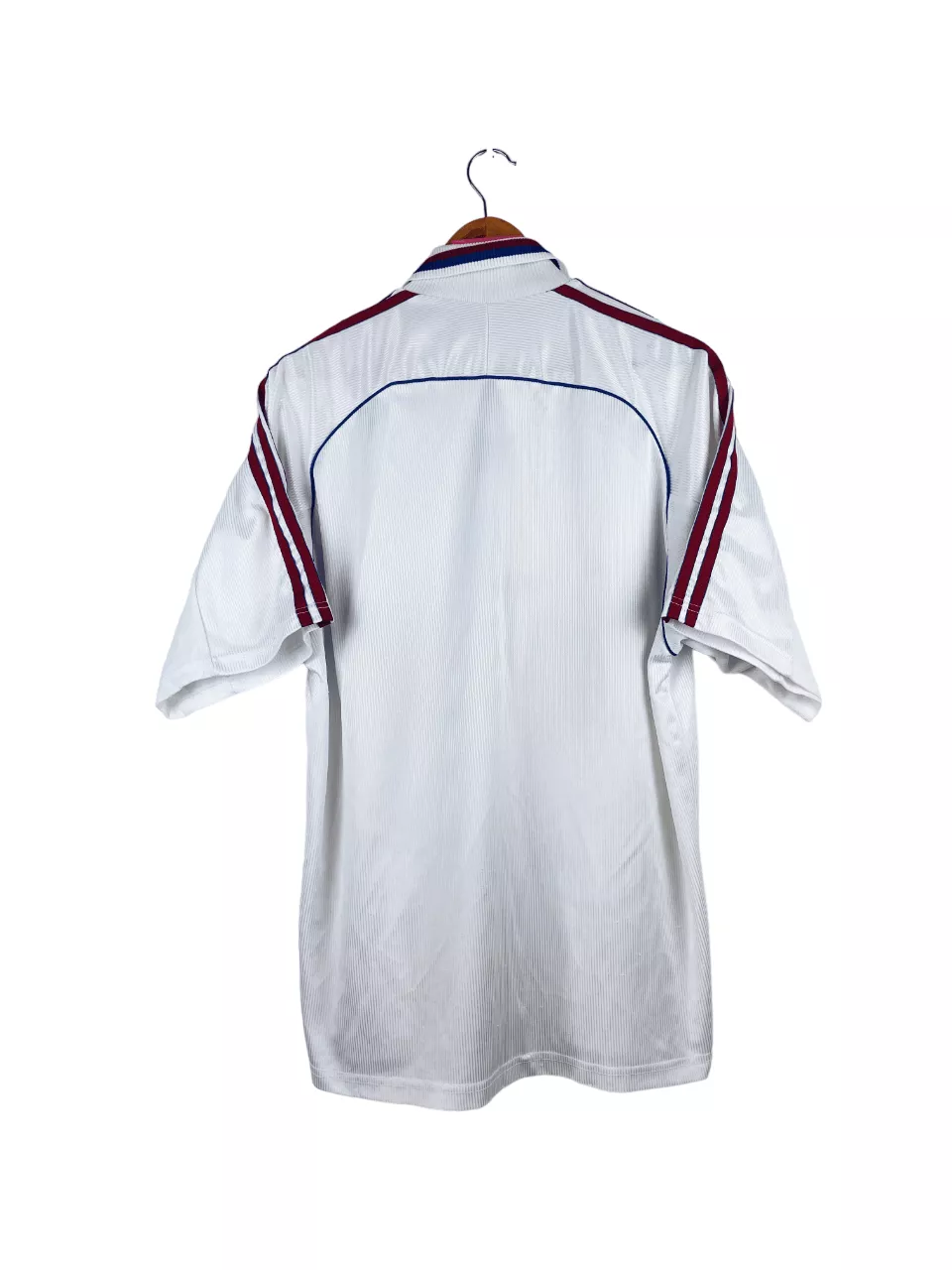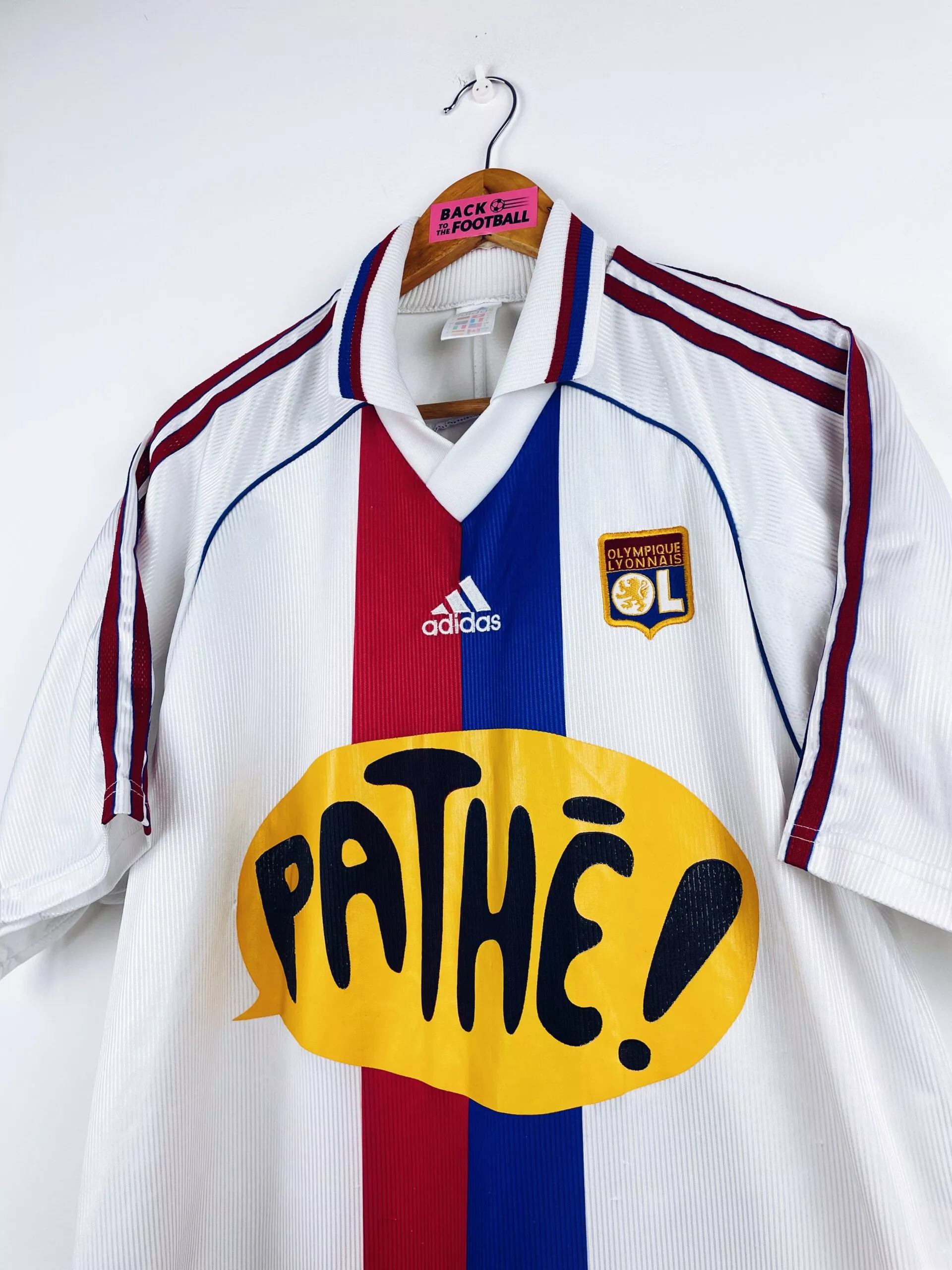 Taille : L Si tu veux plus de détails, tu peux nous contacter par mail ou sur les réseaux 😉 Etat : 7.5/10, très bon état, quelques bouloches, le sponsor Pathé légèrement abimé (voir photos) Le maillot : maillot vintage domicile de l’OL 1999/2000. L’écusson et le logo Adidas sont brodés. Le sponsor Pathé est floqué. Très beau maillot rétro de l’Olympique Lyonnais ! Histoire : belle saison pour l’OL qui termine sur le podium de la ligue 1, derrière Monaco et le PSG. En Coupe de l’UEFA, ils n’iront pas plus loin que le troisième tour après leur défaite…