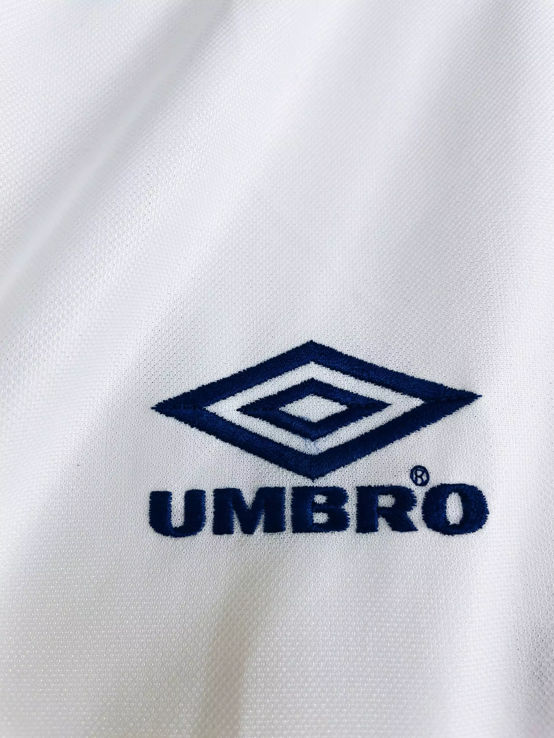 Taille : XL Etat : 8/10, très bon état hormis l’écusson qui est légèrement délavé (voir photo) Le maillot : maillot vintage domicile de l’Angleterre 1999/2001 floqué de David Beckham #7. L’écusson et le logo Umbro sont brodés, le numéro 7 et Beckham sont en feutrine. Le détail des manches Umbro est splendide. Très beau maillot rétro de l’Angleterre ! Histoire : maillot porté par les Anglais lors de l’Euro 2000. Les Three Lions se qualifient difficilement avec une 2ème place de leur groupe des éliminatoires, sauvés uniquement par la différence de buts face à la Pologne. Ensuite, les Anglais…