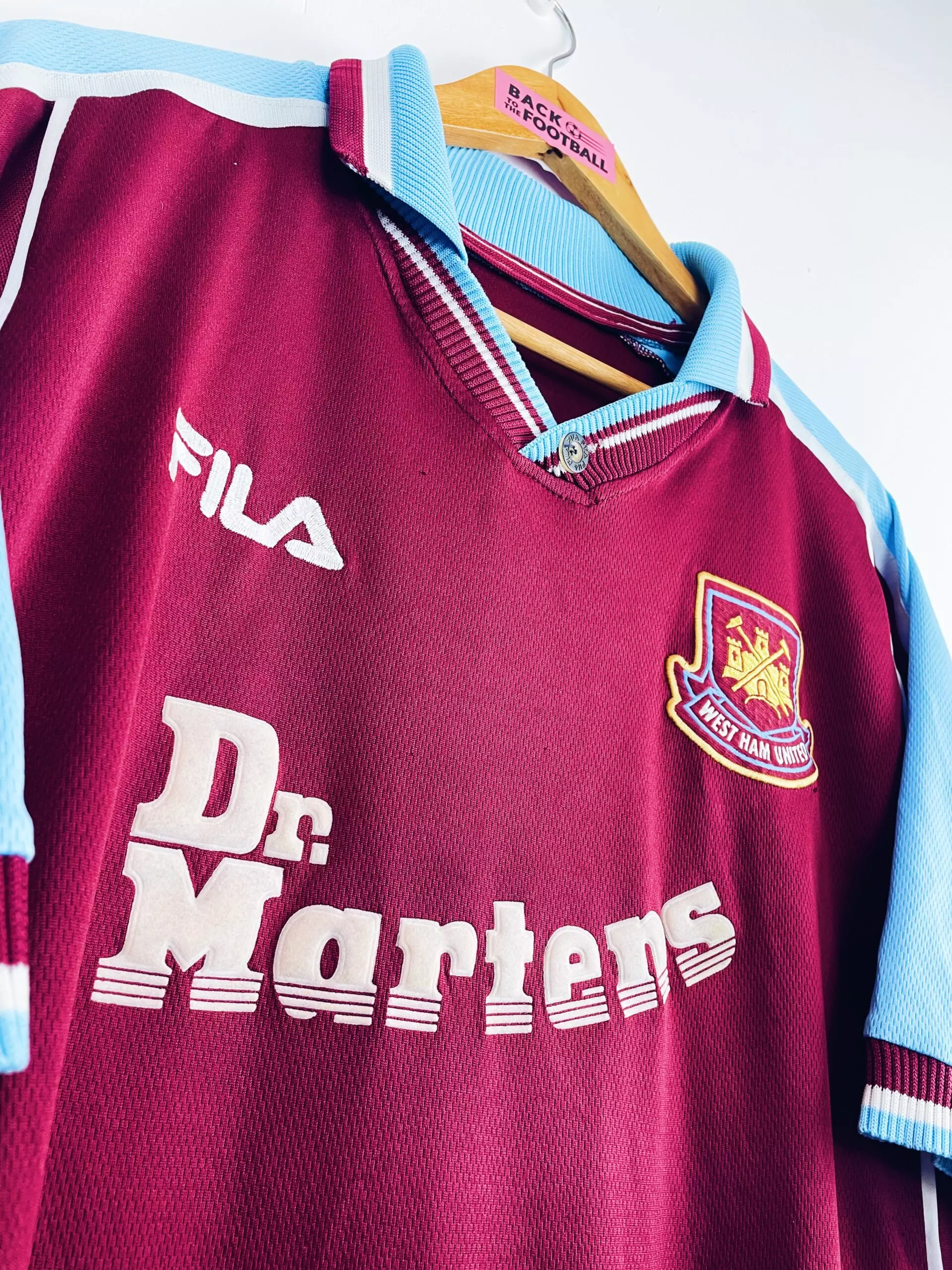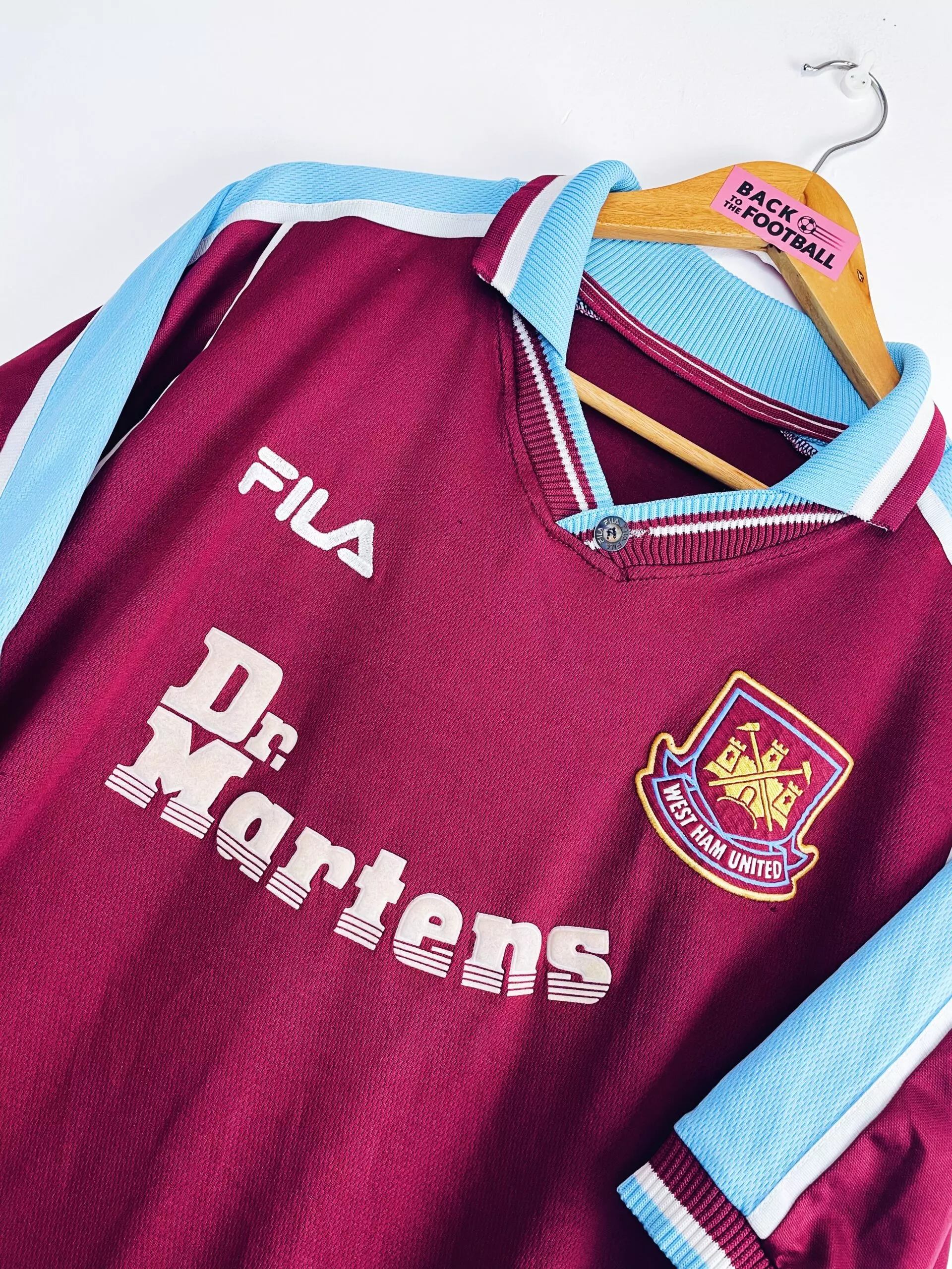 Taille : XL Etat : 7.5/10, très bon état, 2 petits accros dans le dos et la feutrine est très légèrement noircie (voir photos) Le maillot : maillot vintage domicile de West Ham 1999/2001. L’écusson et le logo Fila sont brodés, le sponsor mythique Dr. Martens est en feutrine. Le col avec le bouton Fila est magnifique. Très beau maillot rétro de West Ham ! Histoire : la première saison, les Hammers termineront à la 9ème place de Premier League. Ils iront en quart de League Cup mais surtout ils remporteront la Coupe Intertoto, avec la Juventus et Montpellier (3…