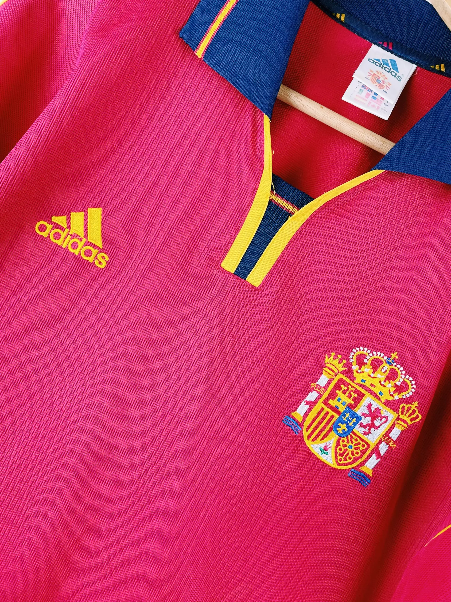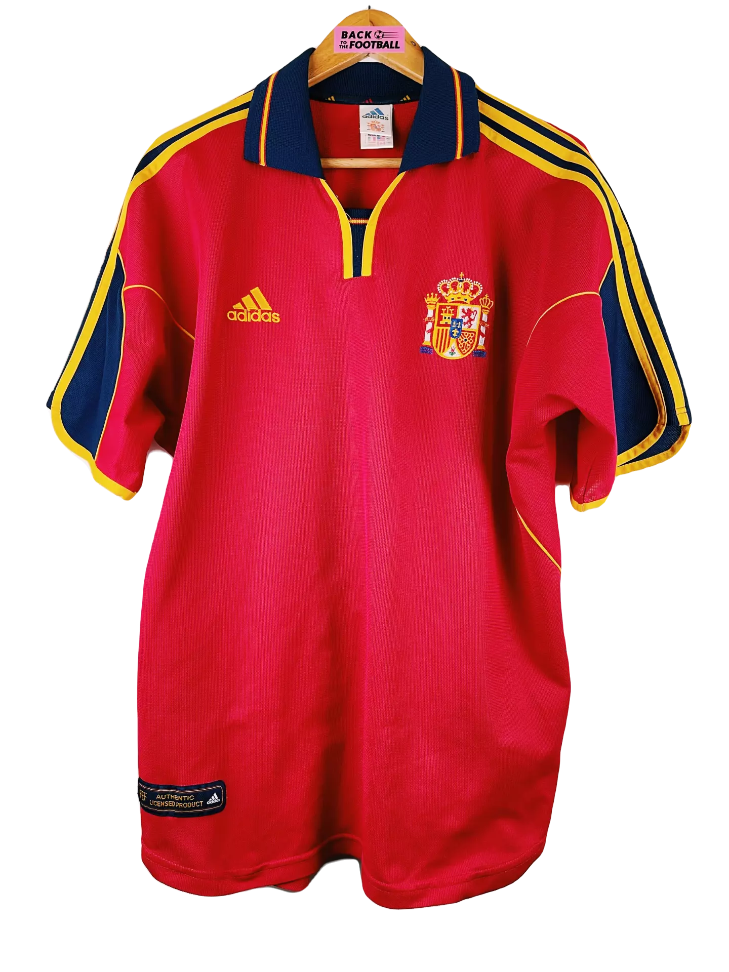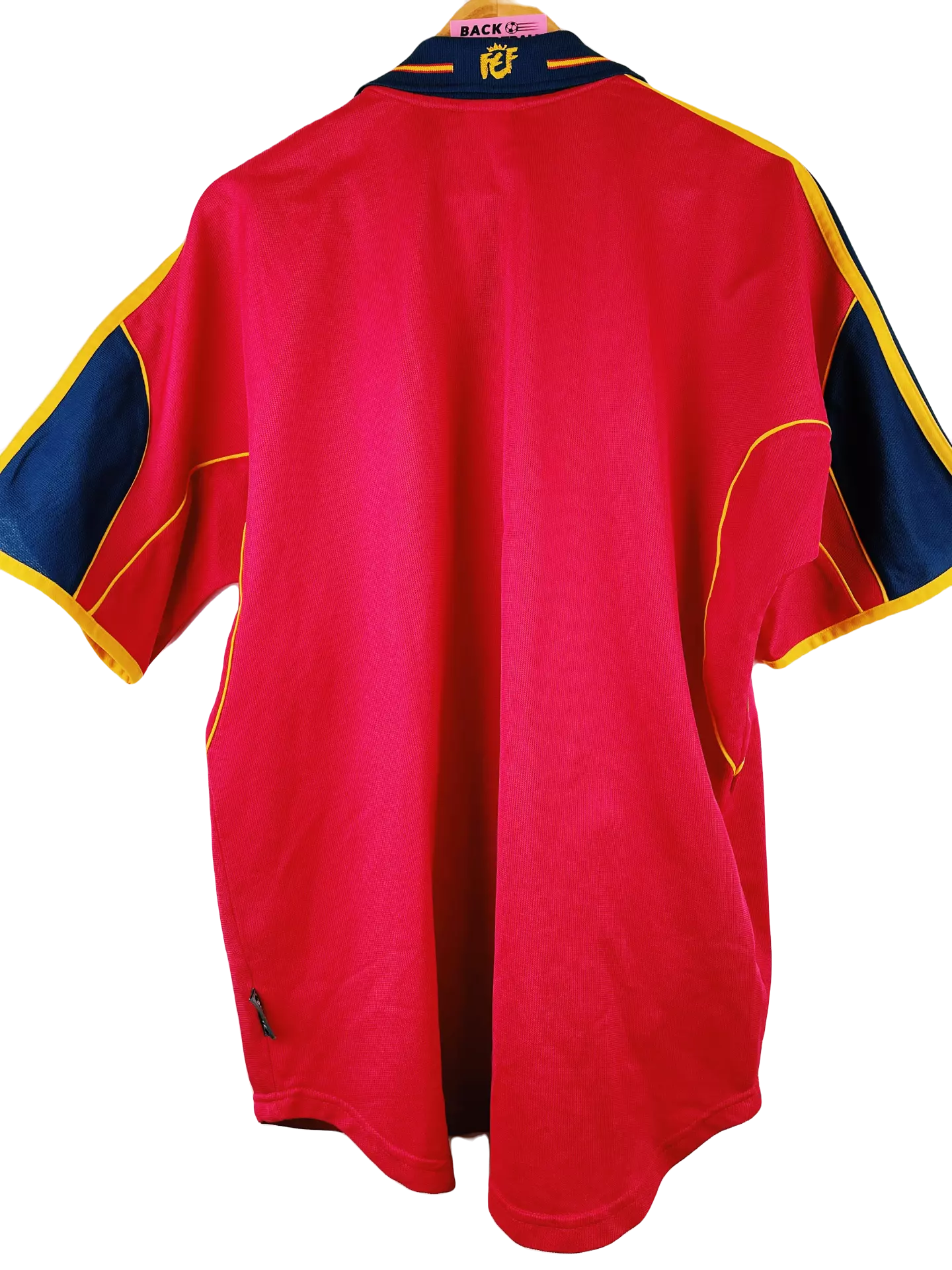 Taille : L Etat : 8/10, très bon état général Le maillot : maillot vintage Adidas domicile de l’Espagne, 1999/2002. L’écusson de l’Espagne est brodé, comme le logo Adidas. Les bandes Adidas jaunes recouvrent toutes les manches. Histoire : la Roja sera éliminée de l’euro 2000 contre la France, en quart, à cause d’un but de Zidane et de Djorkaeff. Pour le mondial 2002, l’Espagne perdra également en quart, contre la Corée du Sud aux pénaltys. Quelques joueurs : Xavi, Puyol, Casillas, Luis Enrique, Raúl, Morientes, Diego Tristan…
