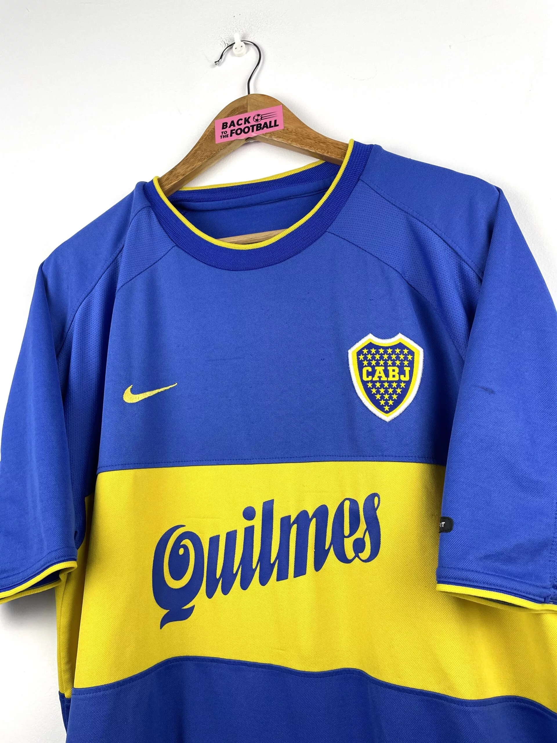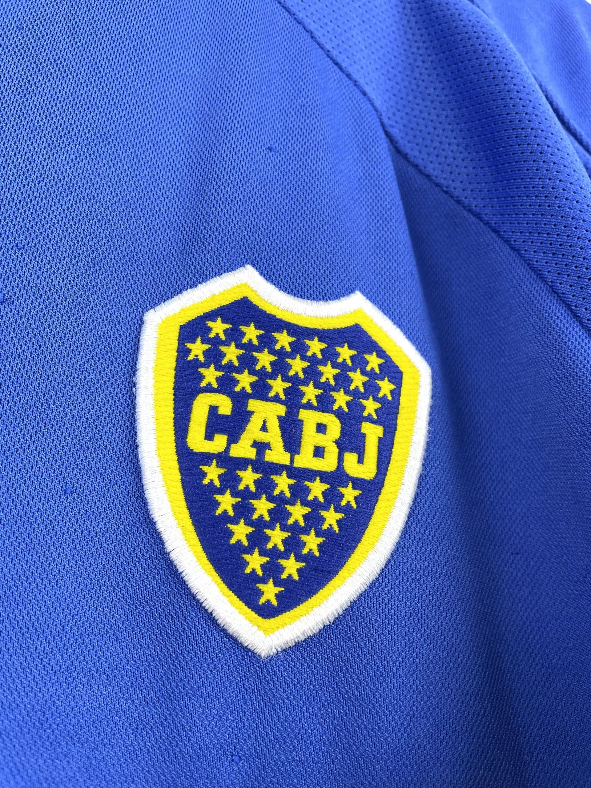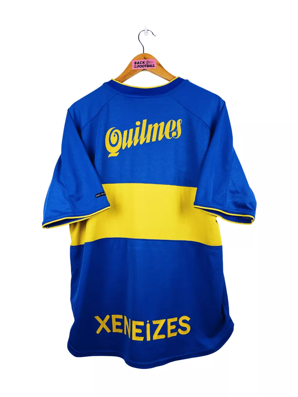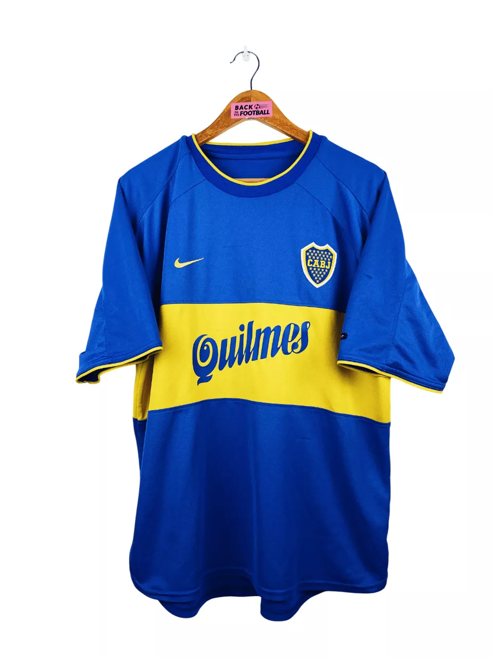 Taille : L Si tu veux plus de détails, tu peux nous contacter par mail ou sur les réseaux 😉 Etat : 6.5/10, bon état général mais des bouloches et accrocs. Et les flocages au dos sont légèrement abimés (voir photos) Le maillot : maillot vintage domicile de Boca Juniors 2000/2001. L’écusson et le logo Nike sont brodés, le sponsor Quilmes est floqué. Très beau maillot rétro de Boca Juniors ! Histoire : très grosse saison du Boca Juniors avec un titre de champions de tournoi d’ouverture devant River Plate et une 3ème place au tournoi de fermeture. Et surtout…