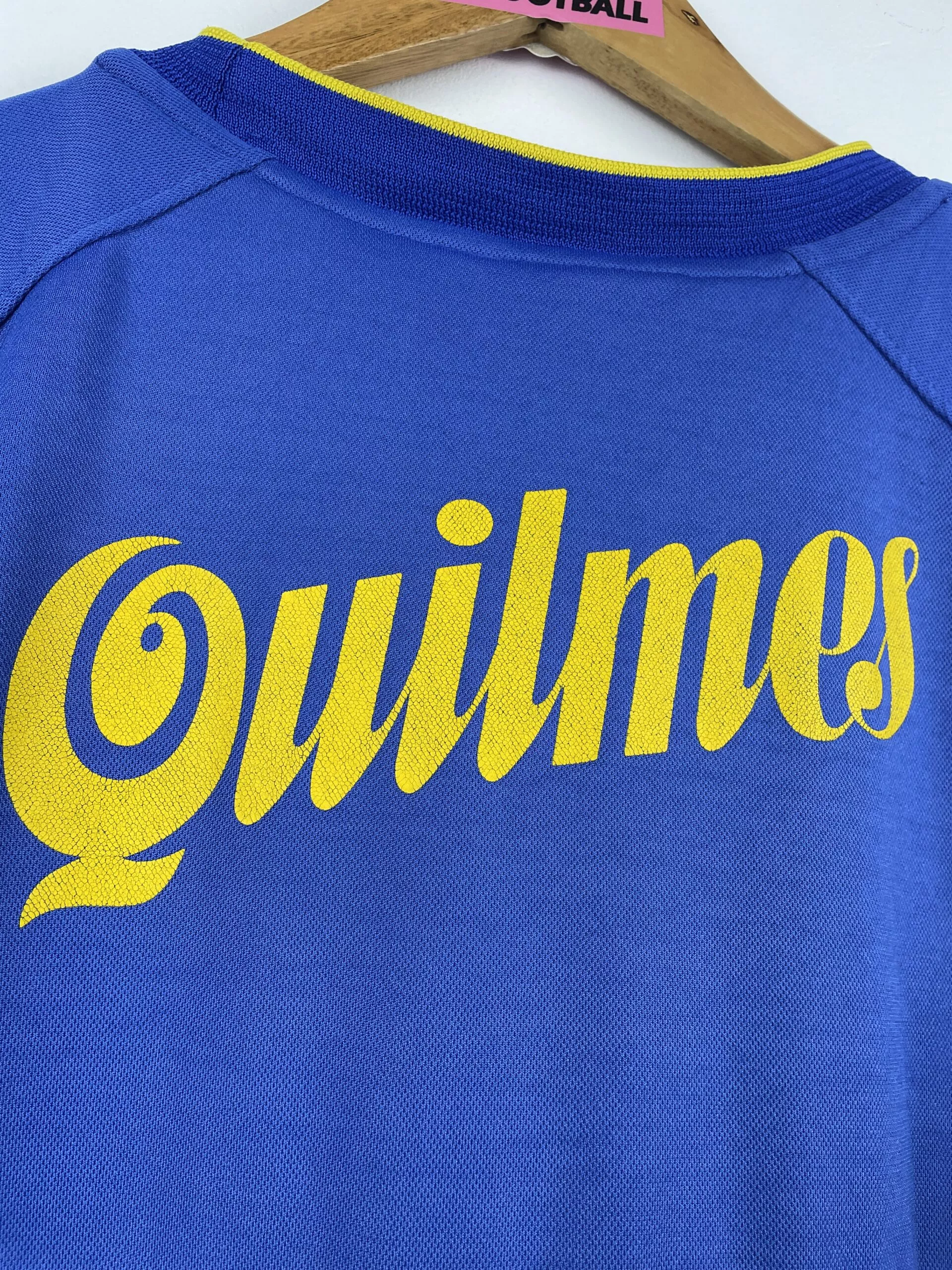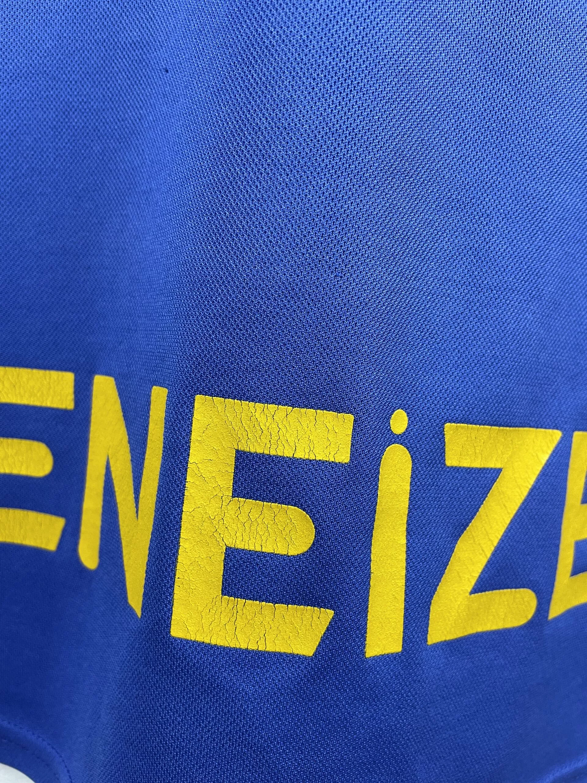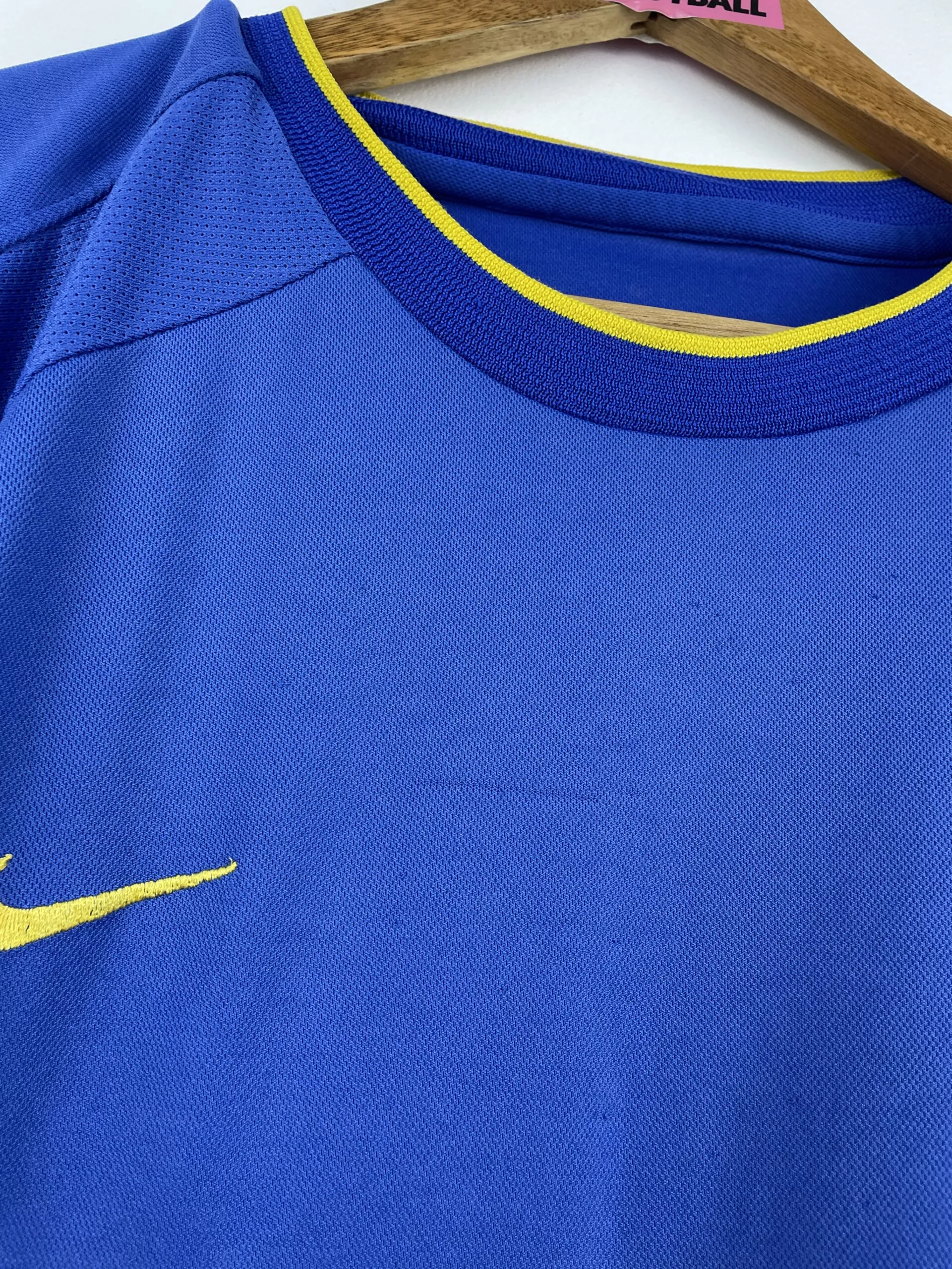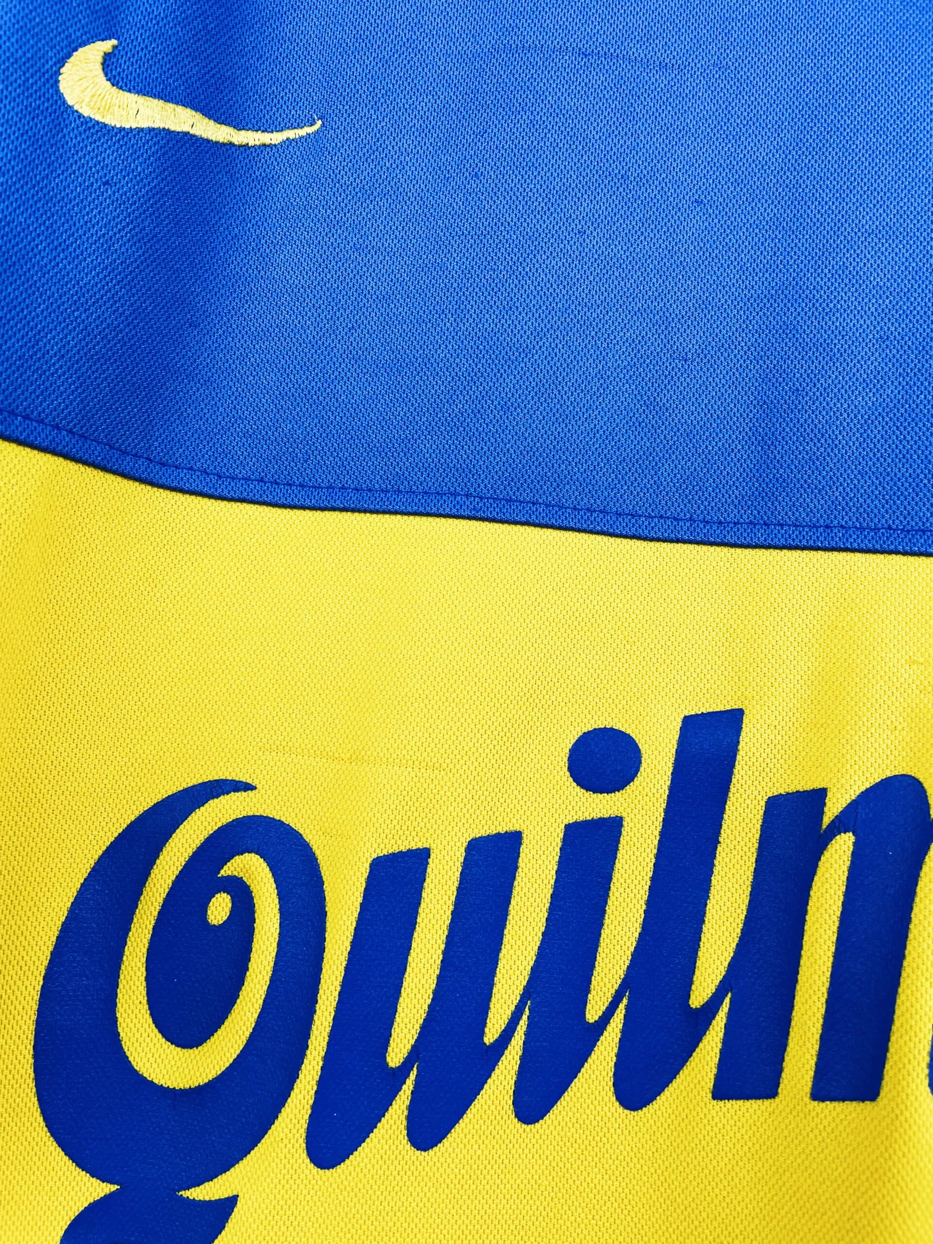 Taille : L Si tu veux plus de détails, tu peux nous contacter par mail ou sur les réseaux 😉 Etat : 6.5/10, bon état général mais des bouloches et accrocs. Et les flocages au dos sont légèrement abimés (voir photos) Le maillot : maillot vintage domicile de Boca Juniors 2000/2001. L’écusson et le logo Nike sont brodés, le sponsor Quilmes est floqué. Très beau maillot rétro de Boca Juniors ! Histoire : très grosse saison du Boca Juniors avec un titre de champions de tournoi d’ouverture devant River Plate et une 3ème place au tournoi de fermeture. Et surtout…