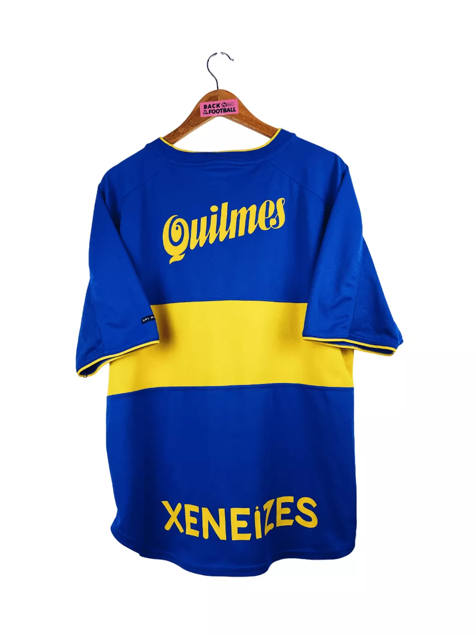 Taille : M Si tu veux plus de détails, tu peux nous contacter par mail ou sur les réseaux 😉 Etat : 8/10, très bon état. Le flocage Quilmes au dos est légèrement abimé. Mini accro en bas. (voir photos) Le maillot : maillot vintage domicile de Boca Juniors 2000/2001. L’écusson et le logo Nike sont brodés, le sponsor Quilmes est floqué. Très beau maillot rétro de Boca Juniors ! Histoire : très grosse saison du Boca Juniors avec un titre de champions de tournoi d’ouverture devant River Plate et une 3ème place au tournoi de fermeture. Et surtout un…