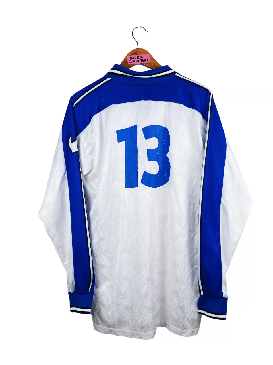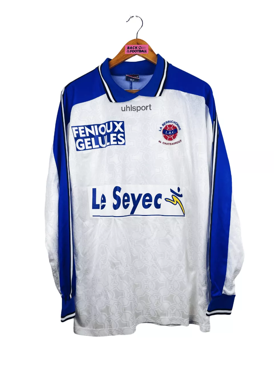 Taille : XL Si tu veux plus de détails, tu peux nous contacter par mail ou sur les réseaux 😉 Etat : 7/10, bon état général, petits accrocs, #13 abimé, logo Uhlsport devenu terne (voir photos) Le maillot : maillot vintage extérieur de Châteauroux 2000/2001 manches longues préparé (match issue) ou porté (match worn) par le numéro 13. L’écusson est en feutrine, les sponsors et le numéro 13 sont floqués. Joli maillot rétro de la Berrichonne ! Histoire : jolie saison de la Berrichonne qui termine à la 6ème place de D2. Ils iront jusqu’en quarts de Coupe de la…