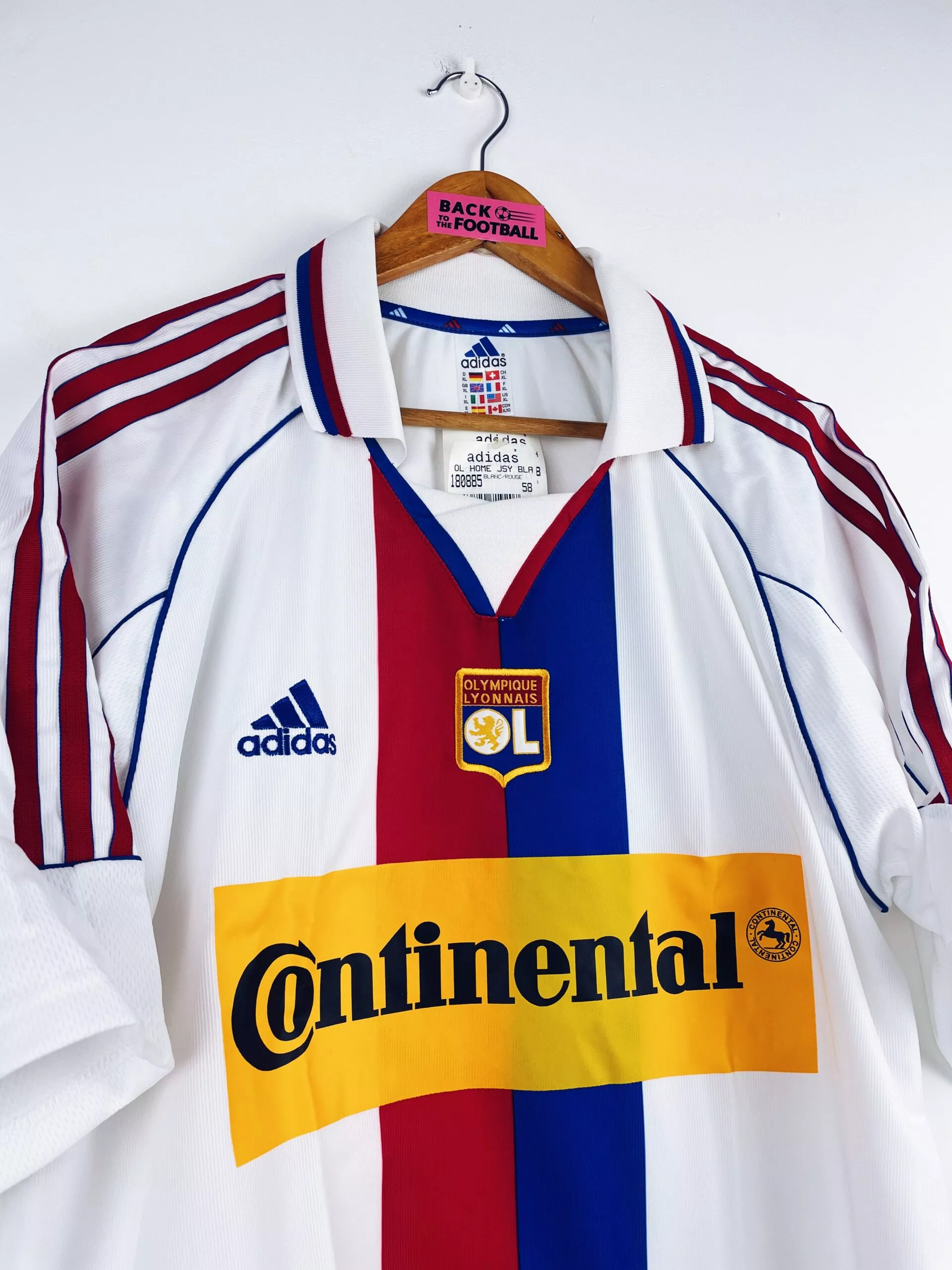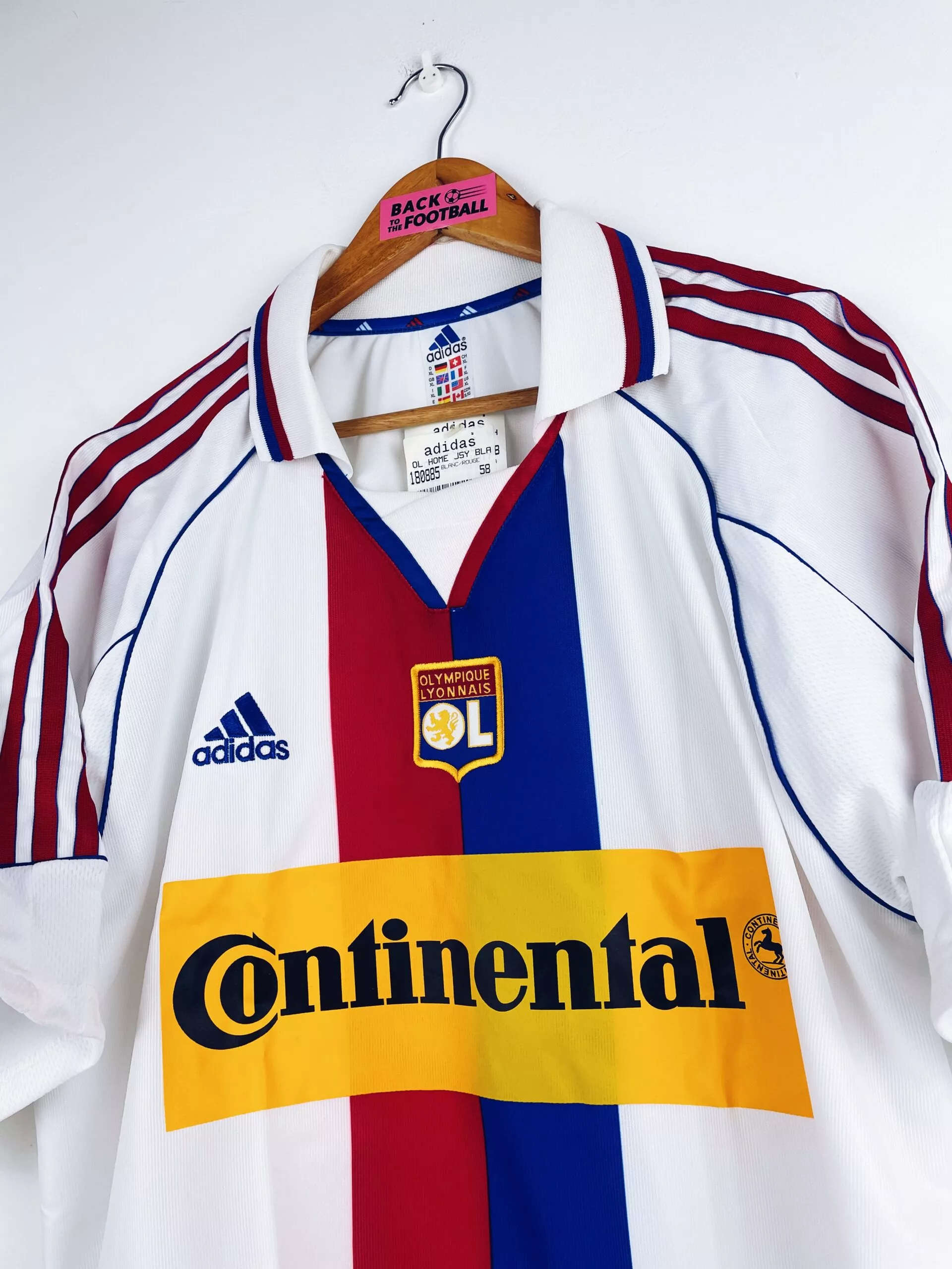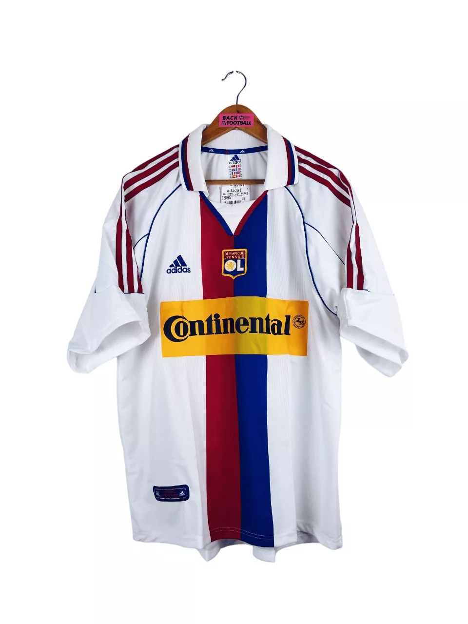 Taille : XL Si tu veux plus de détails, tu peux nous contacter par mail ou sur les réseaux 😉 Etat : neuf avec étiquettes (BNWT) Le maillot : maillot vintage domicile de l’OL 2000/2001. L’écusson et le logo Adidas sont brodés, le sponsor Continental est floqué. Très beau maillot rétro de l’Olympique Lyonnais ! Histoire : belle saison des hommes de Jacques Santini avec une deuxième place en Ligue 1 derrière Nantes et surtout une victoire en Coupe de la Ligue, le premier trophée depuis 28 ans. L’OL sort de la première phase de groupe en Ligue des Champions,…