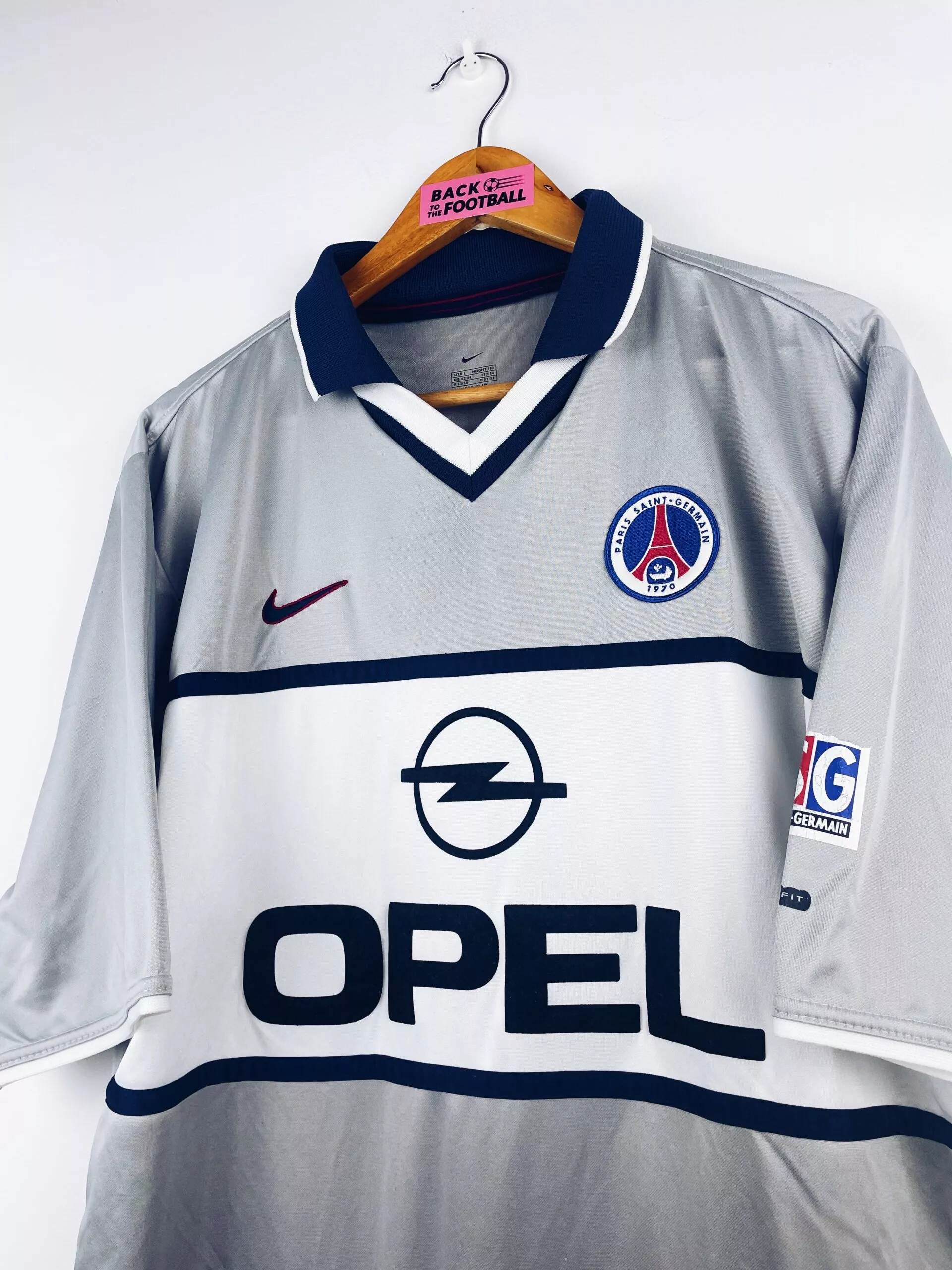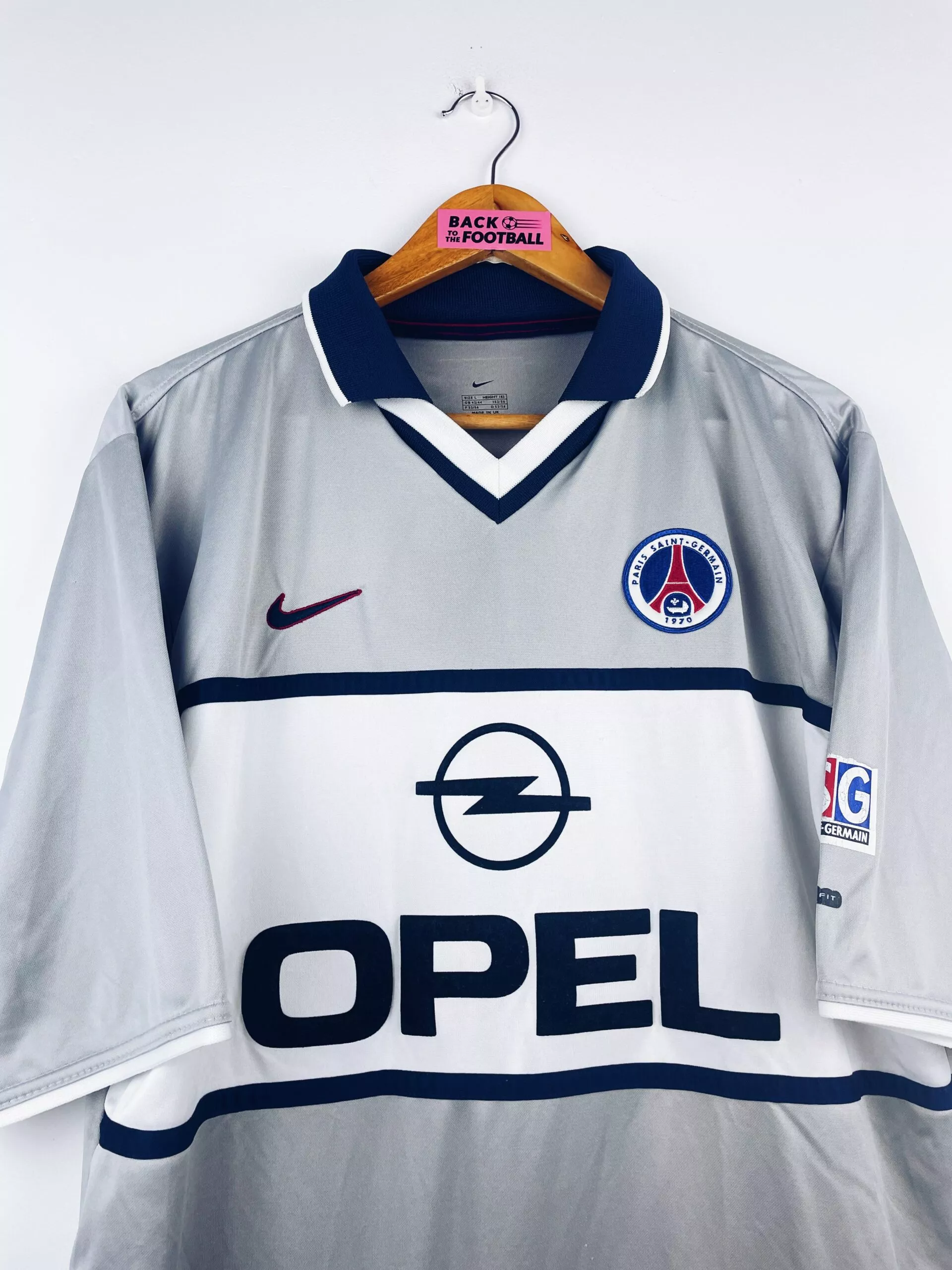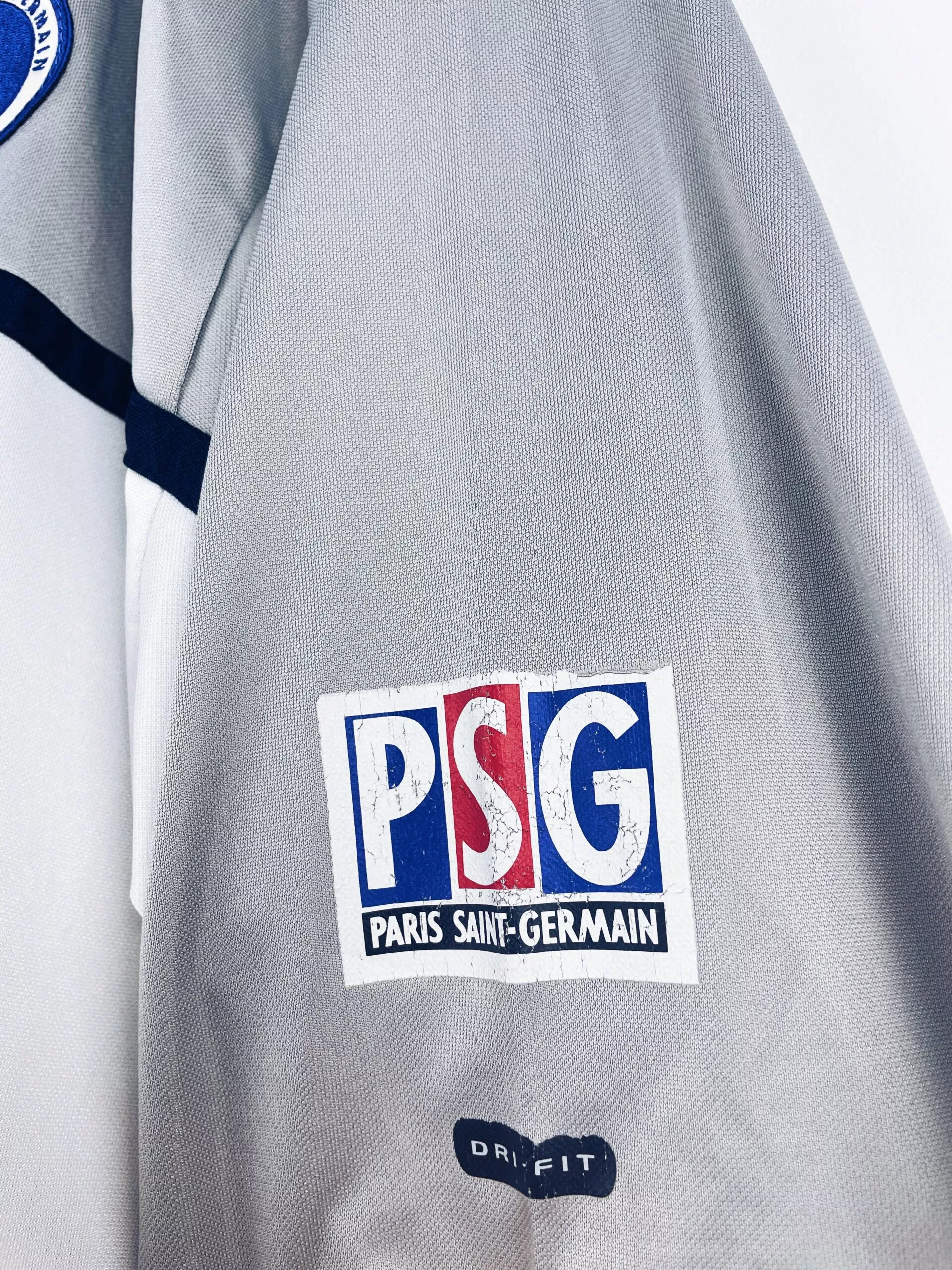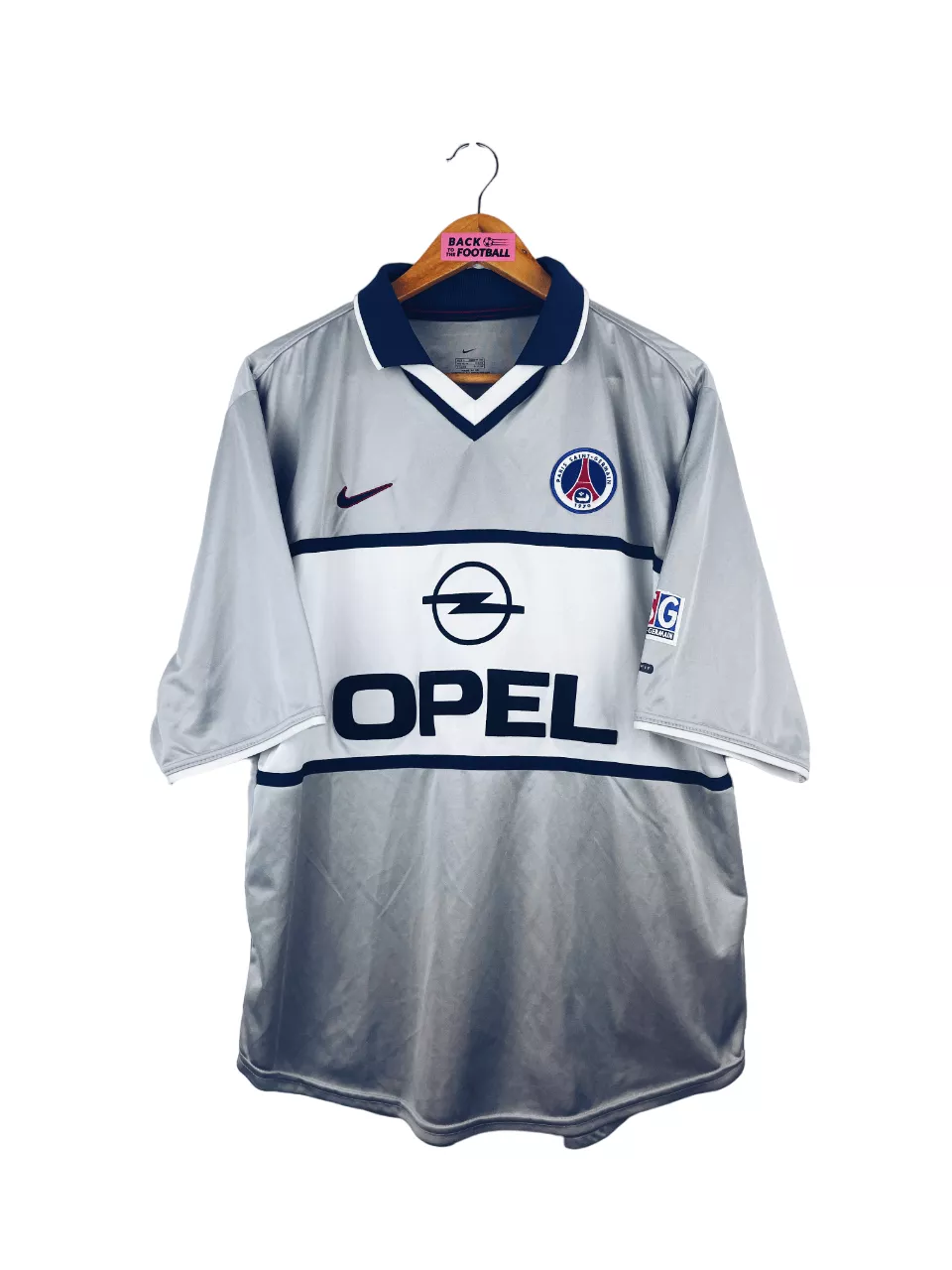 Taille : L Si tu veux plus d’infos, tu peux nous contacter par mail ou sur les réseaux 😉 Etat : 8/10, très bon état hormis le flocage PSG sur la manche qui est abimé, une micro trace dans le dos, quasi invisible (voir photo) Le maillot : maillot vintage extérieur du PSG 2000/2001. L’écusson du club est brodé, le logo Nike aussi. Le sponsor Opel est en feutrine. Le logo PSG sur la manche est floqué. Très beau maillot rétro du PSG ! Histoire : saison moyenne pour les parisiens avec un changement d’entraineur en décembre : Bergeroo est…