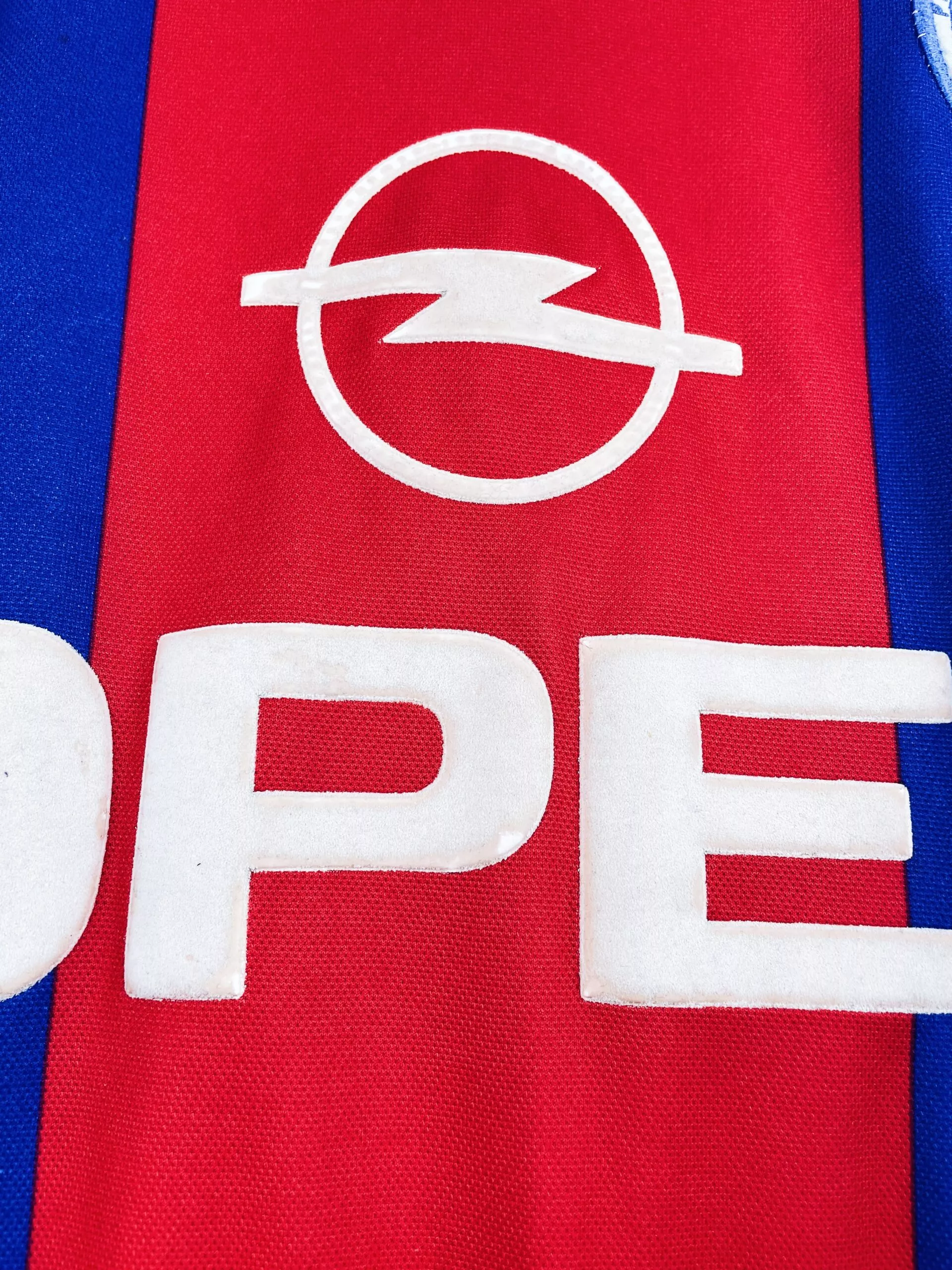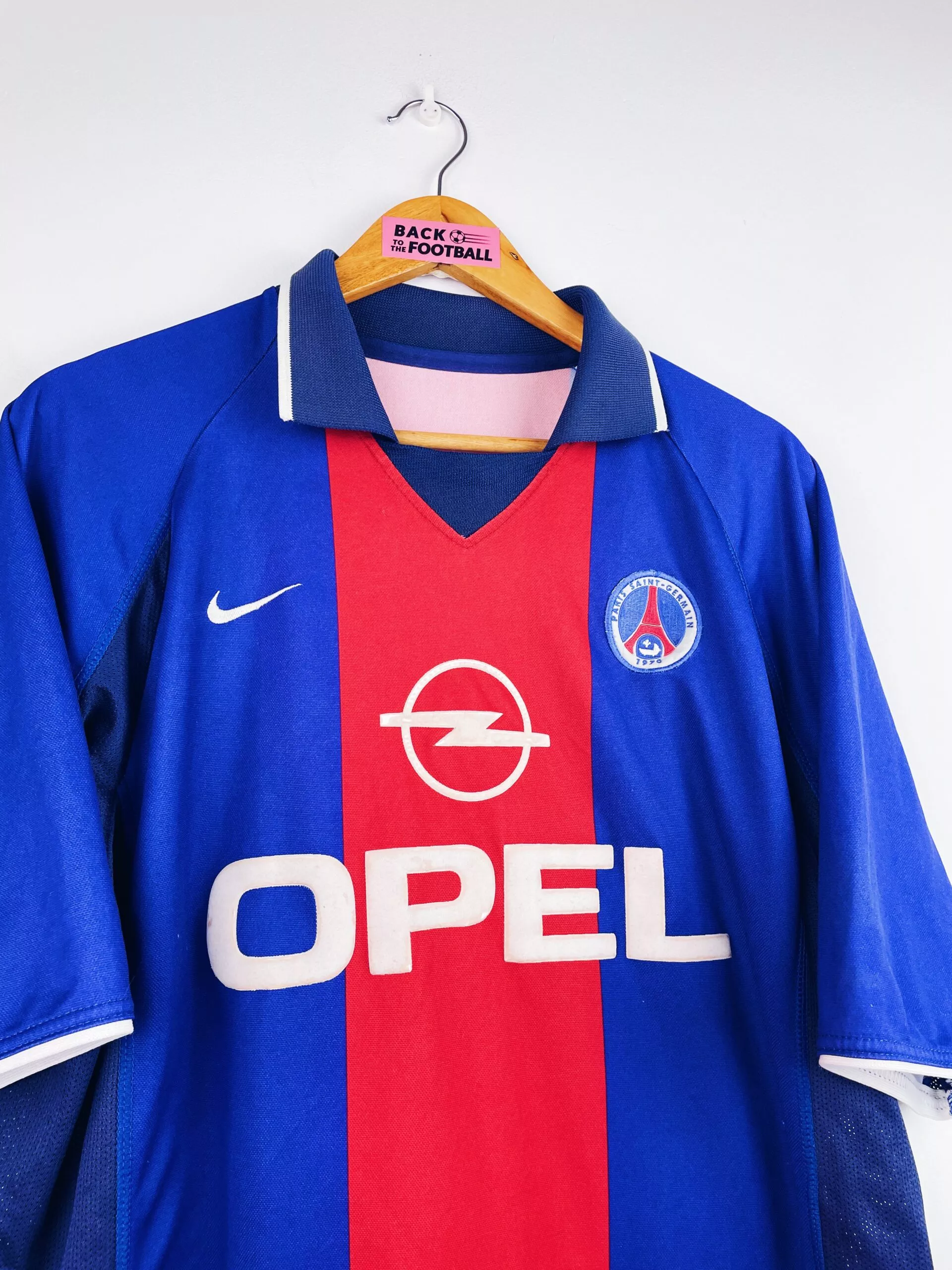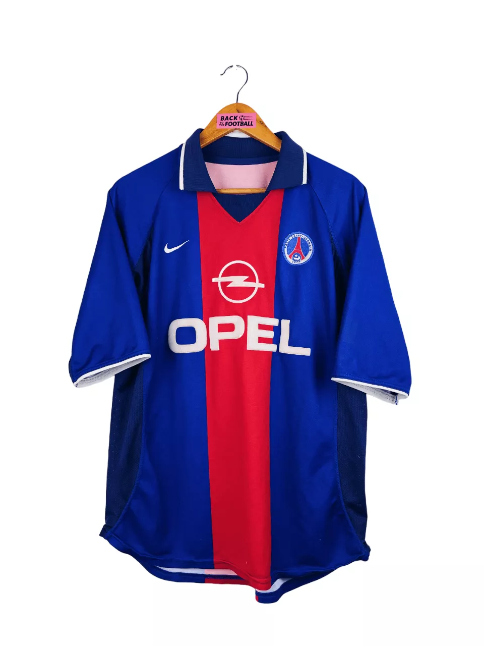 Taille : L Si tu veux plus d’infos, tu peux nous contacter par mail ou sur les réseaux 😉 Etat : 7/10, bon état général mais la feutrine a vieilli et il y a des petits accros en bas (voir photos) Le maillot : maillot vintage domicile du PSG 2000/2001. L’écusson du club est brodé, le logo Nike aussi. Le sponsor Opel est en feutrine. Très beau maillot rétro du PSG ! Histoire : saison moyenne pour les parisiens avec un changement d’entraineur en décembre : Bergeroo est remplacé par Luis Fernandez. Le PSG terminera à la 9ème place de…