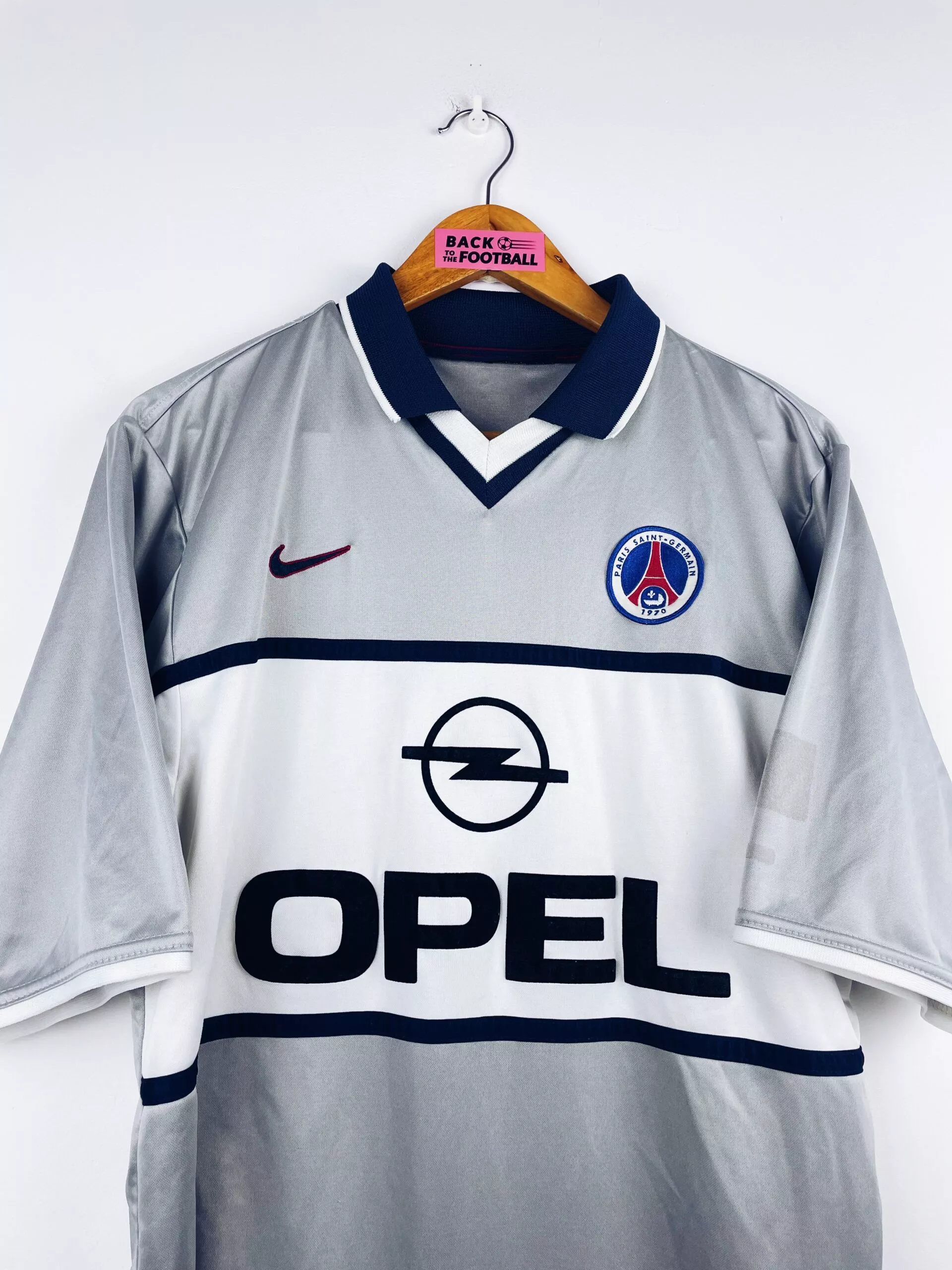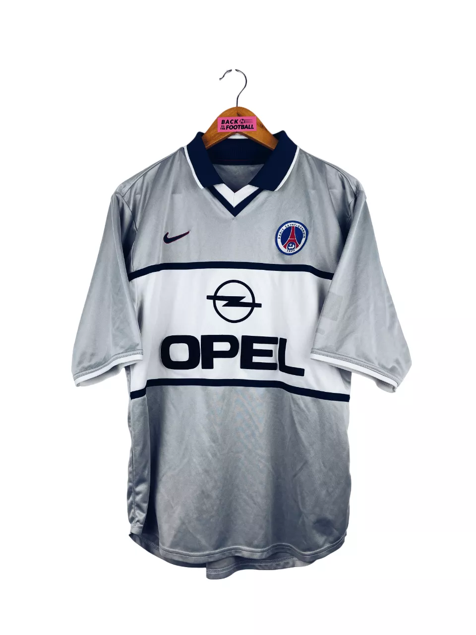 Taille : M Si tu veux plus d’infos, tu peux nous contacter par mail ou sur les réseaux 😉 Etat : 8/10, très bon état hormis le flocage PSG sur la manche qui est parti (voir photo) Le maillot : maillot vintage extérieur du PSG 2000/2001. L’écusson du club est brodé, le logo Nike aussi. Le sponsor Opel est en feutrine. Le logo PSG sur la manche est floqué. Très beau maillot rétro du PSG ! Histoire : saison moyenne pour les parisiens avec un changement d’entraineur en décembre : Bergeroo est remplacé par Luis Fernandez. Le PSG terminera à…
