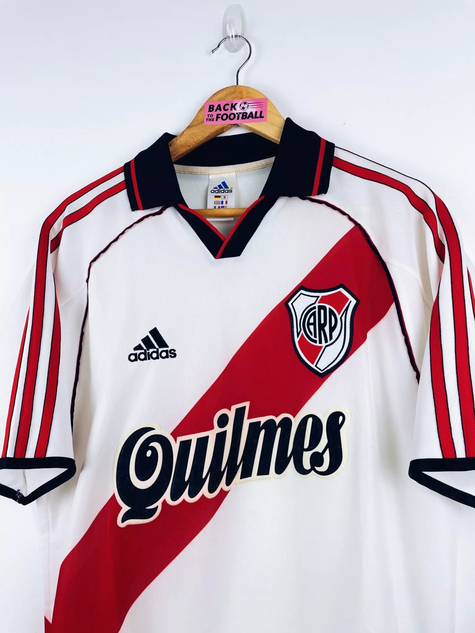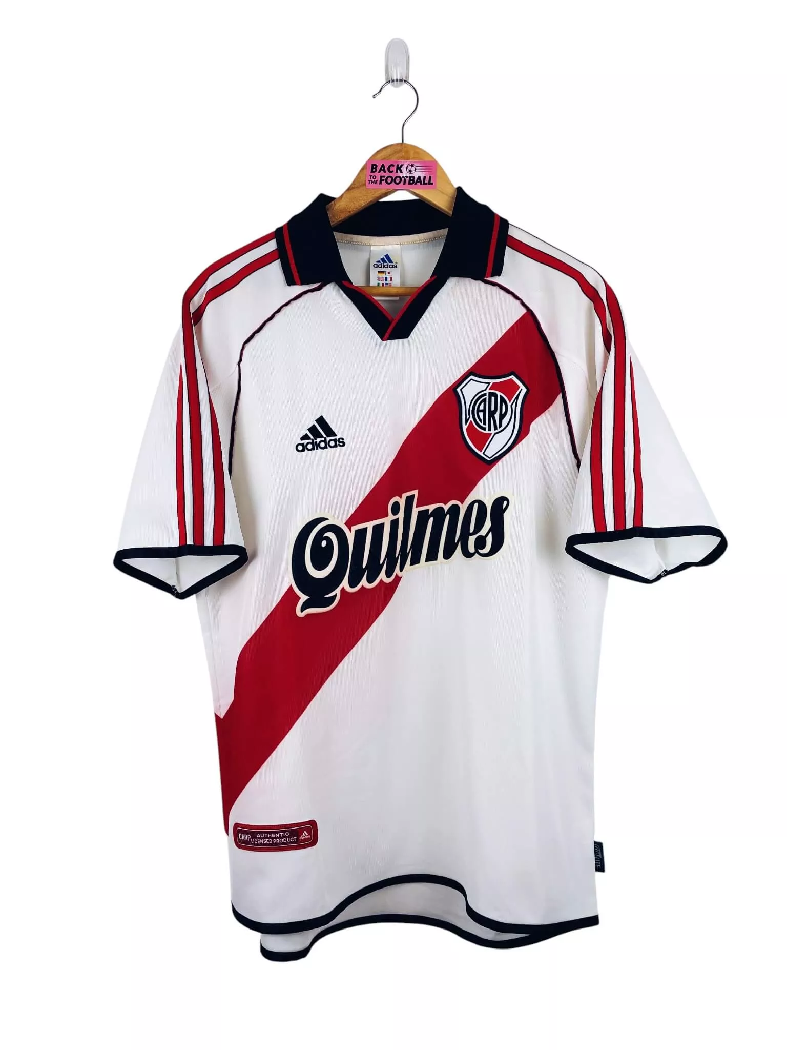 Taille : M Largeur : 53cm (aisselle à aisselle) Longueur : 72cm (base du col au bas) Si tu veux plus de détails, tu peux nous contacter par mail ou sur les réseaux 😉 Etat : 9/10, excellent état Le maillot : maillot vintage de River Plate 2000/2002 domicile. L’écusson et le logo Adidas sont brodés, le sponsor Quilmes est en feutrine. Très beau maillot rétro de River Plate ! Histoire : première saison frustrante avec une deuxième place aux tournois d’ouverture et de fermeture. Ils iront jusqu’en quarts de Copa Libertadores mais seront éliminés par Cruz Azul, le club…