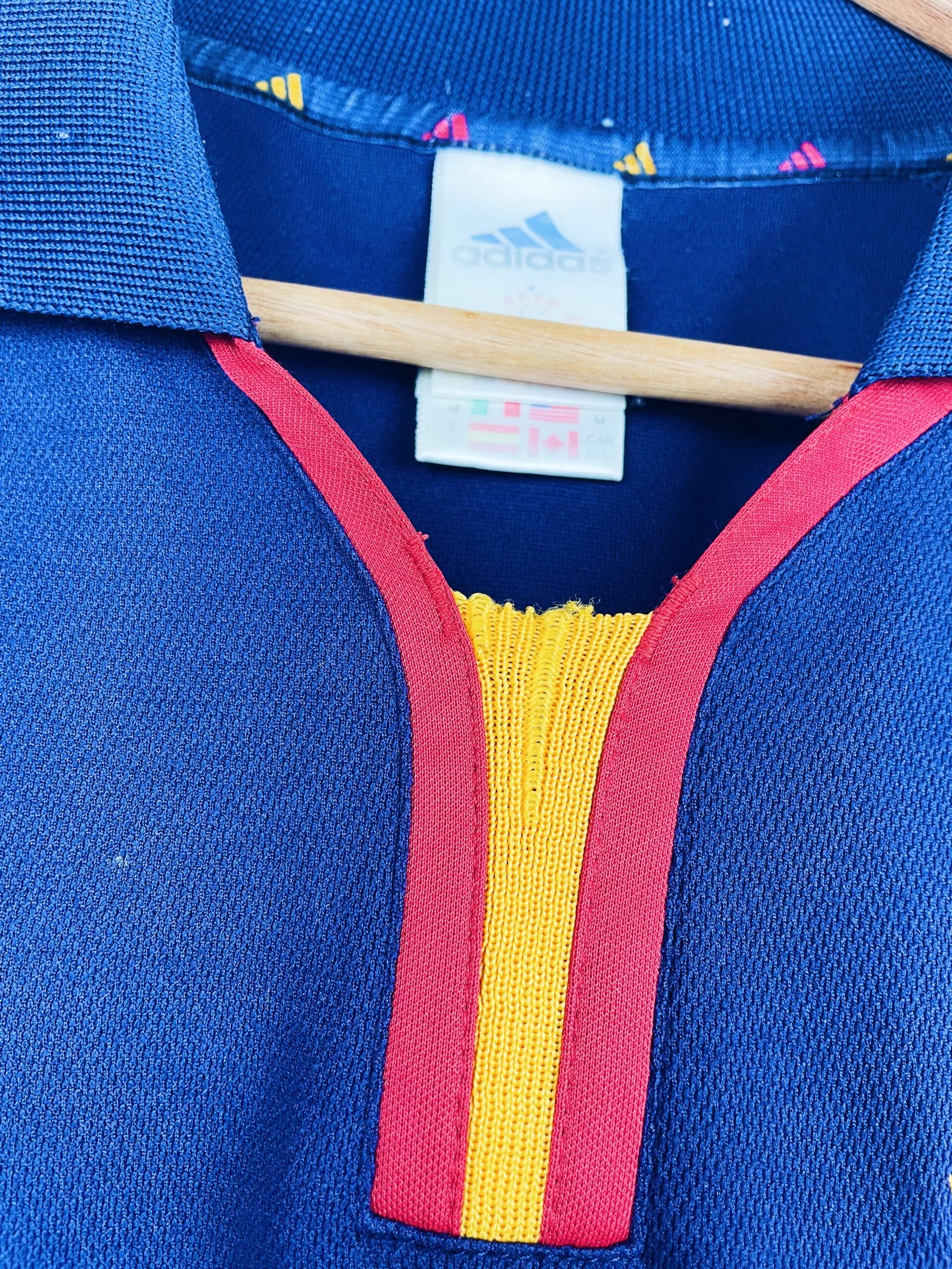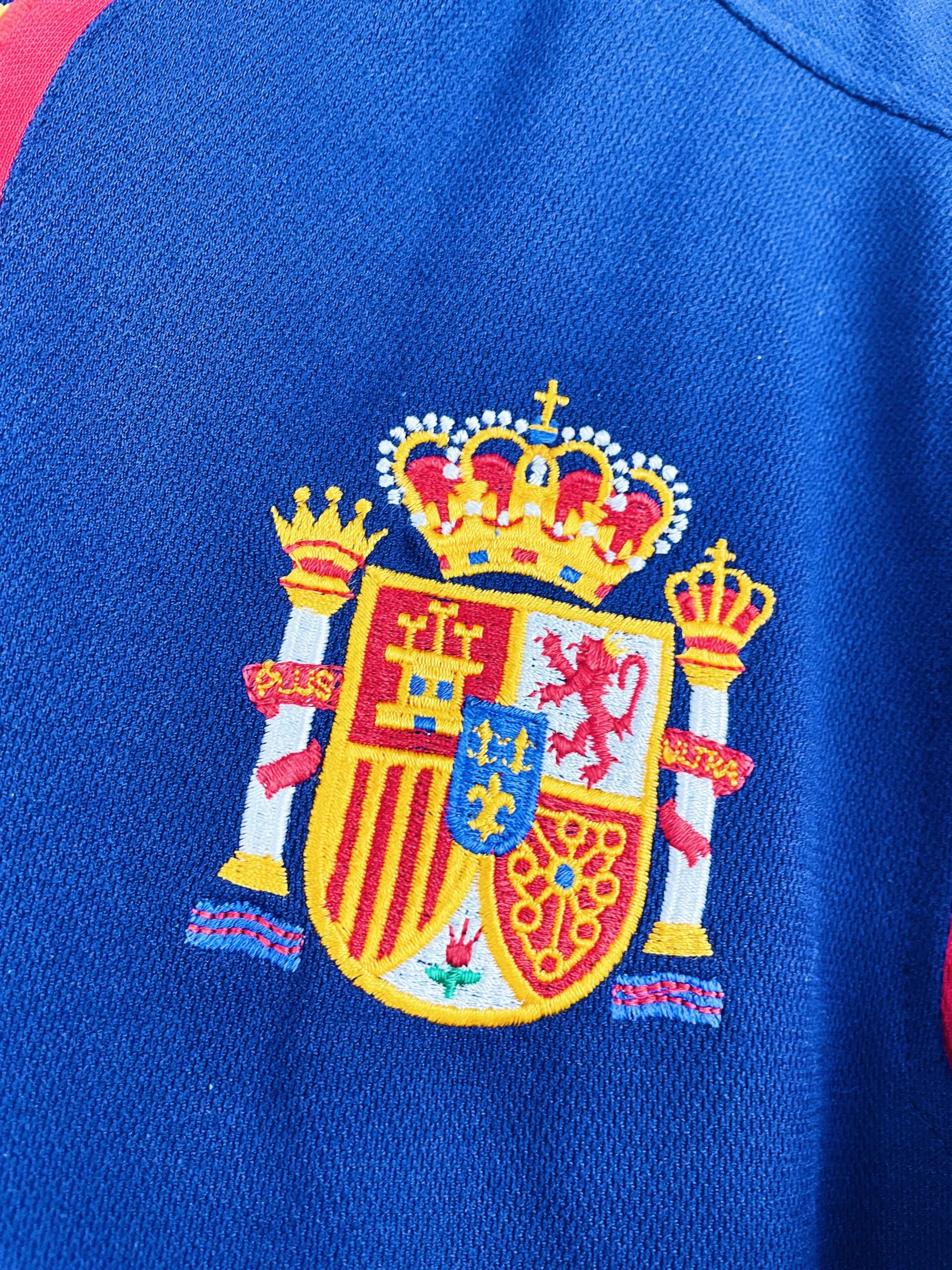 Taille : M Si tu veux plus d’infos, tu peux nous contacter par mail ou sur les réseaux 😉 Etat : 8/10, très bon état hormis quelques fils tirés au niveau du col et un léger accro en bas (voir photos) Le maillot : maillot vintage extérieur de l’Espagne 2000 utilisé pour l’Euro. L’écusson et le logo Adidas sont brodés. Très beau maillot rétro de l’Espagne ! Histoire : la Roja termine à la 1ère place de son groupe, devant la Yougoslavie notamment. En quart, les espagnols tombent contre la France et perdront 2-1. Quelques joueurs : Etxeberria, Raul, Alfonso,…