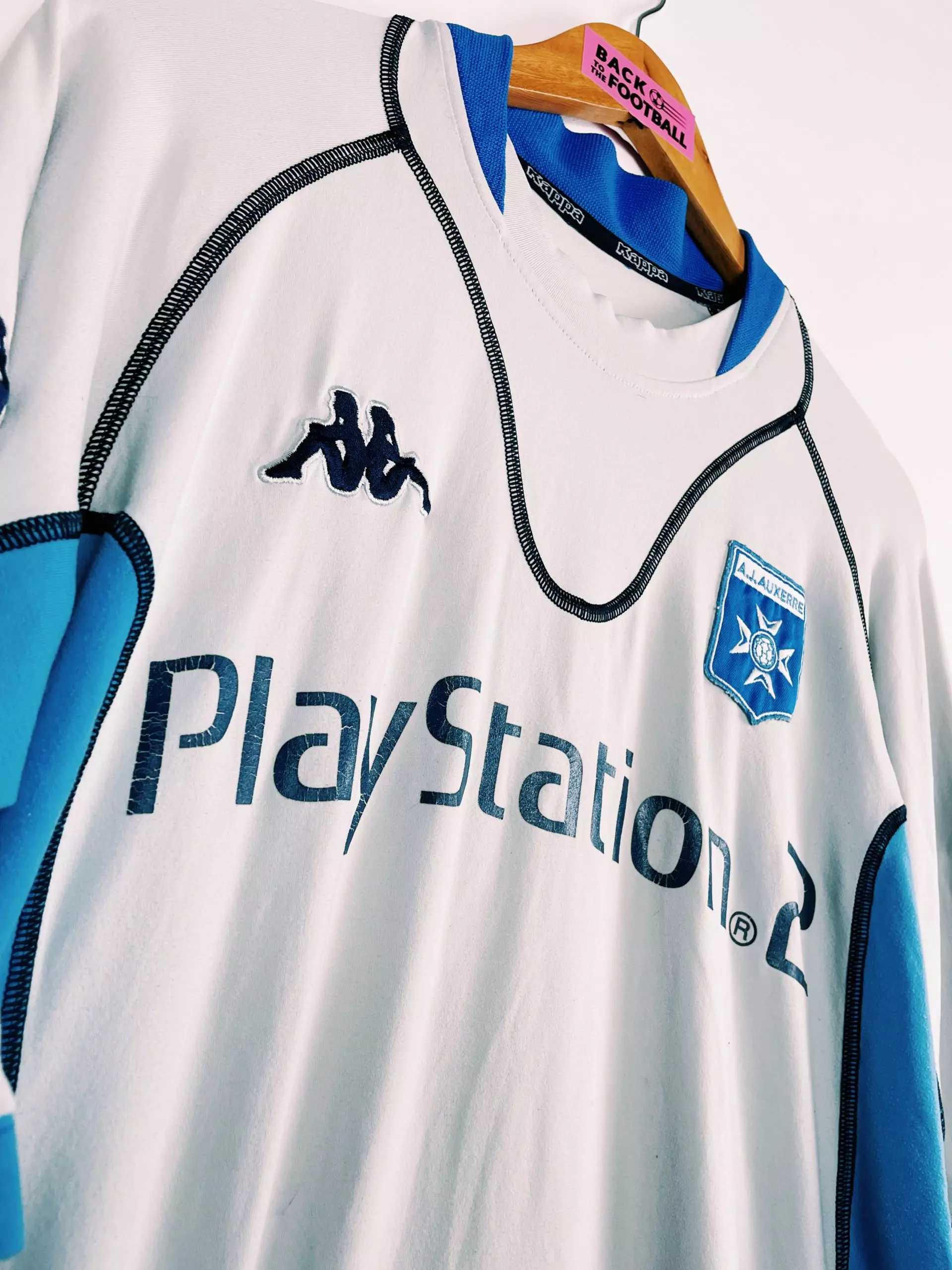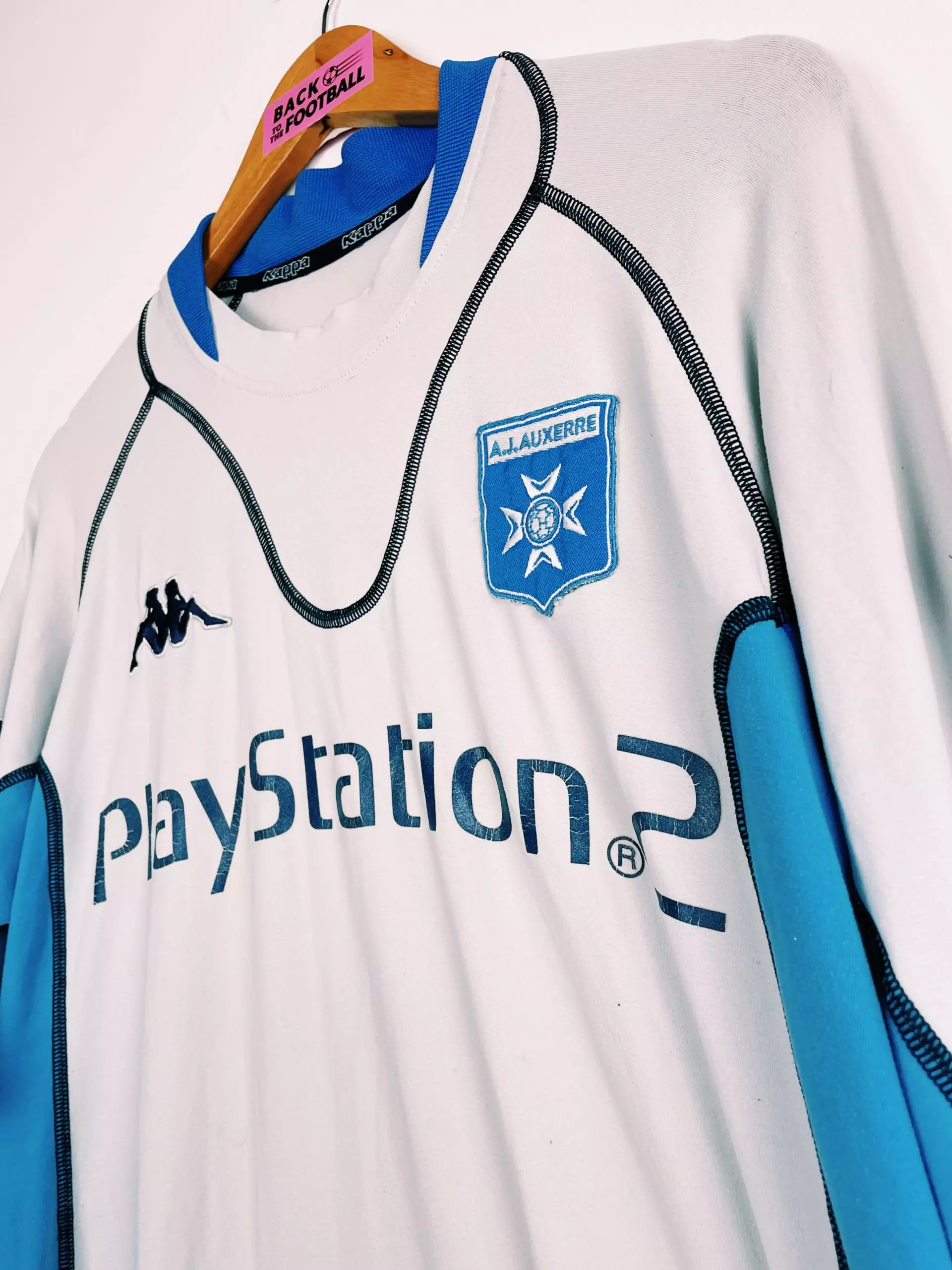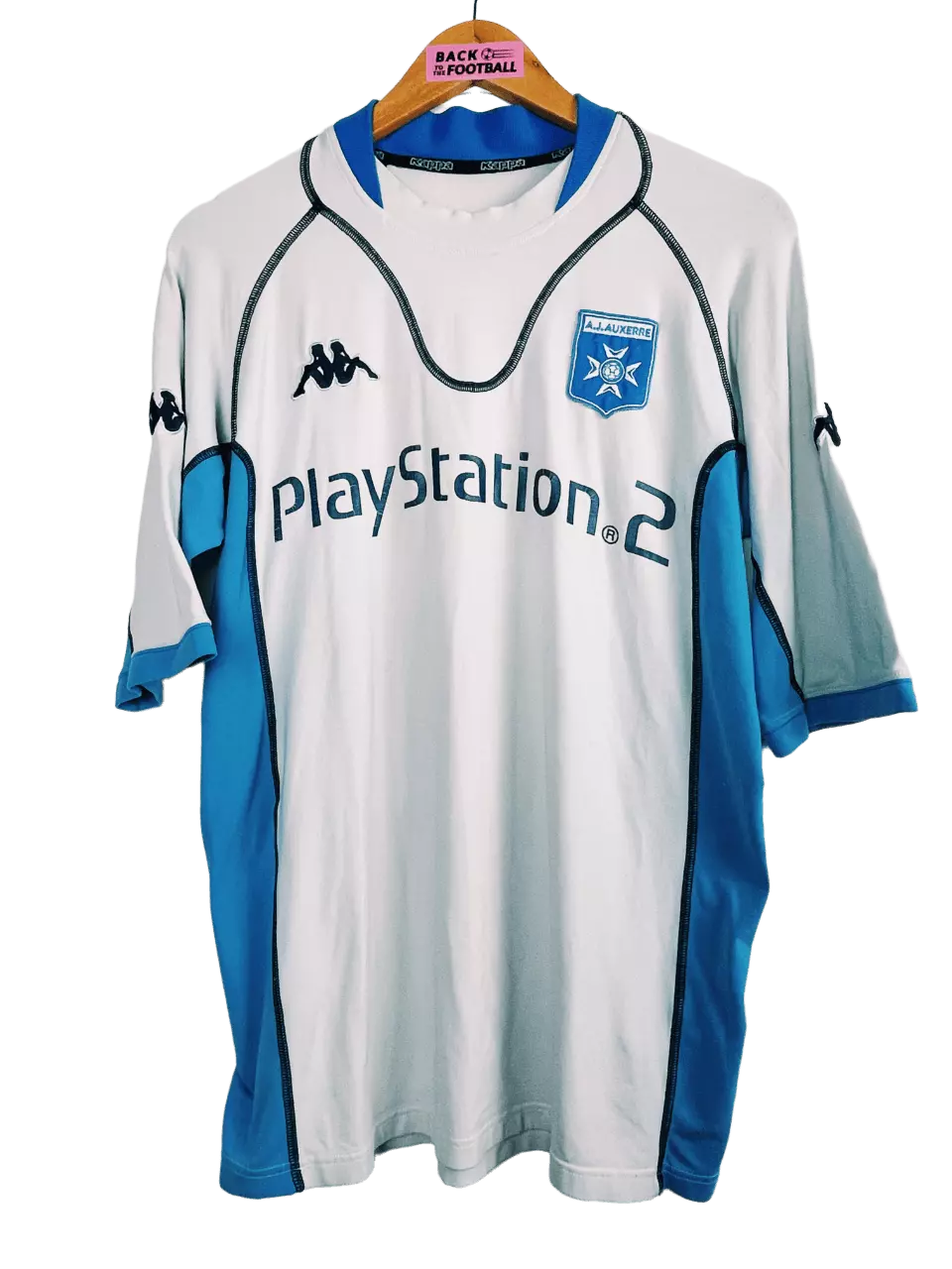 Taille : XL, le lycra taille très proche du corps Etat : 7/10, très bon état général, le flocage de Playstation 2 est craquelé (voir photo) Le maillot : maillot mythique de l’AJ Auxerre 2001/2002. L’écusson et le logo Kappa sont brodés. Le sponsor Playstation 2 est floqué. Le maillot est en lycra. Un rare maillot rétro de l’AJ Auxerre ! Histoire : très grosse saison de l’AJA avec une 3ème place en Ligue 1, derrière Lyon et Lens. Djibril Cissé est en feu avec 22 buts, il finira meilleur buteur du championnat, ex aequo avec Pauleta. Les Auxerrois n’iront…