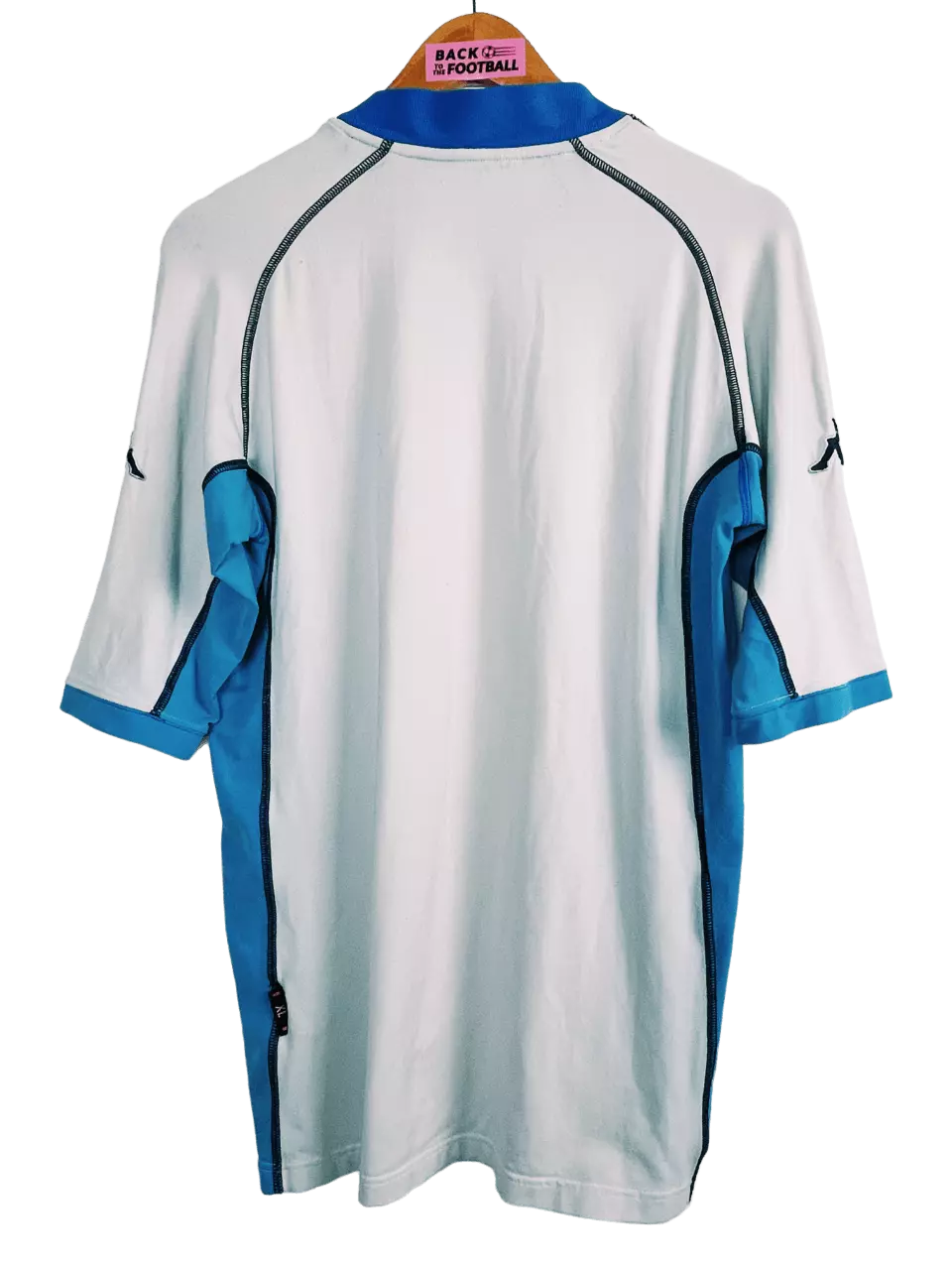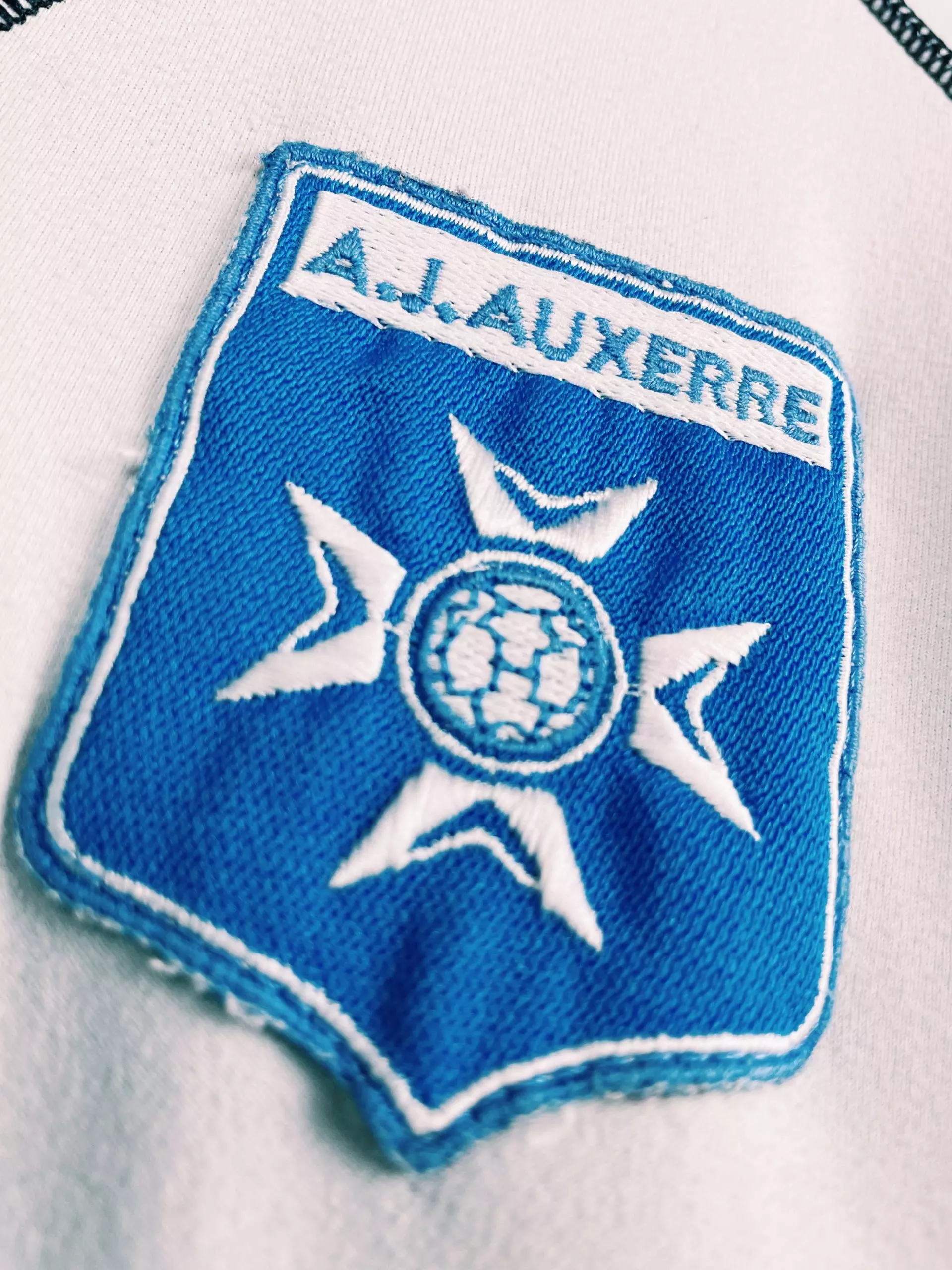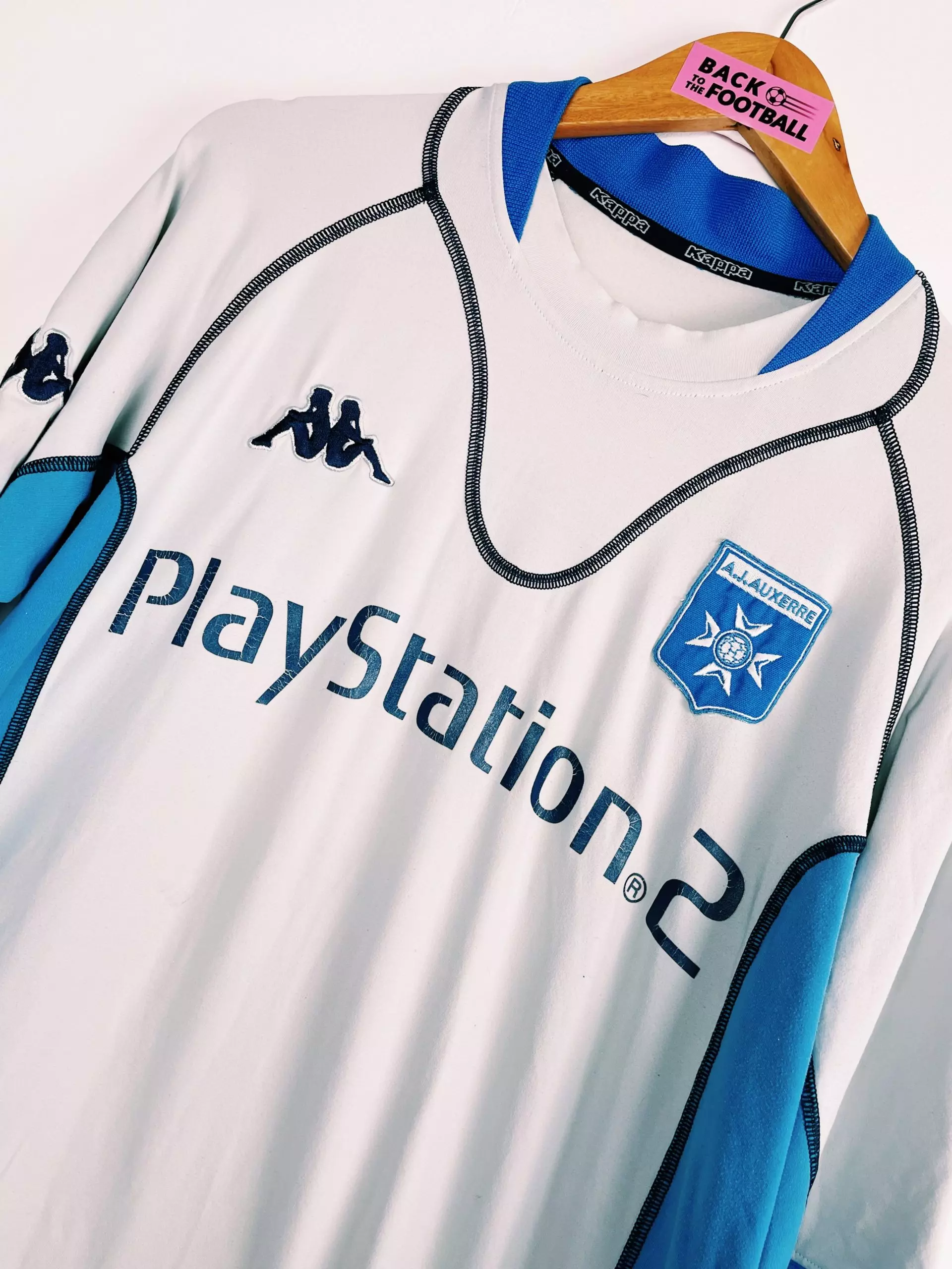 Taille : XL, le lycra taille très proche du corps Etat : 7/10, très bon état général, le flocage de Playstation 2 est craquelé (voir photo) Le maillot : maillot mythique de l’AJ Auxerre 2001/2002. L’écusson et le logo Kappa sont brodés. Le sponsor Playstation 2 est floqué. Le maillot est en lycra. Un rare maillot rétro de l’AJ Auxerre ! Histoire : très grosse saison de l’AJA avec une 3ème place en Ligue 1, derrière Lyon et Lens. Djibril Cissé est en feu avec 22 buts, il finira meilleur buteur du championnat, ex aequo avec Pauleta. Les Auxerrois n’iront…
