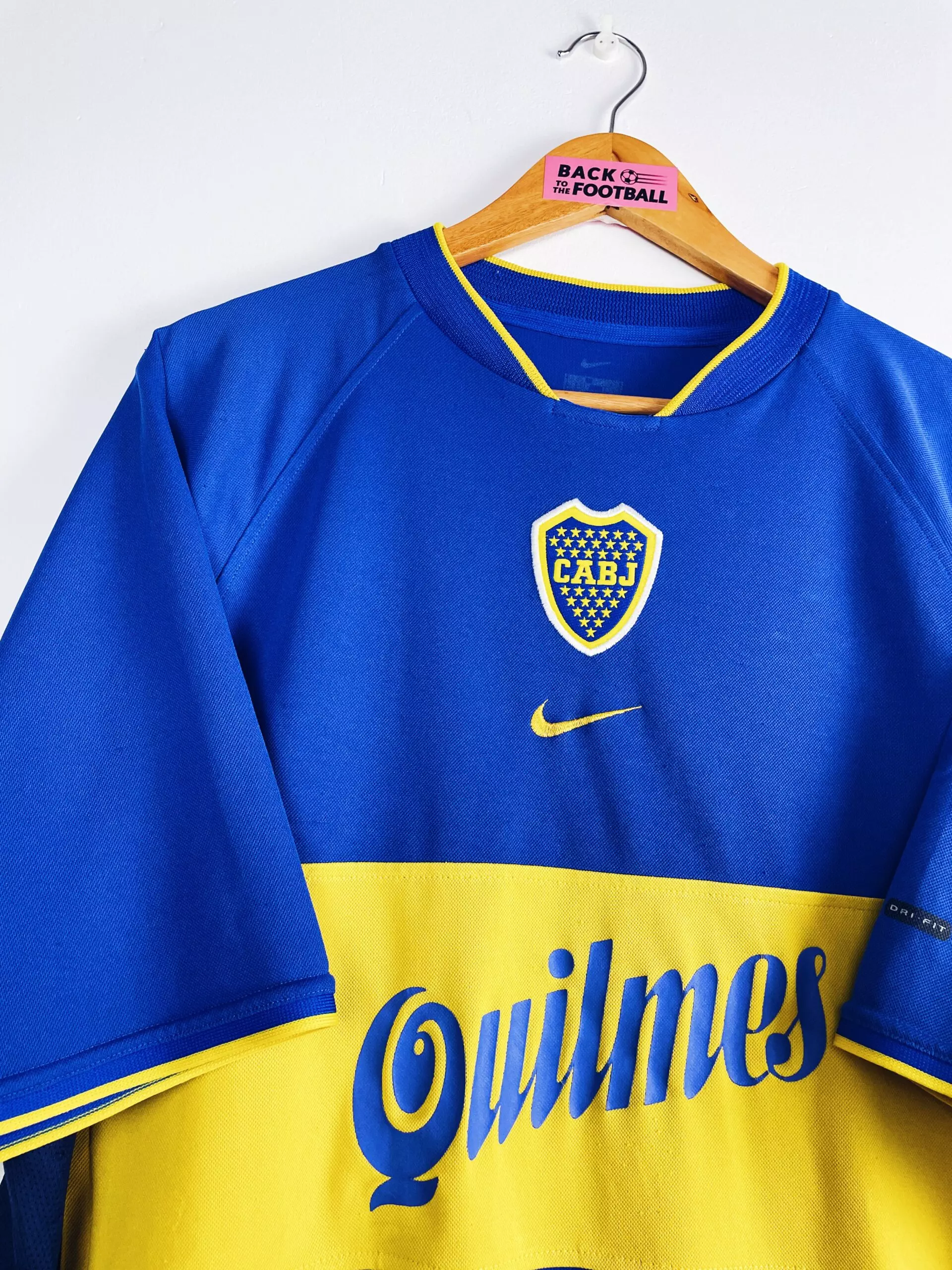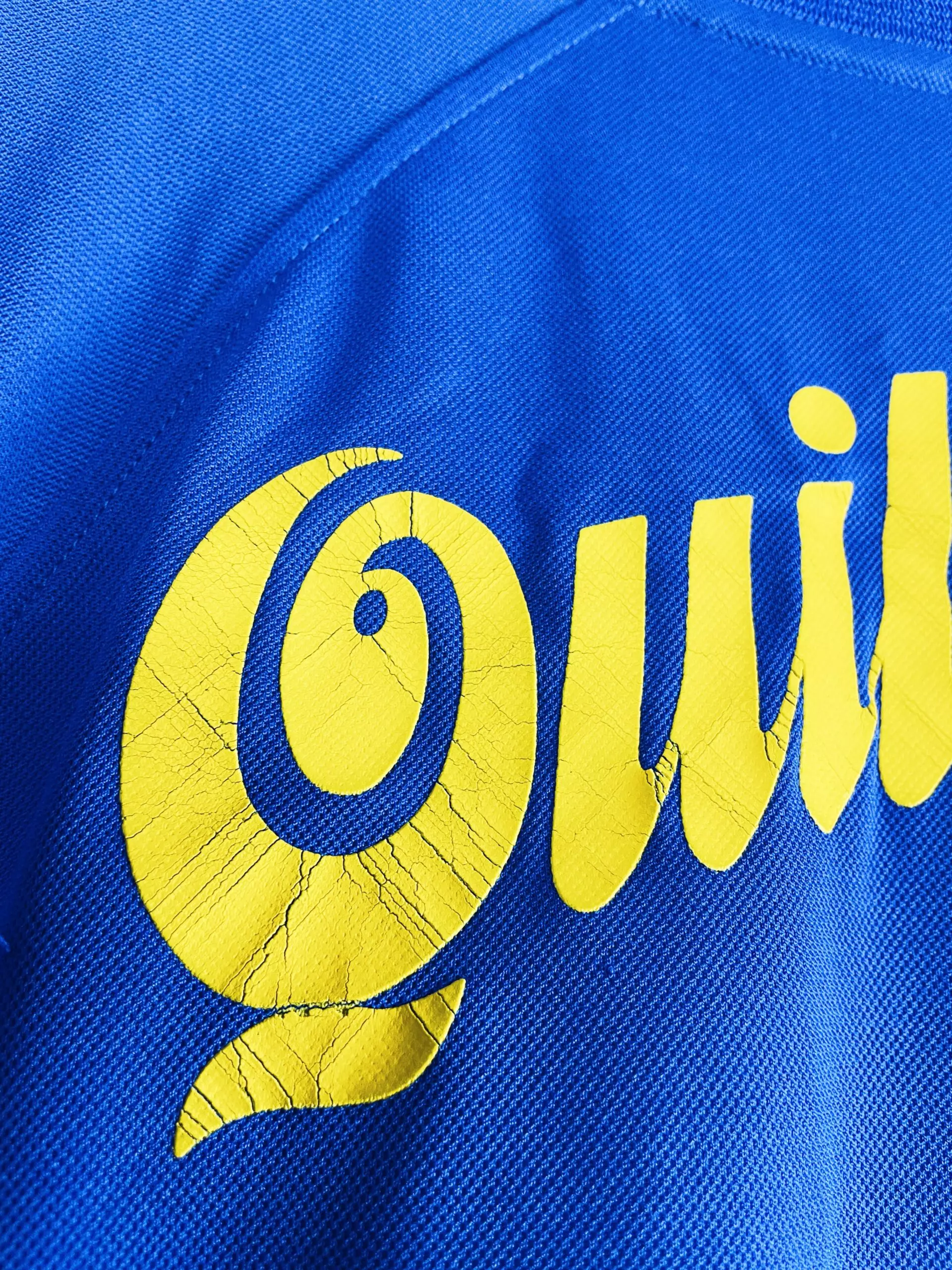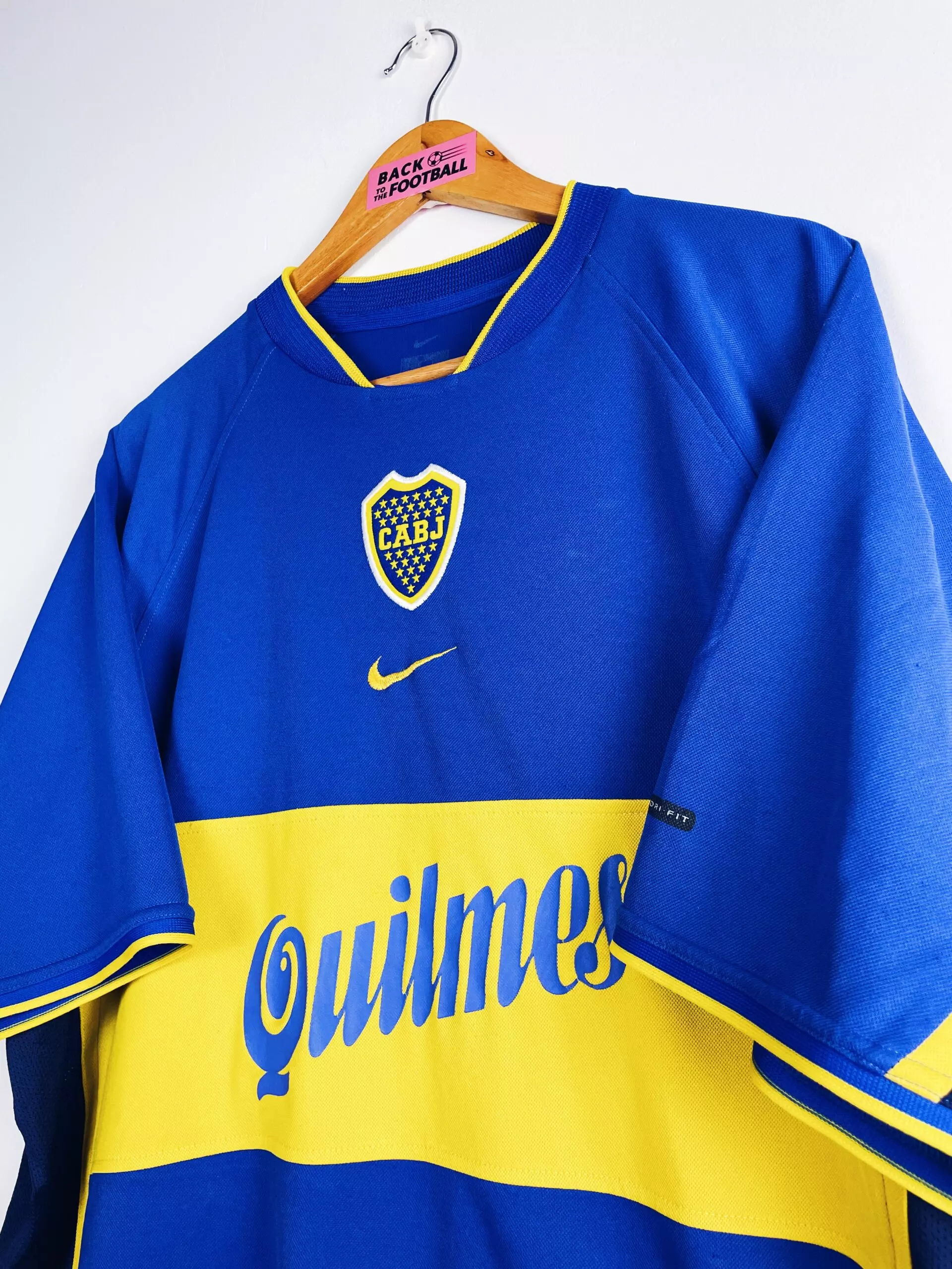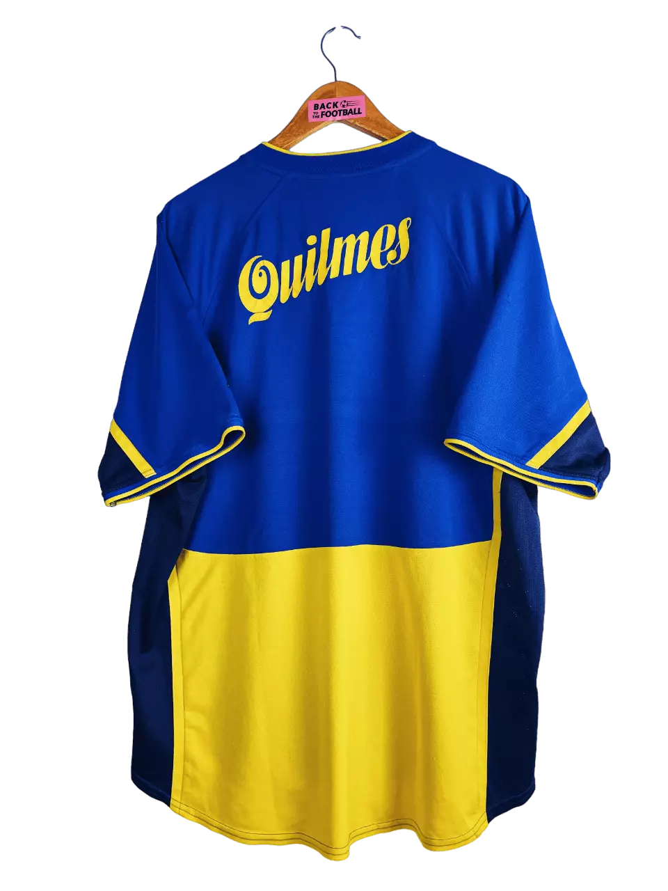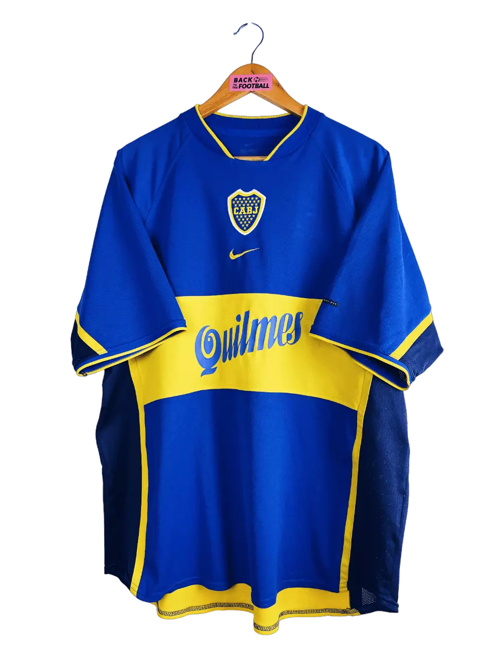 Taille : XL Etat : 8/10, très bon état hormis le sponsor Quilmes dans le dos qui est abimé, et quelques bouloches dans le dos (voir photos) Le maillot : maillot vintage domicile du Boca Juniors 2001/2002. L’écusson et le logo Nike sont brodés, le sponsor Quilmes est floqué. Le sponsor Quilmes est floqué. Très beau maillot rétro de Boca Juniors ! Histoire : le maillot a été fabriqué spécialement pour la Coupe Intercontinale à Tokyo. Les argentins s’inclineront 1-0 dans les prolongations face au Bayern Munich. Ils finiront à la 3ème place du tournoi d’ouverture et de fermeture. Ils…