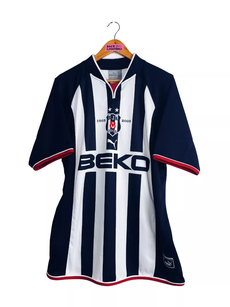 Taille : S mais taille grand, plutôt un M Etat : neuf avec étiquette d’origine Le maillot : très beau maillot vintage du Beşiktaş Istanbul, spécial Centenaire pour la saison 2002/2003. Tous les éléments sont incrustés au maillot. Le maillot est neuf avec l’étiquette d’origine. Histoire : très belle saison pour les turques qui gagneront la Süper Lig, 8 points devant Galatasaray. Ils iront jusqu’en quart de finale de la coupe UEFA où ils buteront contre la Lazio. İlhan Mansız sera le meilleur buteur avec 14 buts cette saison.