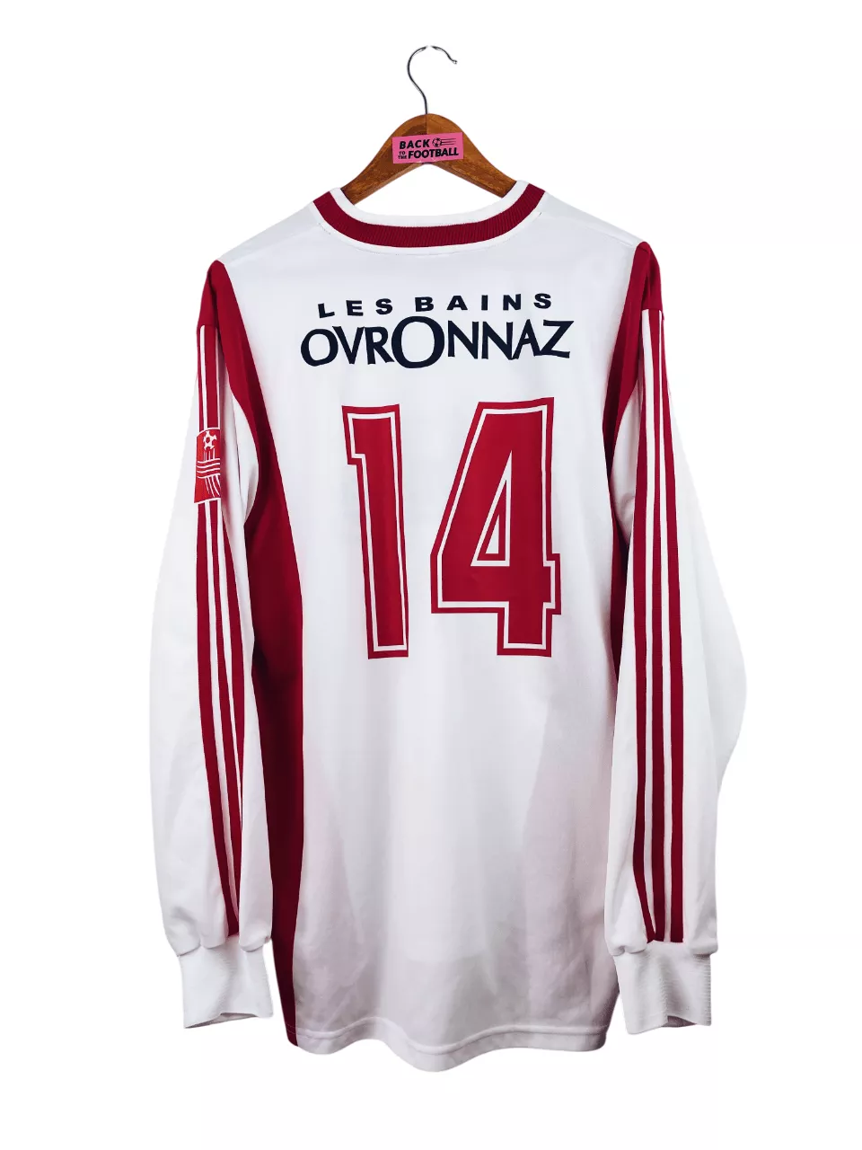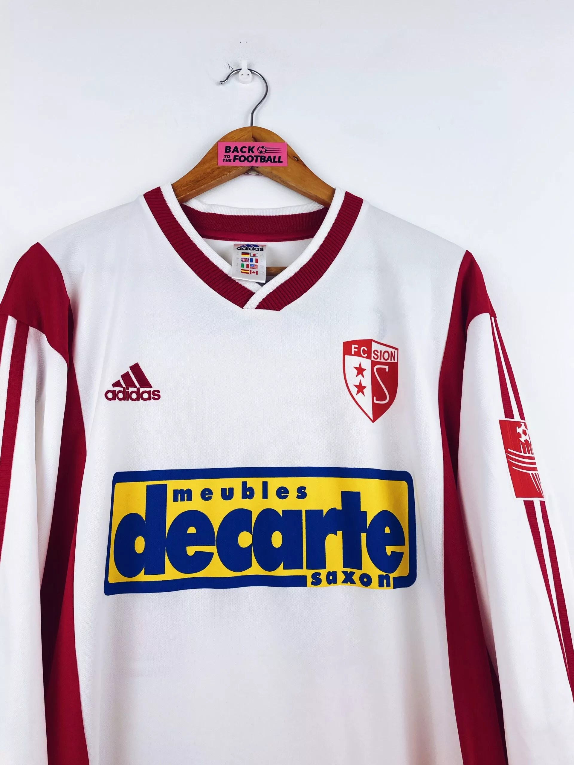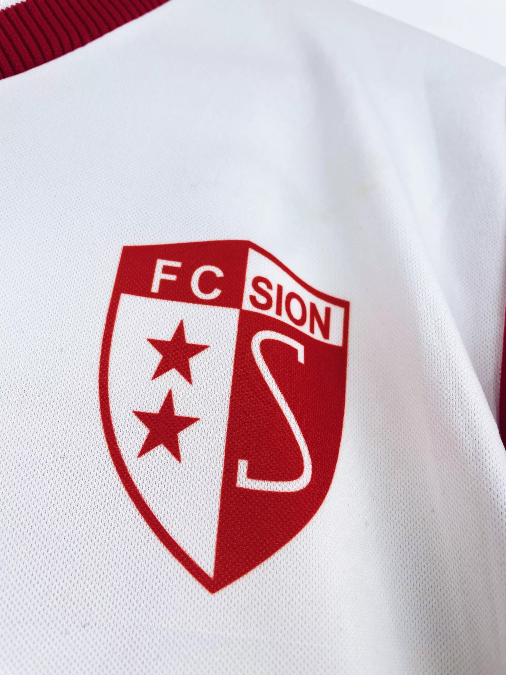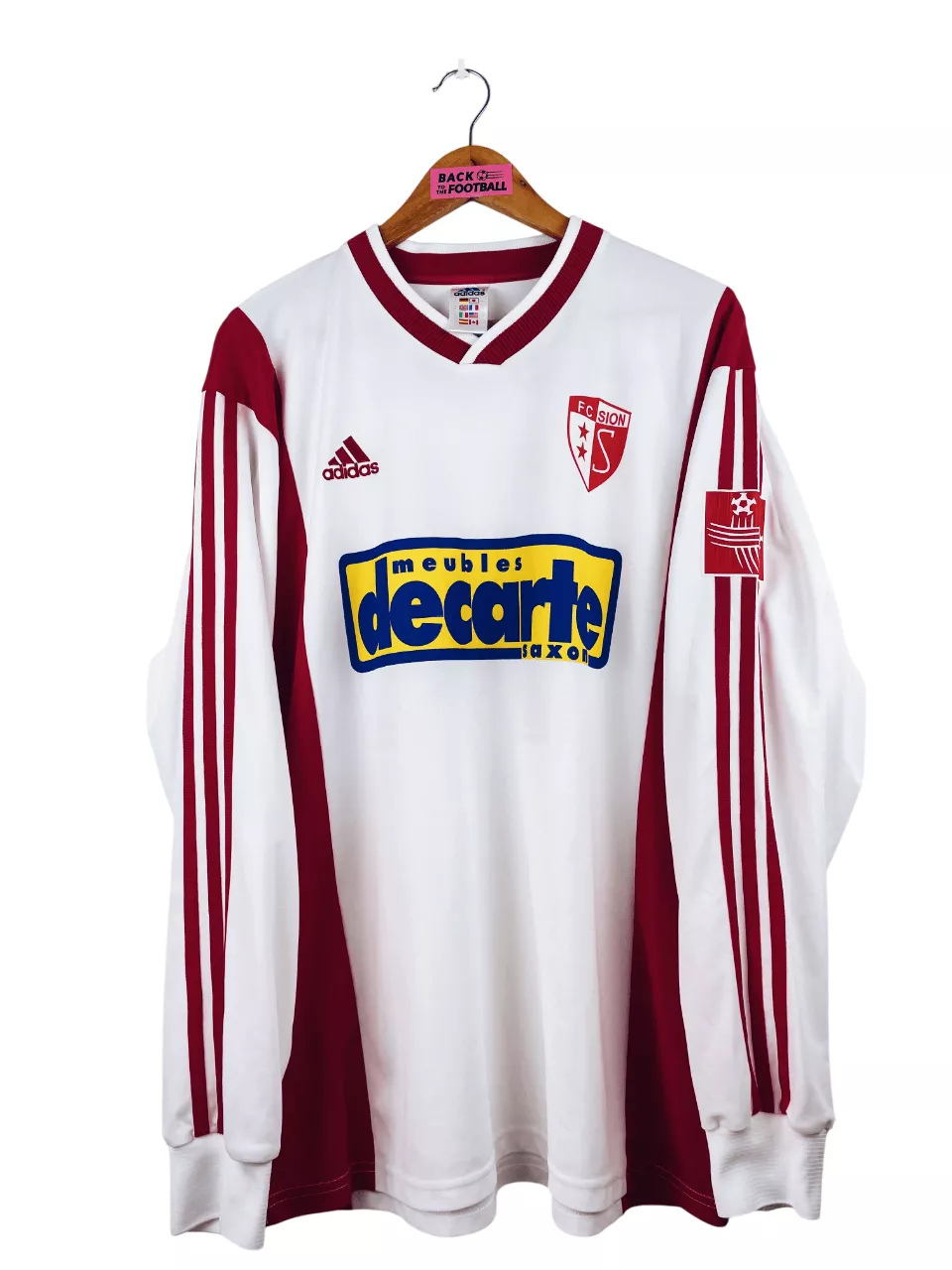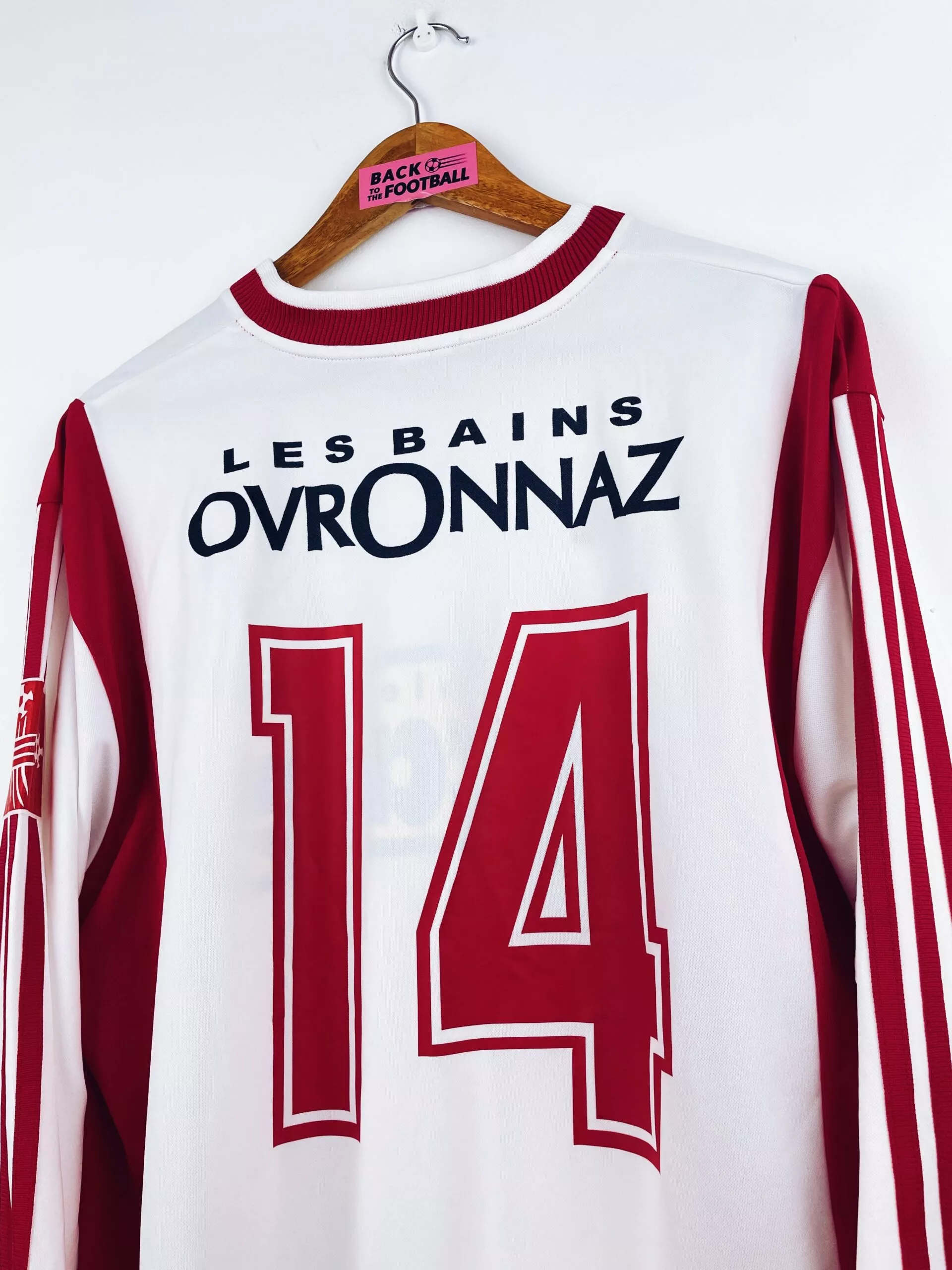 Taille : XL Largeur : 58cm (aisselle à aisselle) Longueur : 75cm (base du col au bas) Si tu veux plus de détails, tu peux nous contacter par mail ou sur les réseaux 😉 Etat : 8.5/10 excellent état Le maillot : maillot vintage domicile FC Sion 2002/2003 manches longues préparé (match issue) pour le numéro 14. L’écusson est incrusté, le logo Adidas brodé, le sponsor et le numéro 14 floqués. Très beau maillot rétro du FC Sion ! Histoire : alors en D2 suisse, le club termine 2ème du tour préliminaire mais ne parvient pas à se qualifier lors…