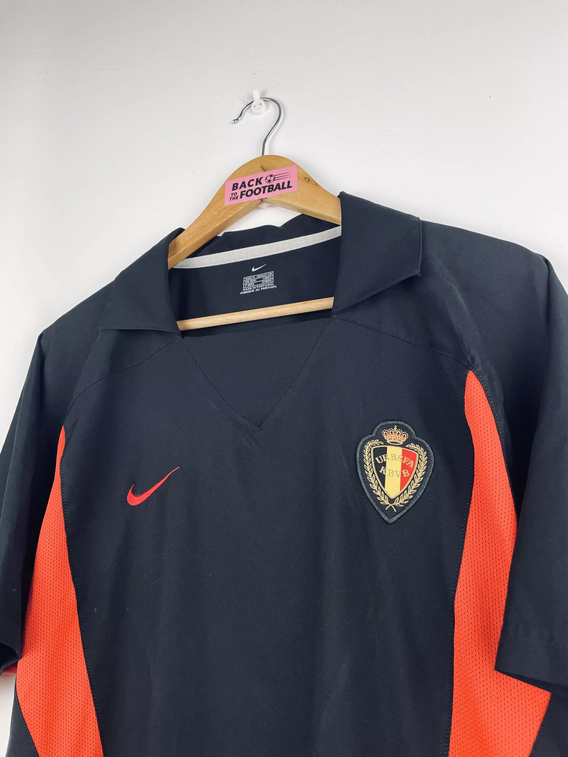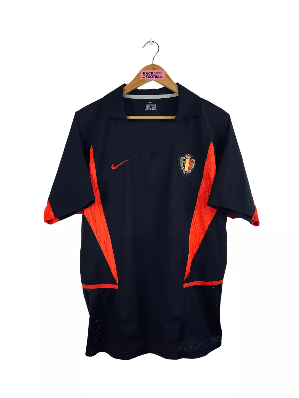 Taille : M Si tu veux plus de détails, tu peux nous contacter par mail ou sur les réseaux 😉 Etat : 8/10, très bon état Le maillot : maillot vintage extérieur de la Belgique 2002. L’écusson et le logo Nike sont brodés. Très beau maillot rétro des Diables Rouges ! Histoire : les Belges se qualifient à la Coupe du Monde 2002 après des barrages contre la Tchéquie. Ils finissent ensuite 2èmes de leur groupe à la CDM, derrière le Japon. Ils seront éliminés en 8èmes contre le Brésil, buts de Rivaldo et Ronaldo. Quelques joueurs : Wilmots, Mpenza,…