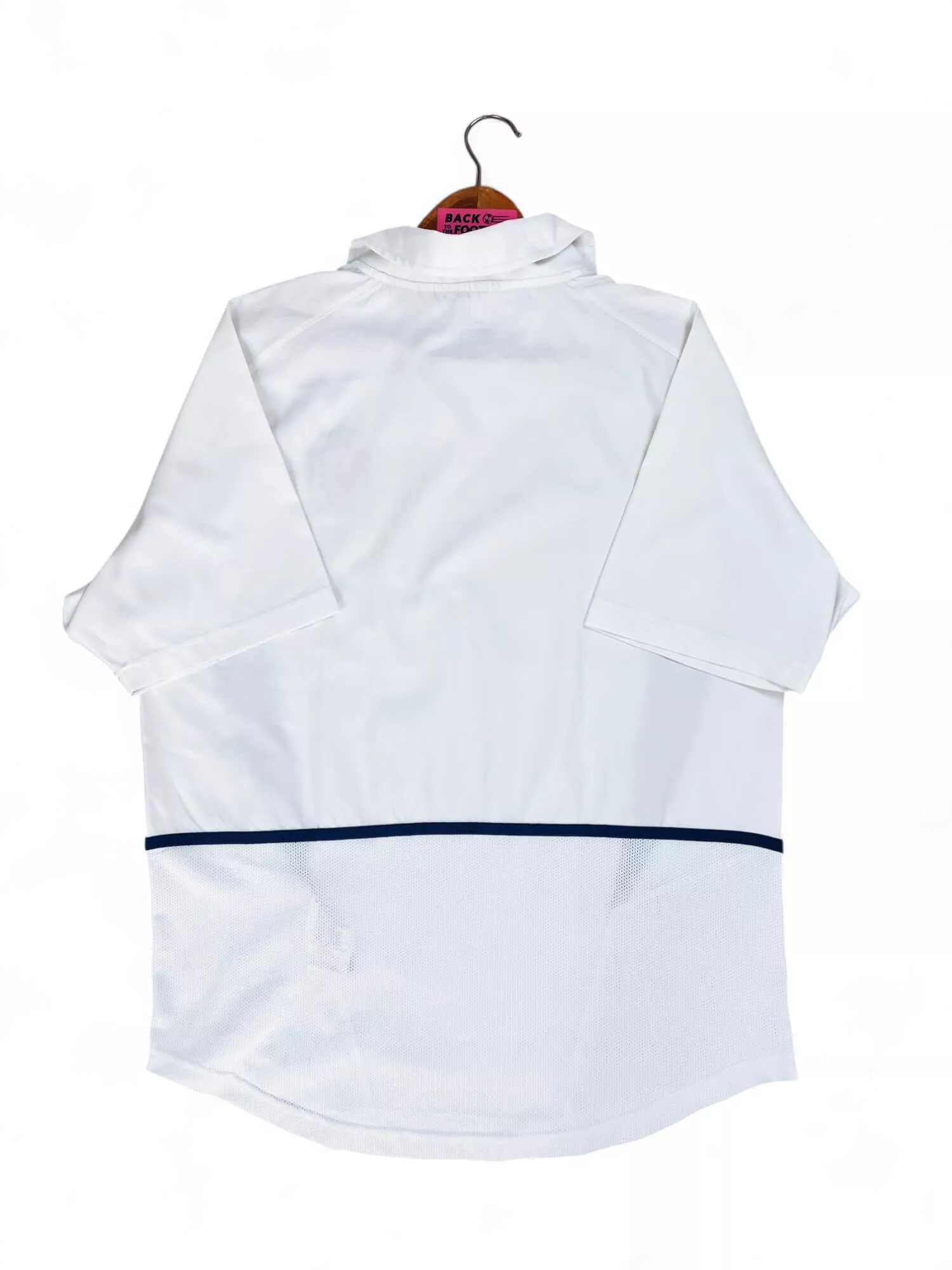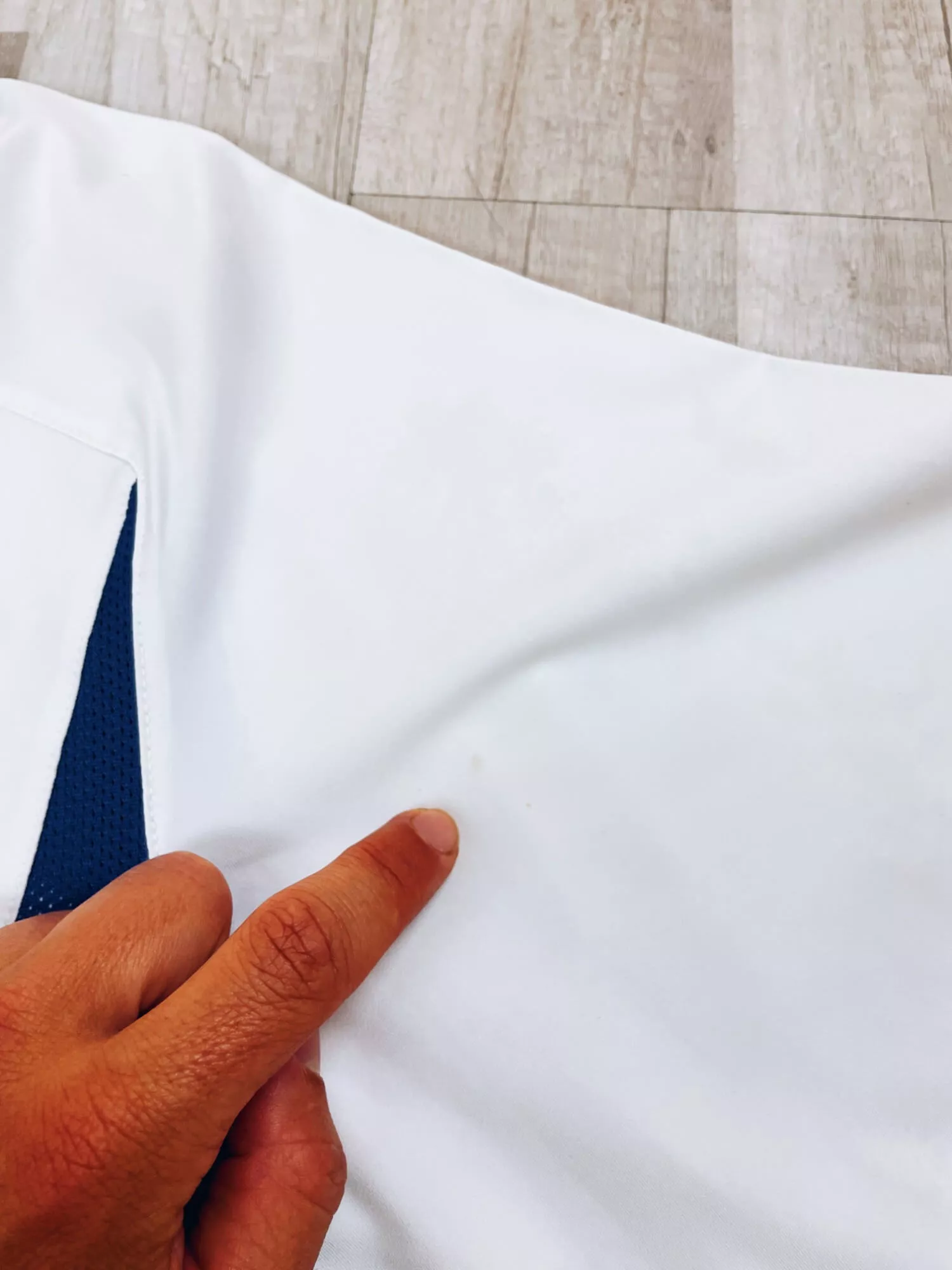 Taille : M Largeur : 54cm (aisselle à aisselle) Longueur : 72cm (base du col au bas) Si tu veux plus de détails, tu peux nous contacter par mail ou sur les réseaux 😉 Etat : 8.5/10, excellent état hormis une mini trace sur la manche (voir photo) Le maillot : maillot vintage extérieur du Portugal 2002. L’écusson et le logo Nike sont brodés. Très beau maillot rétro du Portugal ! Histoire : qualifiés pour la Coupe du Monde 2002, les Portugais sont éliminés dès la phase de groupe, après une victoire et 2 défaites, contre les Etats-Unis et la…
