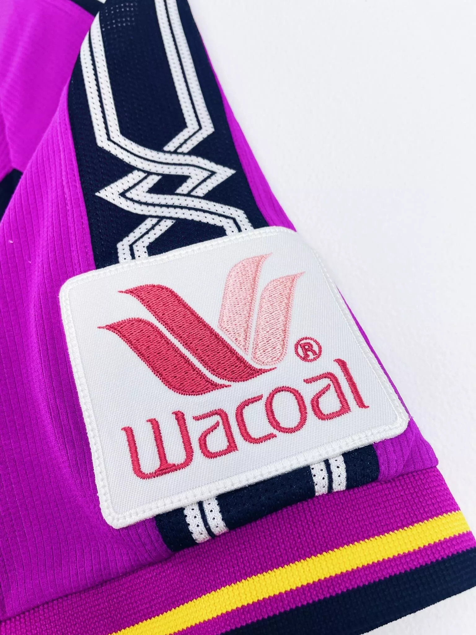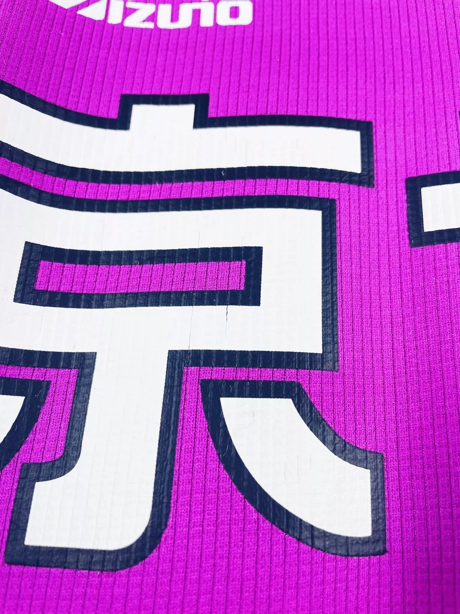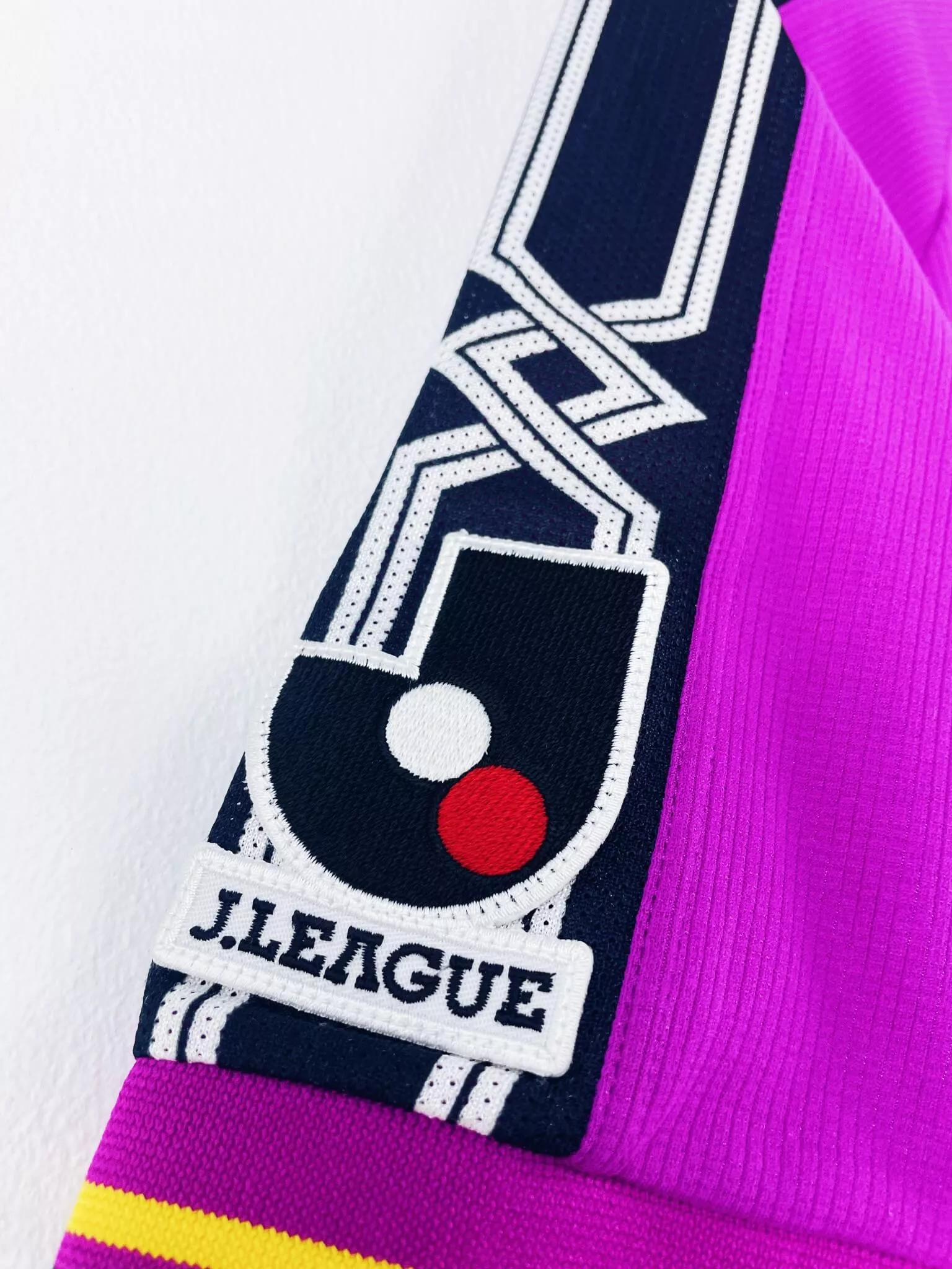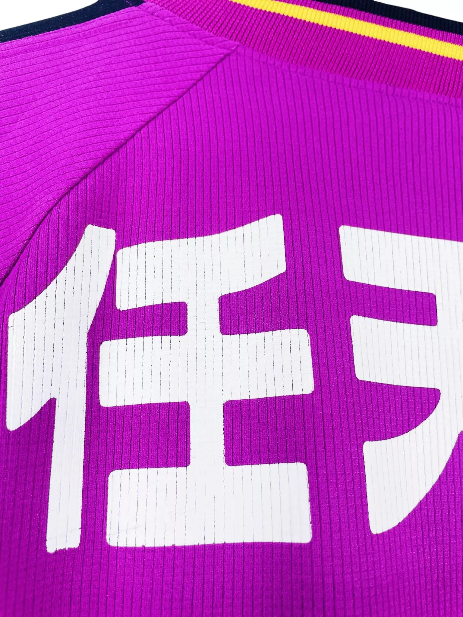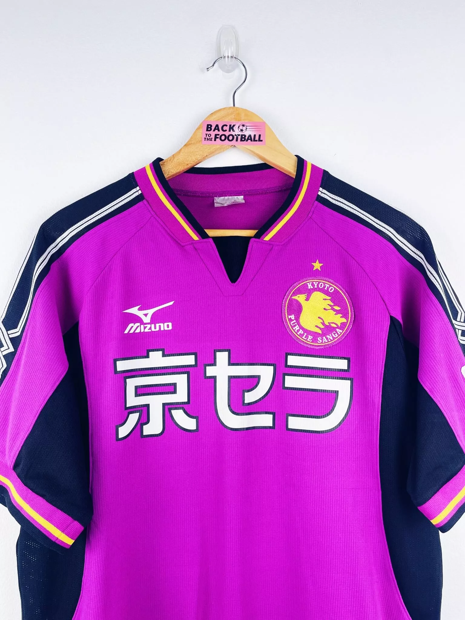 Taille : M Largeur : 53cm (aisselle à aisselle) Longueur : 68cm (base du col au bas) Si tu veux plus d’infos, tu peux nous contacter par mail ou sur les réseaux 😉 Etat : 8.5/10, excellent état, les flocages sont légèrement abimés (voir photos) Le maillot : maillot vintage domicile du Kyoto Sanga 2003/2004. L’écusson est brodé, le logo Mizuno et les sponsors sont floqués, les patchs sur les manches sont brodés. Très beau maillot rétro de Kyoto Sanga ! Histoire : la 1ère saison, le Kyoto Purple Sanga termine 16ème de J. League et est relégué en D2…