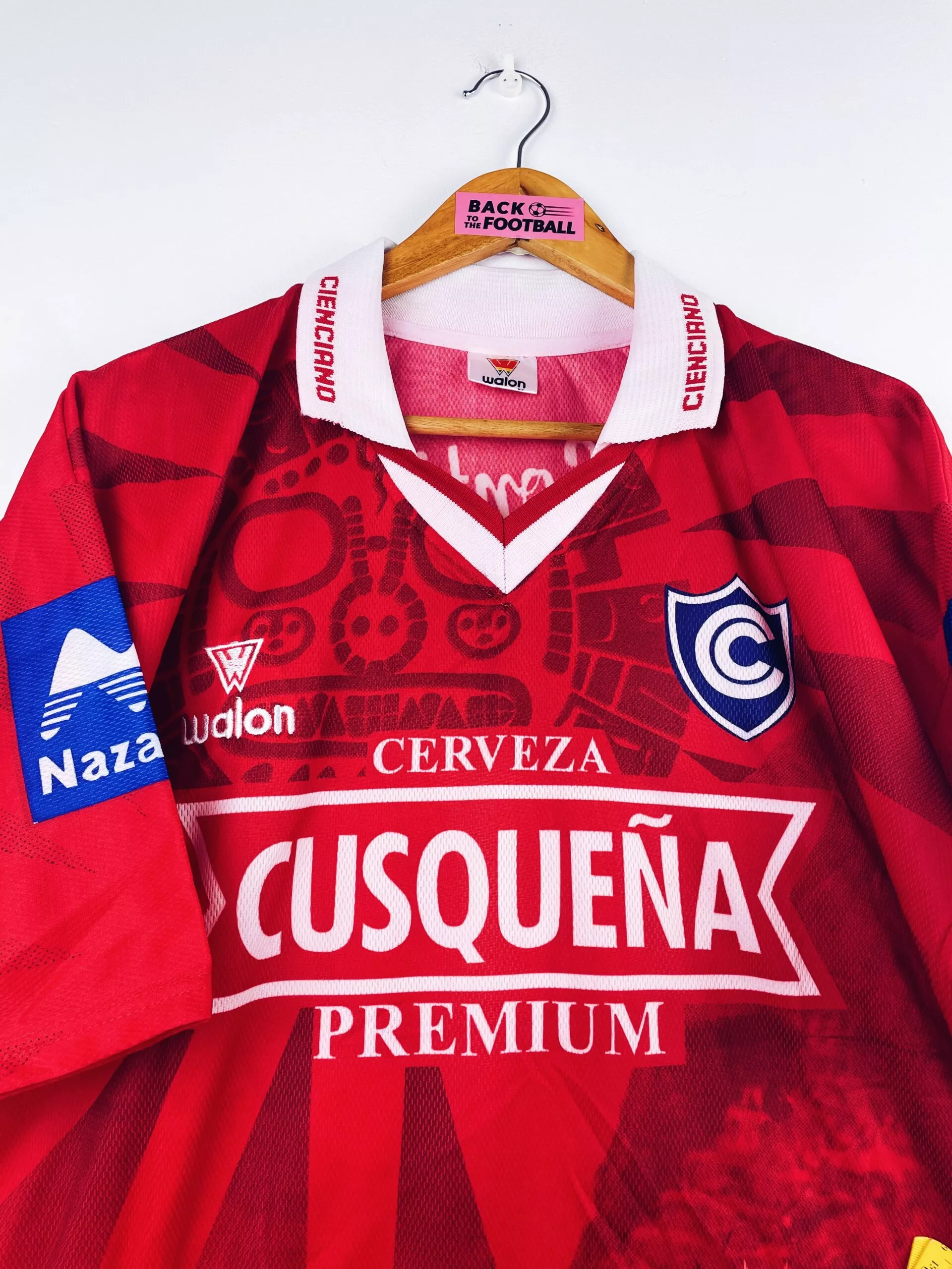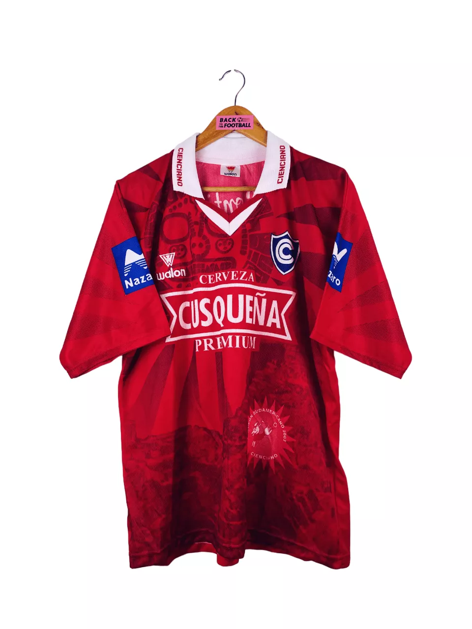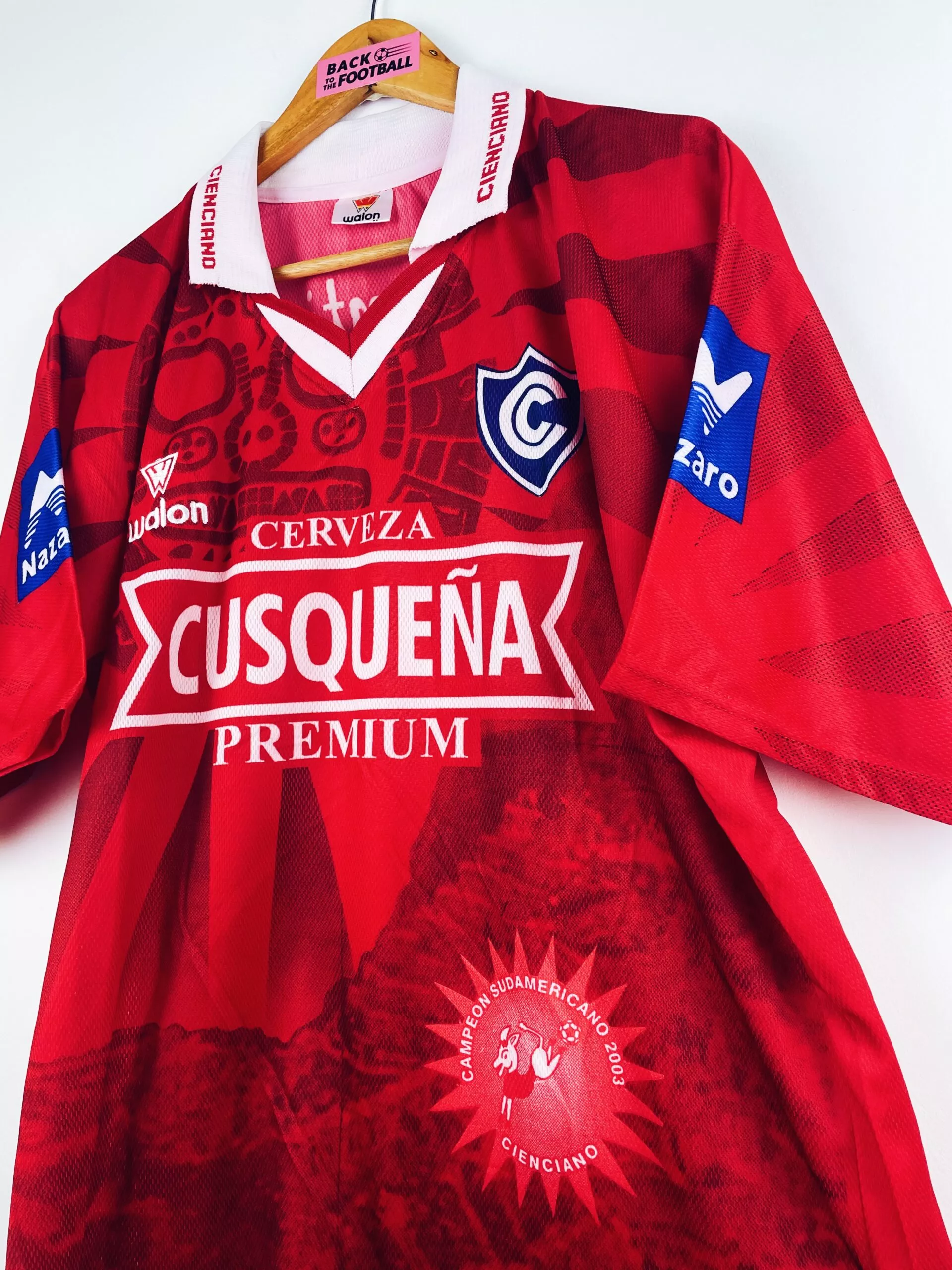 Taille : L Largeur : 55cm (aisselle à aisselle) Longueur : 71cm Etat : 8.5/10, excellent état Le maillot : maillot vintage domicile du Club Cienciano 2003. L’écusson et les sponsors sont incrustés, le logo Walon est brodé. On peut voir le badge de champion incrusté sur le devant. Très beau maillot rétro de Cienciano ! Histoire : Cienciano termine à la 4ème et 8ème place des tournois d’ouverture et de fermeture du championnat péruvien. Mais énorme parcours en Copa Sudamericana. Après avoir éliminé Santos en quart, l’Atlético Nacional en demi, ils viennent à bout de River Plate en finale…