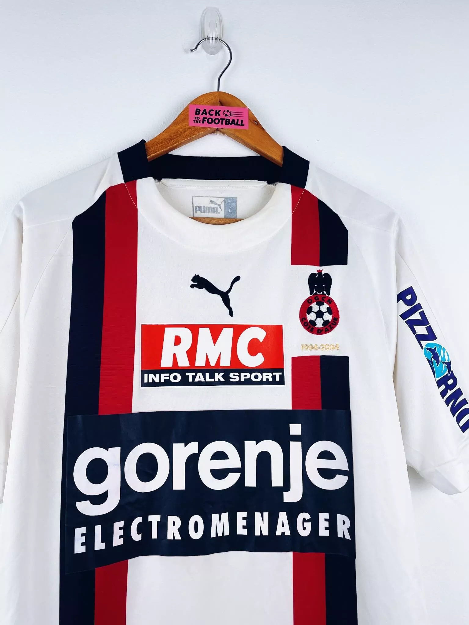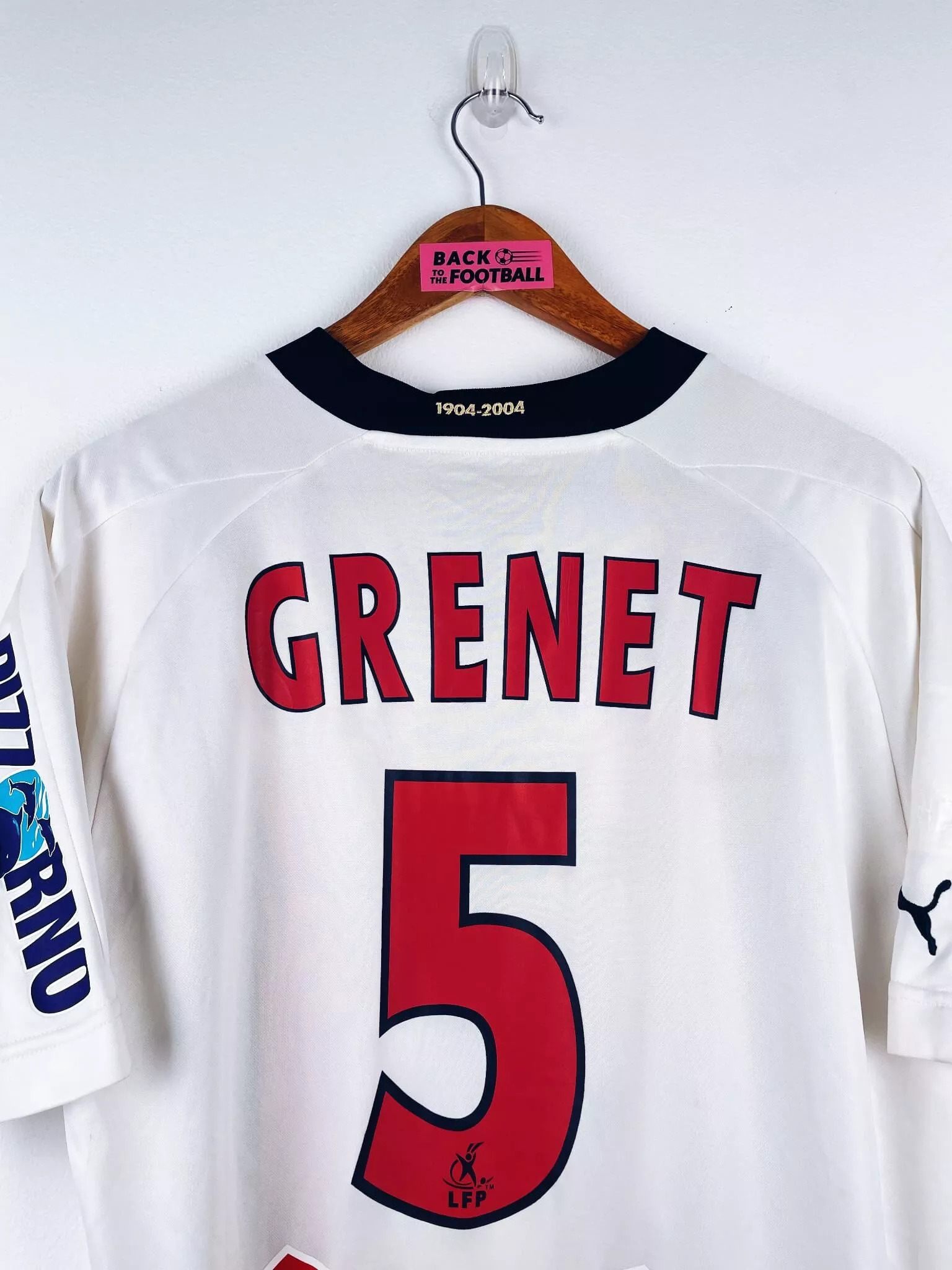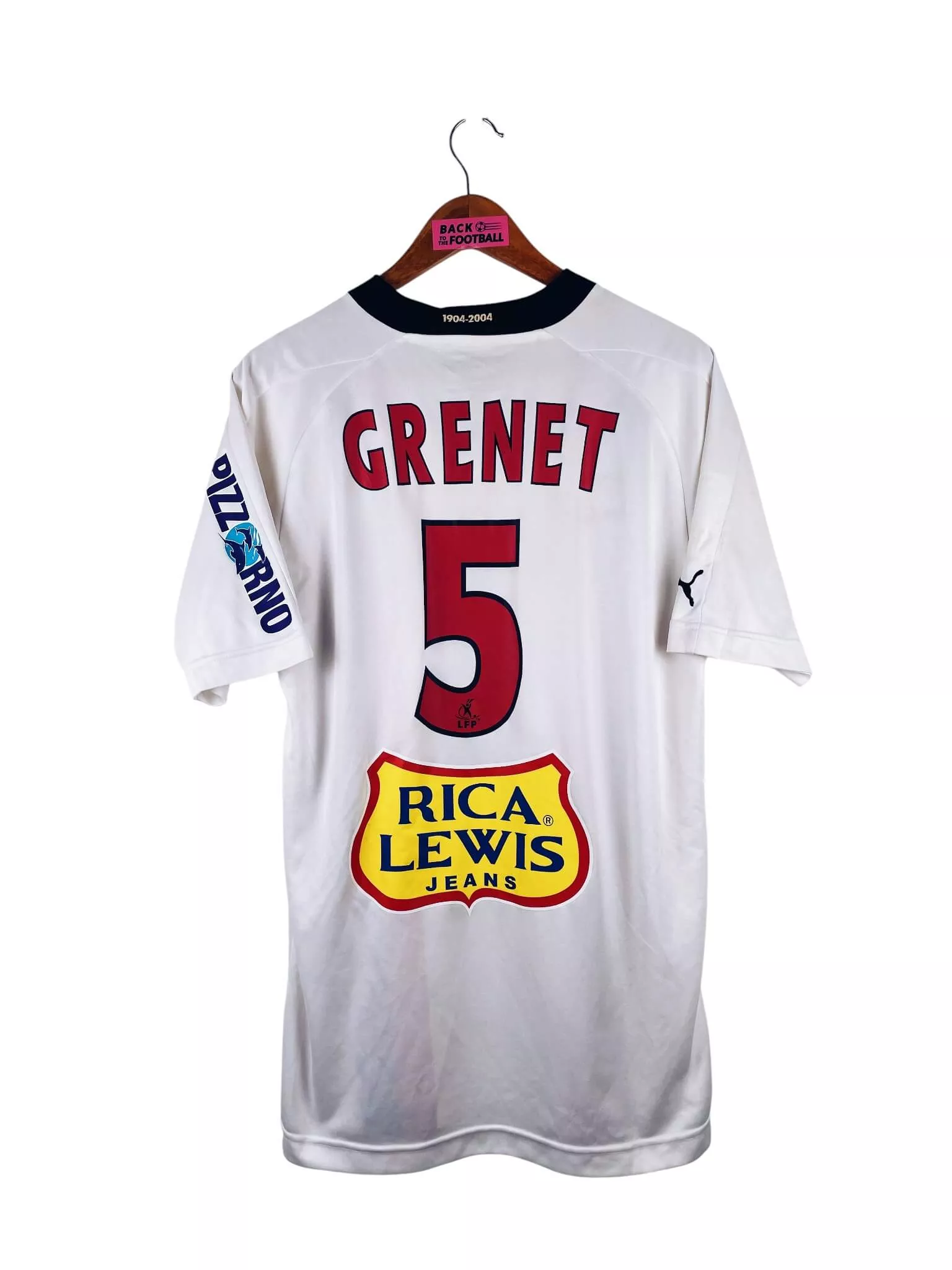 Taille : L Largeur : 53cm (aisselle à aisselle) Longueur : 76cm (base du col au bas) Si tu veux plus d’infos, tu peux nous contacter par mail ou sur les réseaux 😉 Etat : 7/10, très bon état mais des légères traces du match, le patch LFP s’est enlevé (voir photos) Le maillot : maillot vintage extérieur OGC Nice 2004/2005 porté (match worn) par Grenet #5 : sponsors additionnels, patch LFP et flocage officiels. L’écusson et le logo Puma sont brodés, les sponsors et Grenet #5 sont floqués, le patch LFP est thermocollé. Maillot récupéré via la collection du…