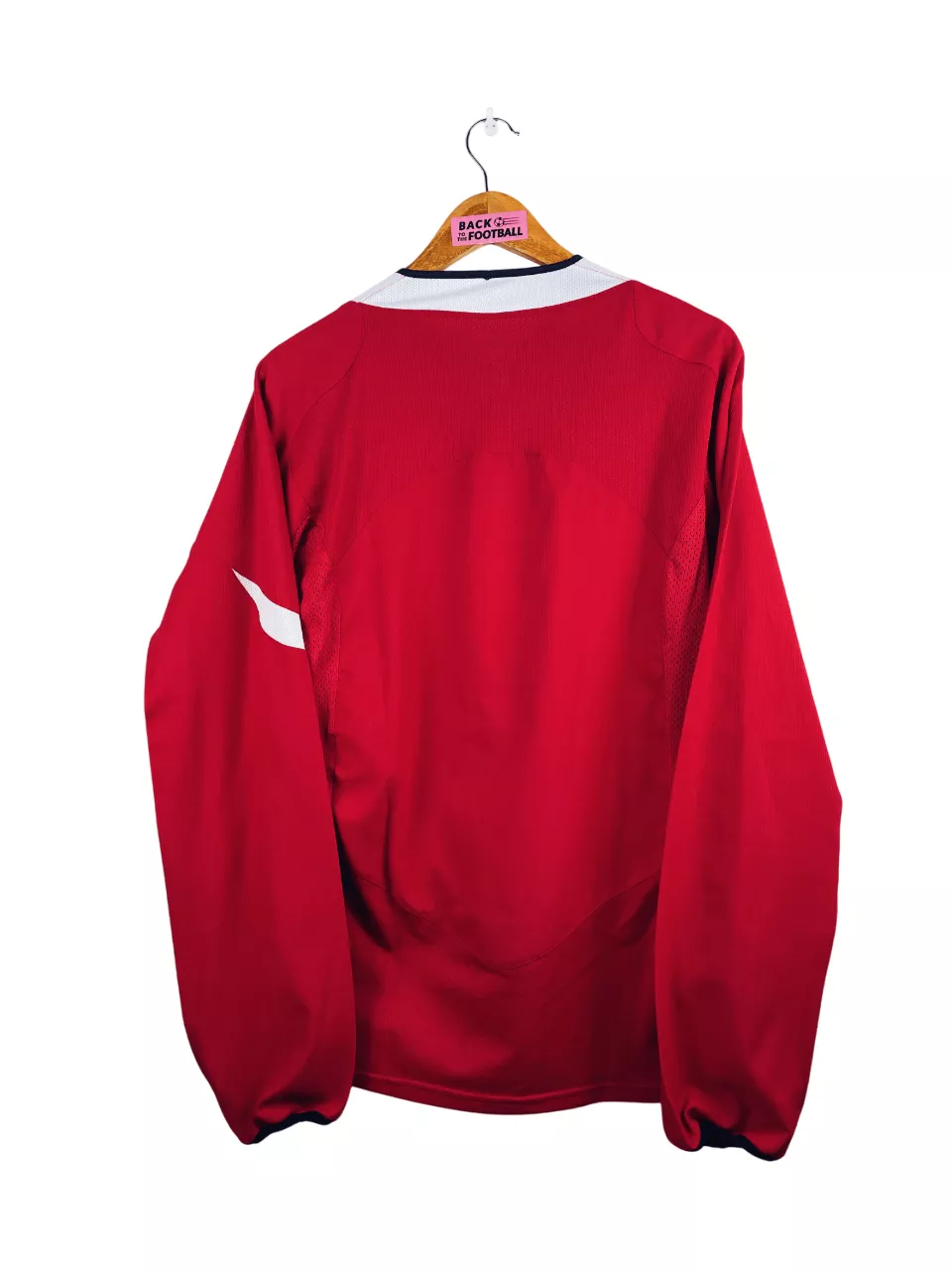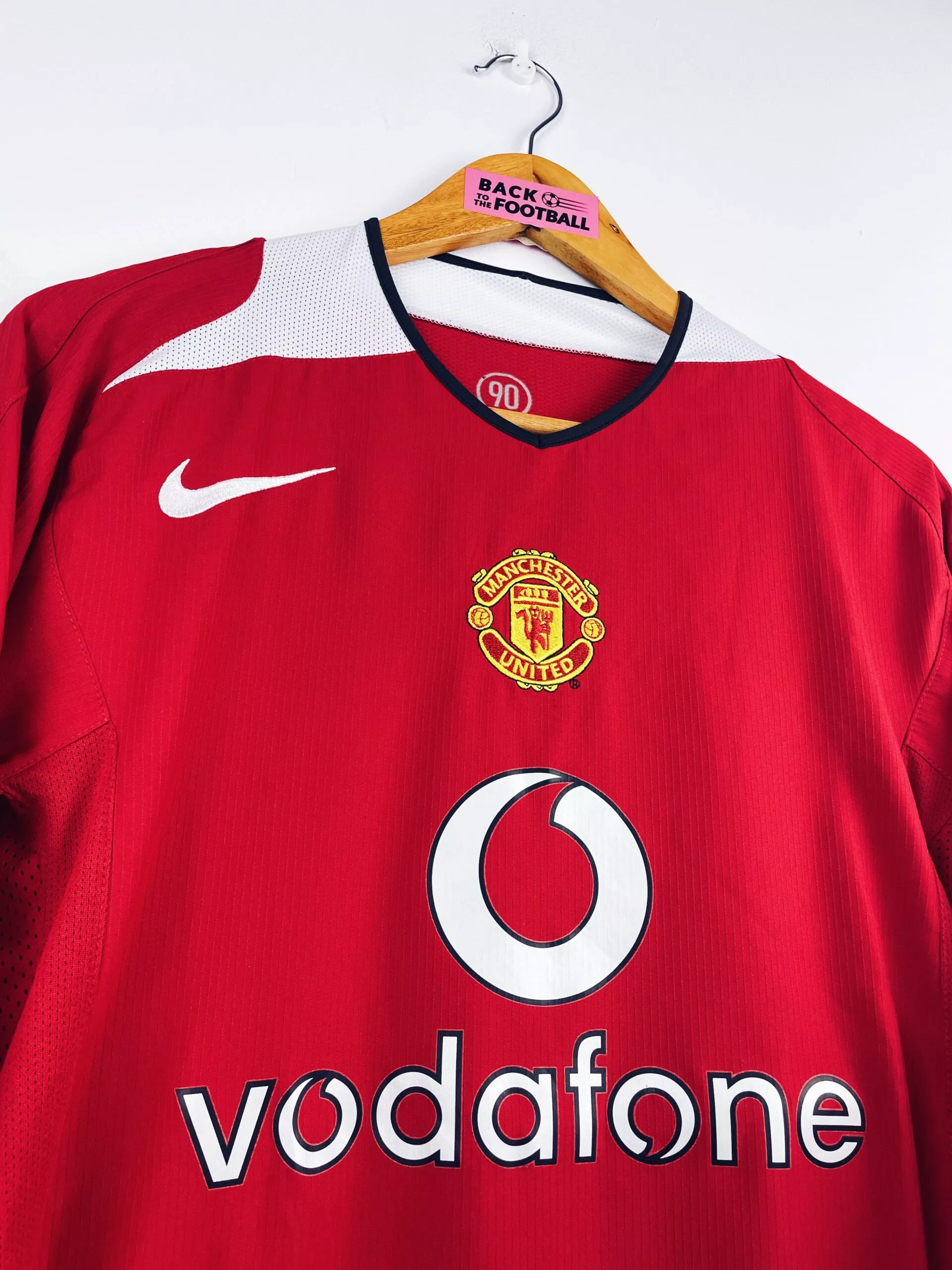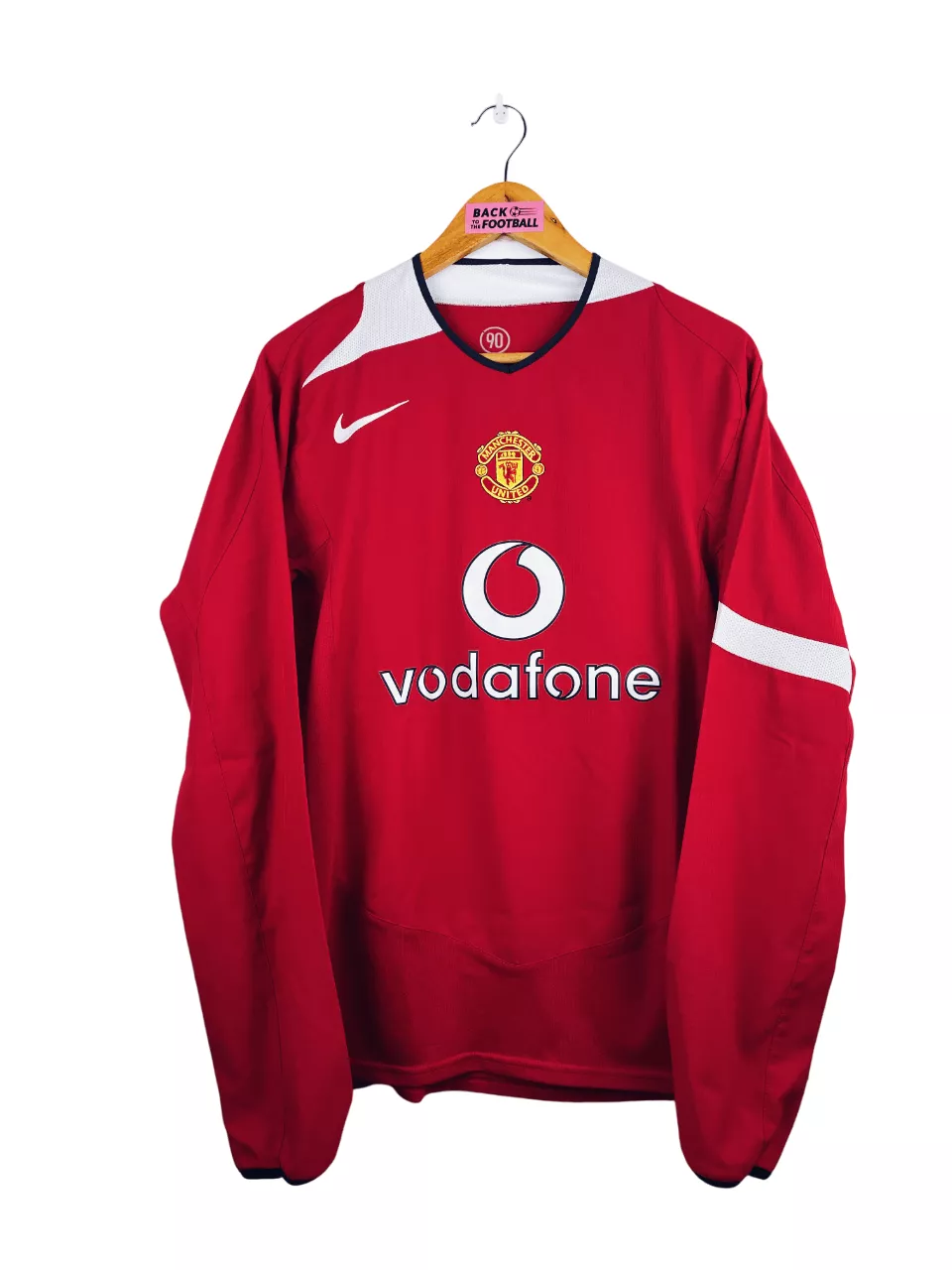 Taille : M Si tu veux plus de détails, tu peux nous contacter par mail ou sur les réseaux 😉 Etat : 8.5/10, excellent état Le maillot : maillot domicile vintage de Manchester United 2004/2006 manches longues. L’écusson des Reds Devils et le logo Nike sont brodés. Le sponsor Vodafone est floqué. Très beau maillot rétro de Manchester United ! Histoire : la première saison, United finit sur le podium de Premier League derrière Chelsea et Arsenal. Ils perdront en finale de coupe contre Arsenal. Rooney marque 17 buts cette saison et est le meilleur buteur du club. La saison…