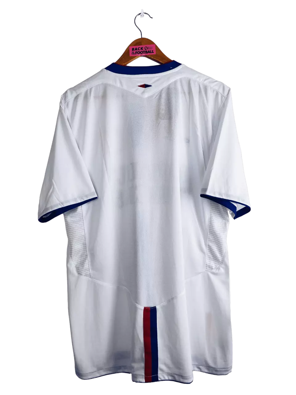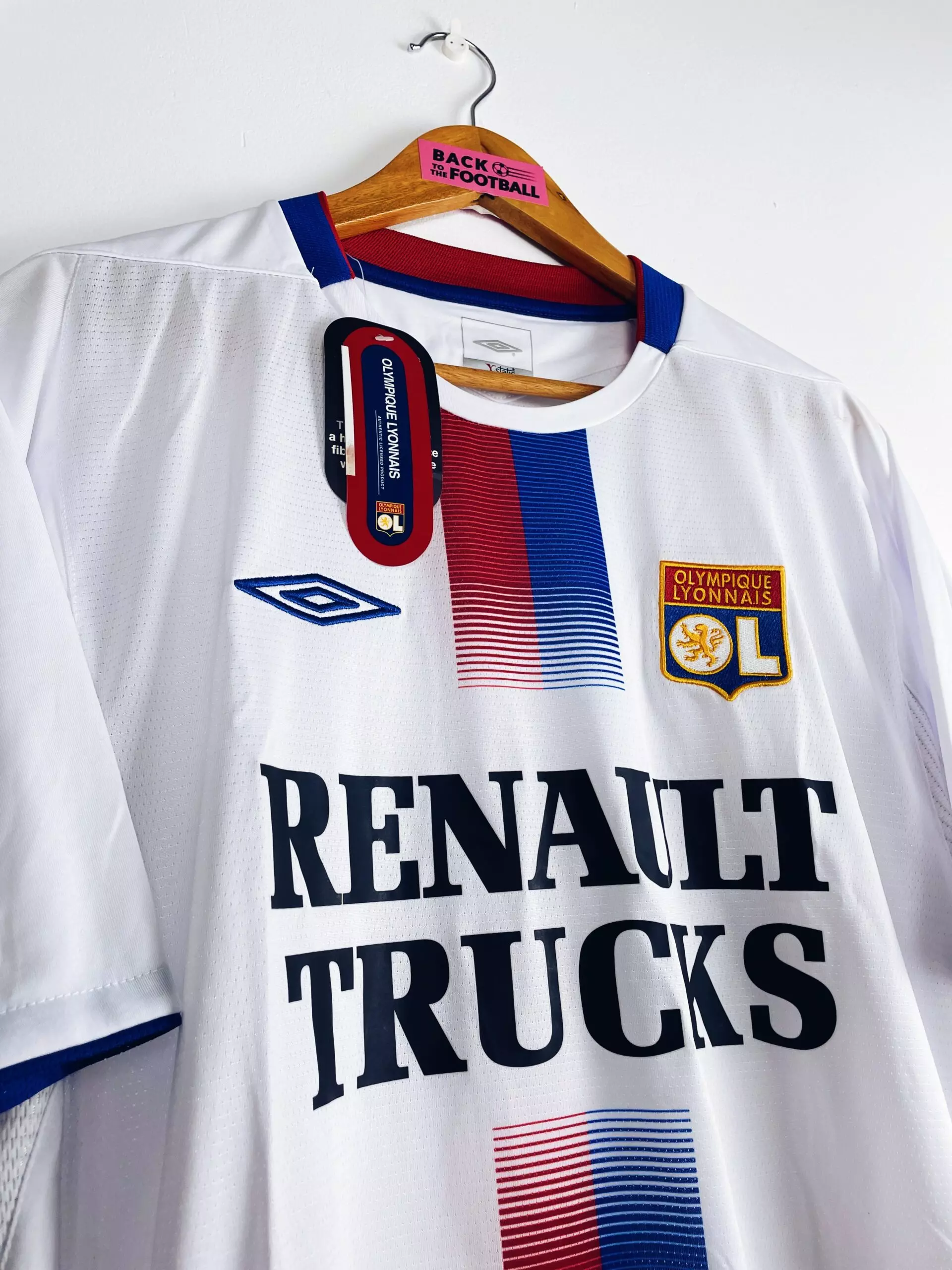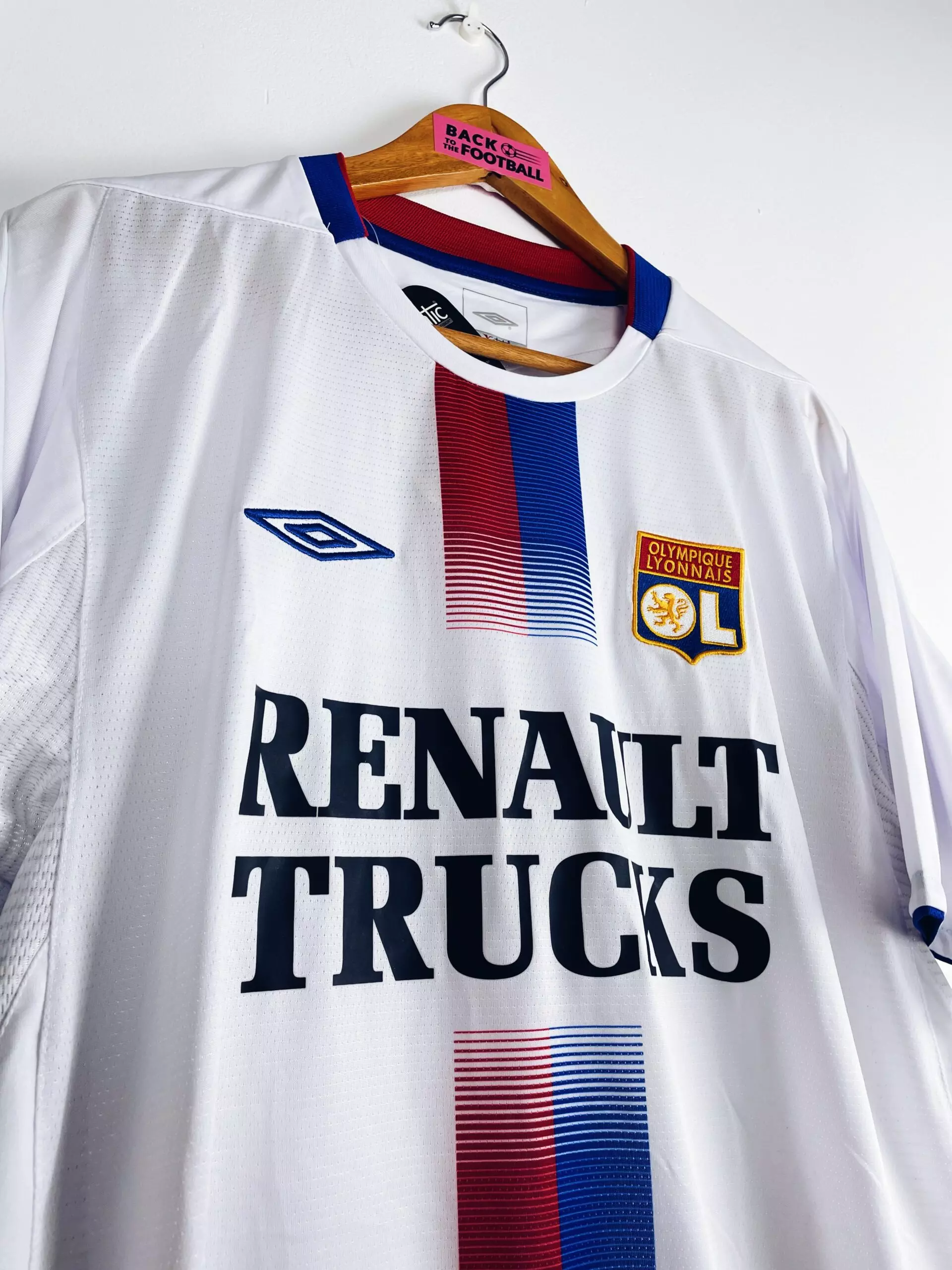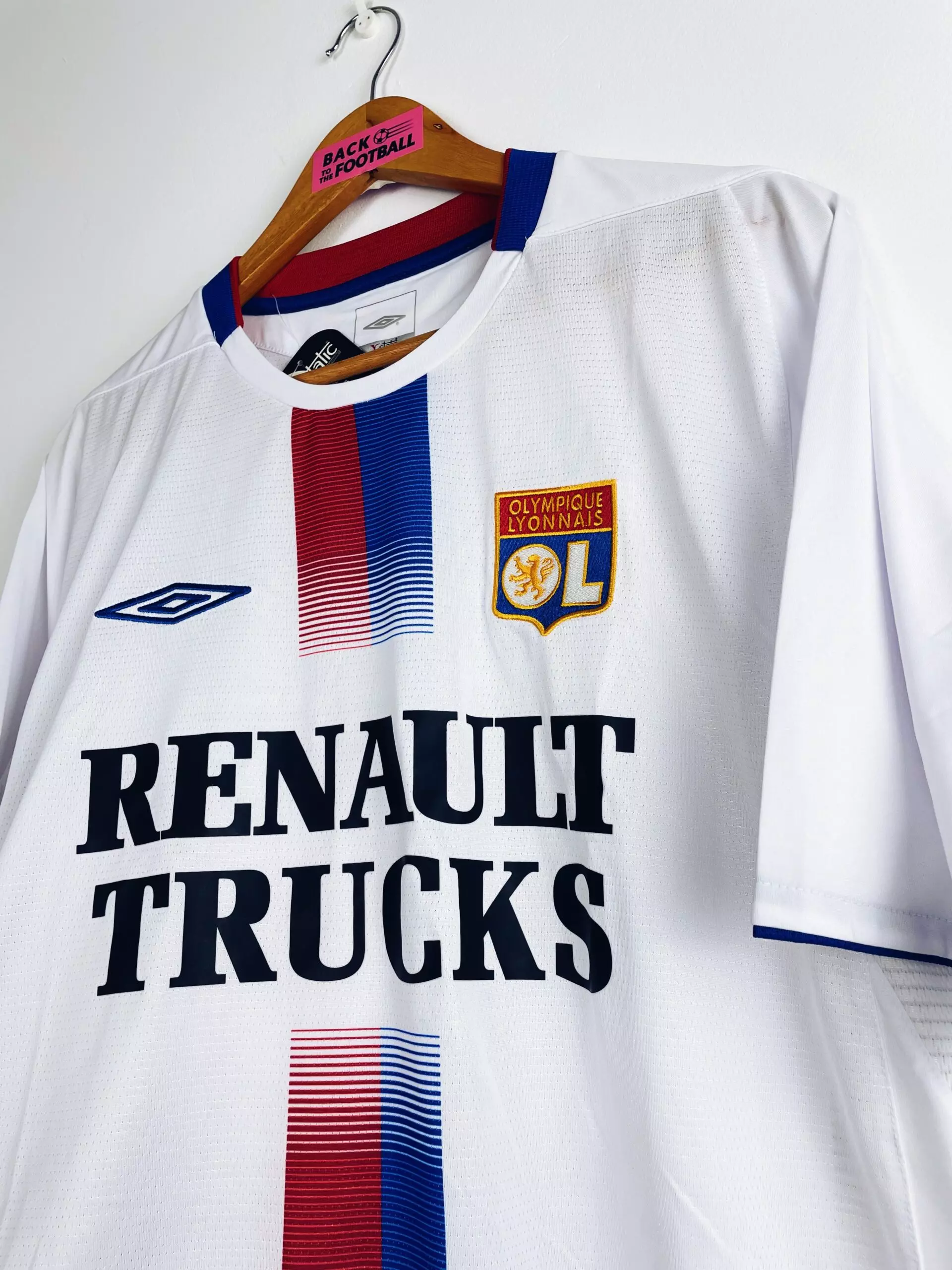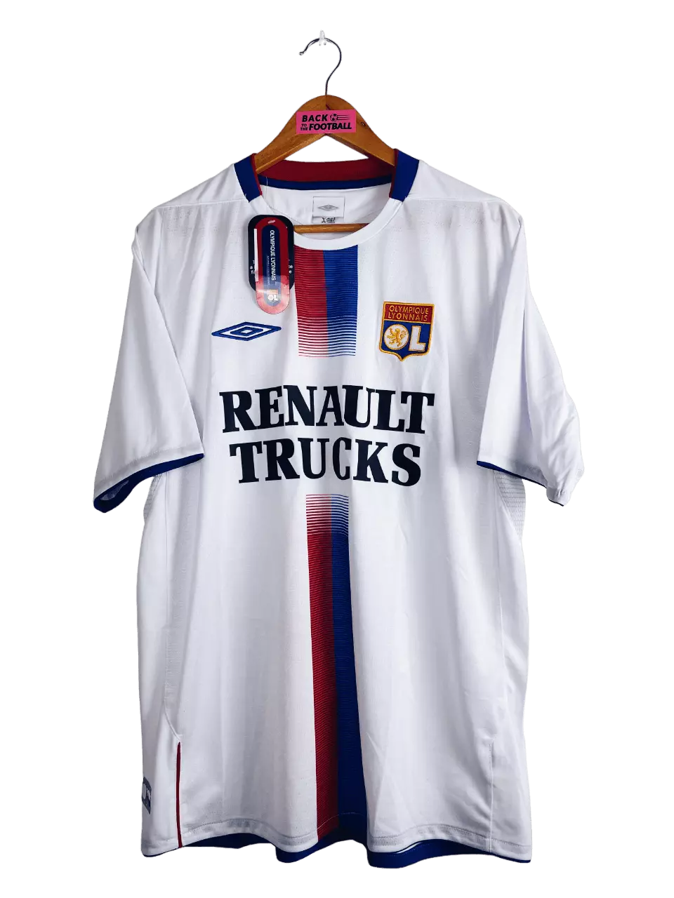 Taille : L Etat : neuf avec étiquettes d’époque (BNWT) Le maillot : maillot vintage domicile de l’Olympique Lyonnais 2004/2006. L’écusson est brodé, le logo Umbro aussi. Le sponsor Renault Trucks est floqué. Magnifique maillot rétro de l’OL ! Histoire : encore 2 très grosses saisons pour l’OL de Paul Le Guen avec 2 titres de champion de Ligue 1. La première saison, Les Gones n’iront pas loin en coupes nationales. Par contre ils feront un beau parcours en Ligue des Champions. Ils terminent premiers de leur groupe devant Manchester United, Fenerbahce et le Sparta Prague. En huitièmes, ils éliminent…