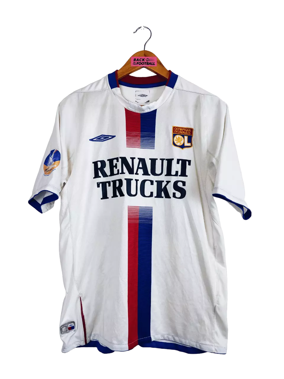 Taille : M Etat : 6/10. Le col a été renforcé, le flocage joueur est légèrement abimé et il y a une petite trace (voir photos). Le maillot : maillot vintage domicile de l’Olympique Lyonnais 2004/2006 floqué Sylvain Wiltord. L’écusson est brodé, le logo Umbro aussi. Le sponsor Renault Trucks est floqué. Magnifique maillot rétro de l’OL ! Histoire : encore 2 très grosses saisons pour l’OL de Paul Le Guen avec 2 titres de champion de Ligue 1. La première saison, Les Gones n’iront pas loin en coupes nationales. Par contre ils feront un beau parcours en Ligue des…