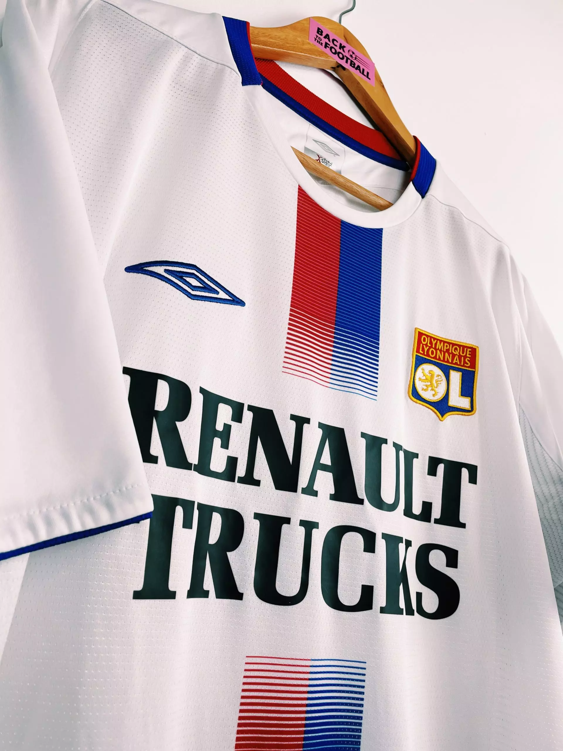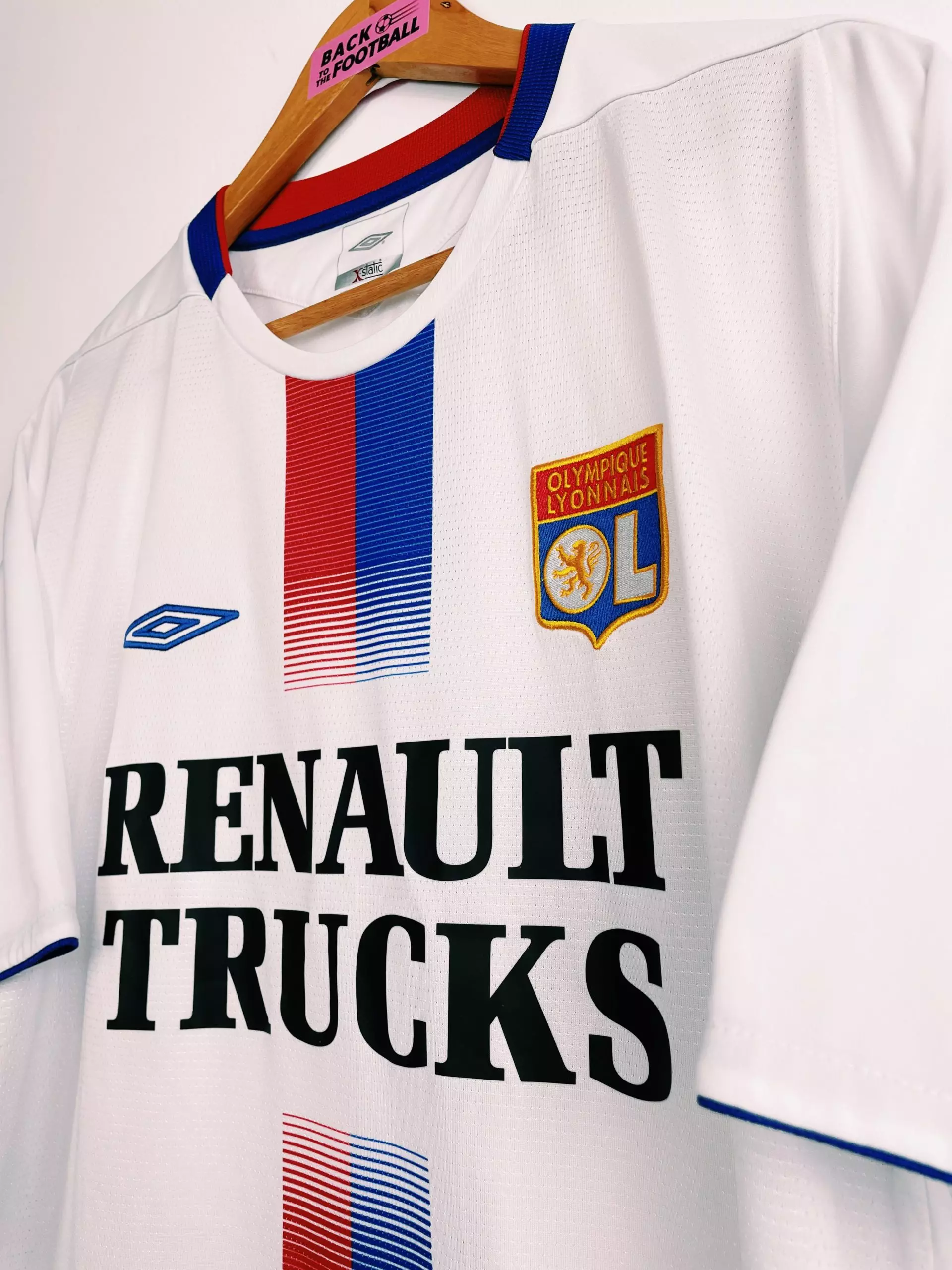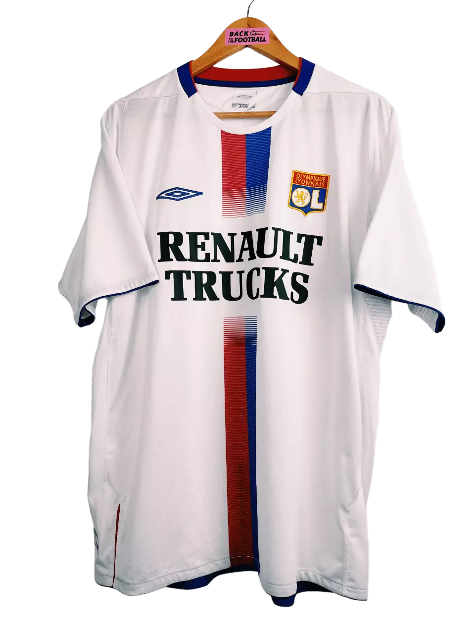 Taille : XL Etat : 8/10, très bon état Le maillot : maillot vintage domicile de l’Olympique Lyonnais 2004/2006. L’écusson est brodé, le logo Umbro aussi. Le sponsor Renault Trucks est floqué. Magnifique maillot rétro de l’OL ! Histoire : encore 2 très grosses saisons pour l’OL de Paul Le Guen avec 2 titres de champion de Ligue 1. La première saison, Les Gones n’iront pas loin en coupes nationales. Par contre ils feront un beau parcours en Ligue des Champions. Ils terminent premiers de leur groupe devant Manchester United, Fenerbahce et le Sparta Prague. En huitièmes, ils éliminent facilement…
