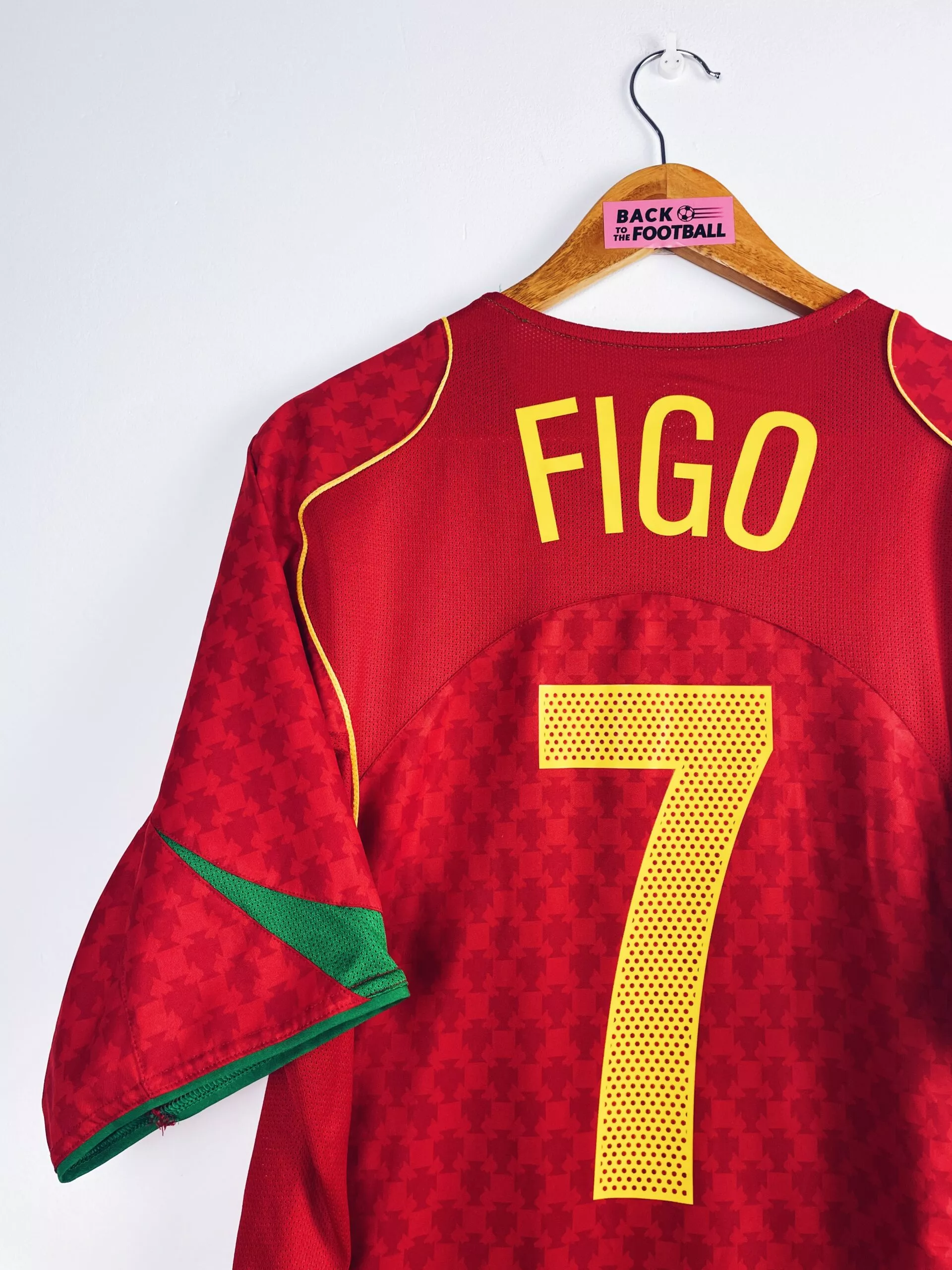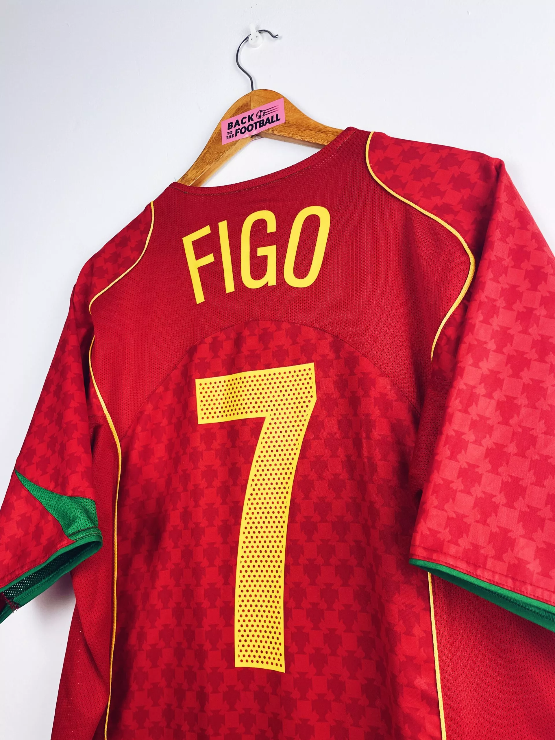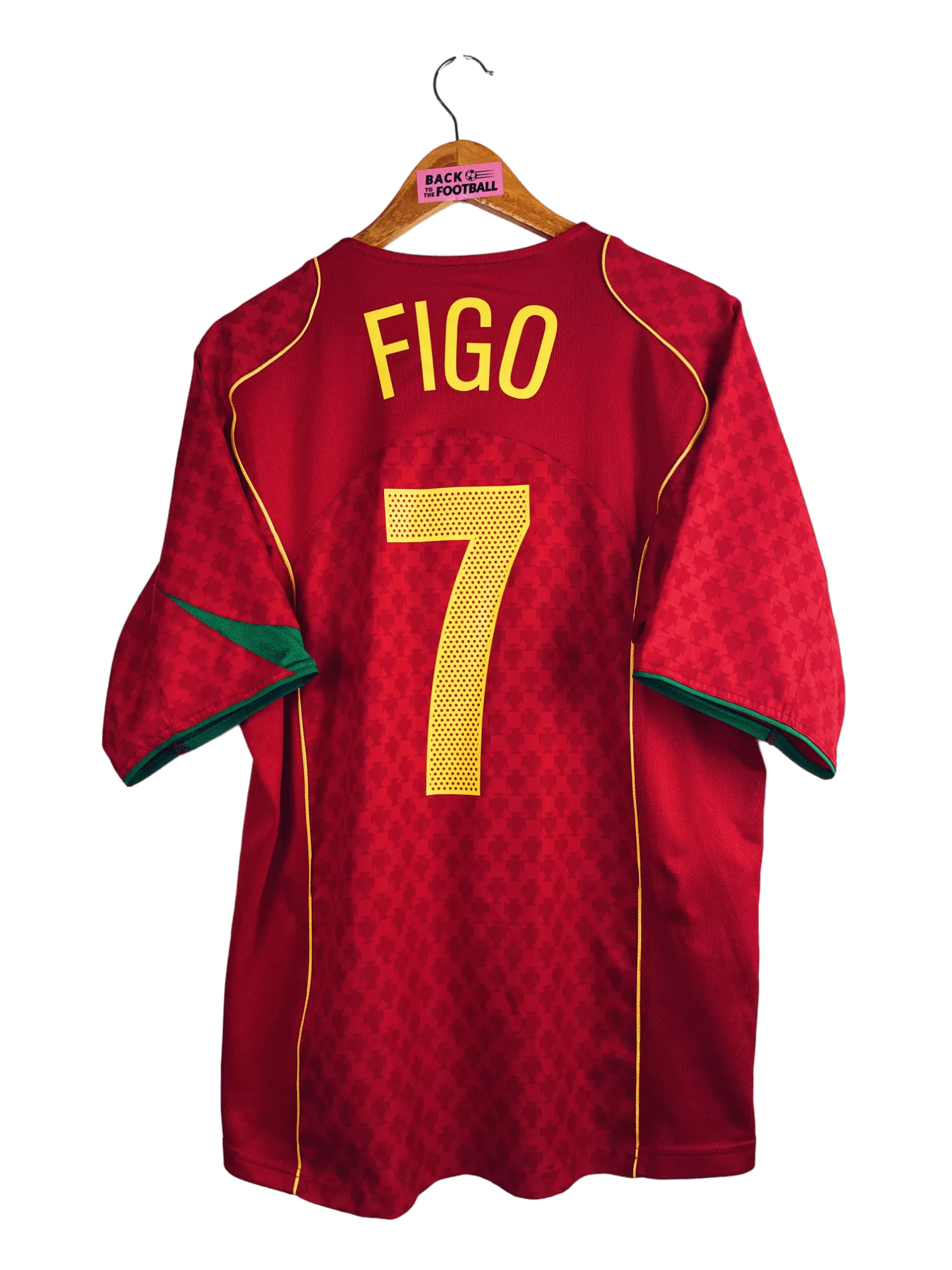 Taille : L Etat : 8.5/10, excellent état Le maillot : maillot vintage domicile du Portugal pour l’Euro 2004, floqué Figo #7.. L’écusson et le logo Nike sont brodés. Figo #7 est floqué à l’avant comme à l’arrière. On peut voir en tramé sur tout le maillot l’écusson du Portugal. Très beau maillot rétro du Portugal ! Histoire : le Portugal organise l’Euro 2004 sur ses terres. Lors du match d’ouverture, les portugais s’inclinent contre la Grèce, 2 buts à 1… Ils arrivent ensuite à gagner contre l’Espagne et la Russie pour finir premiers de leur groupe. En quarts de…