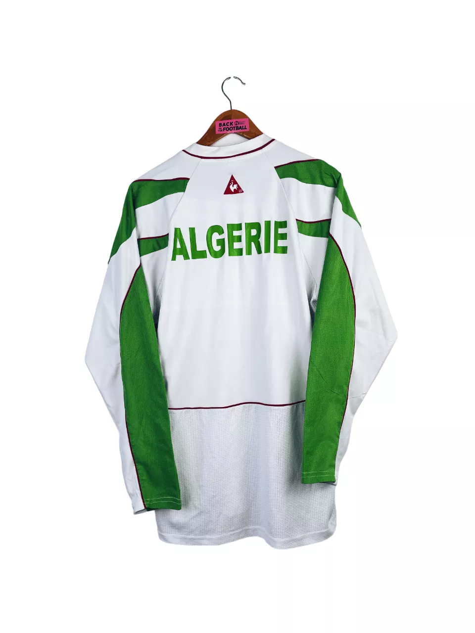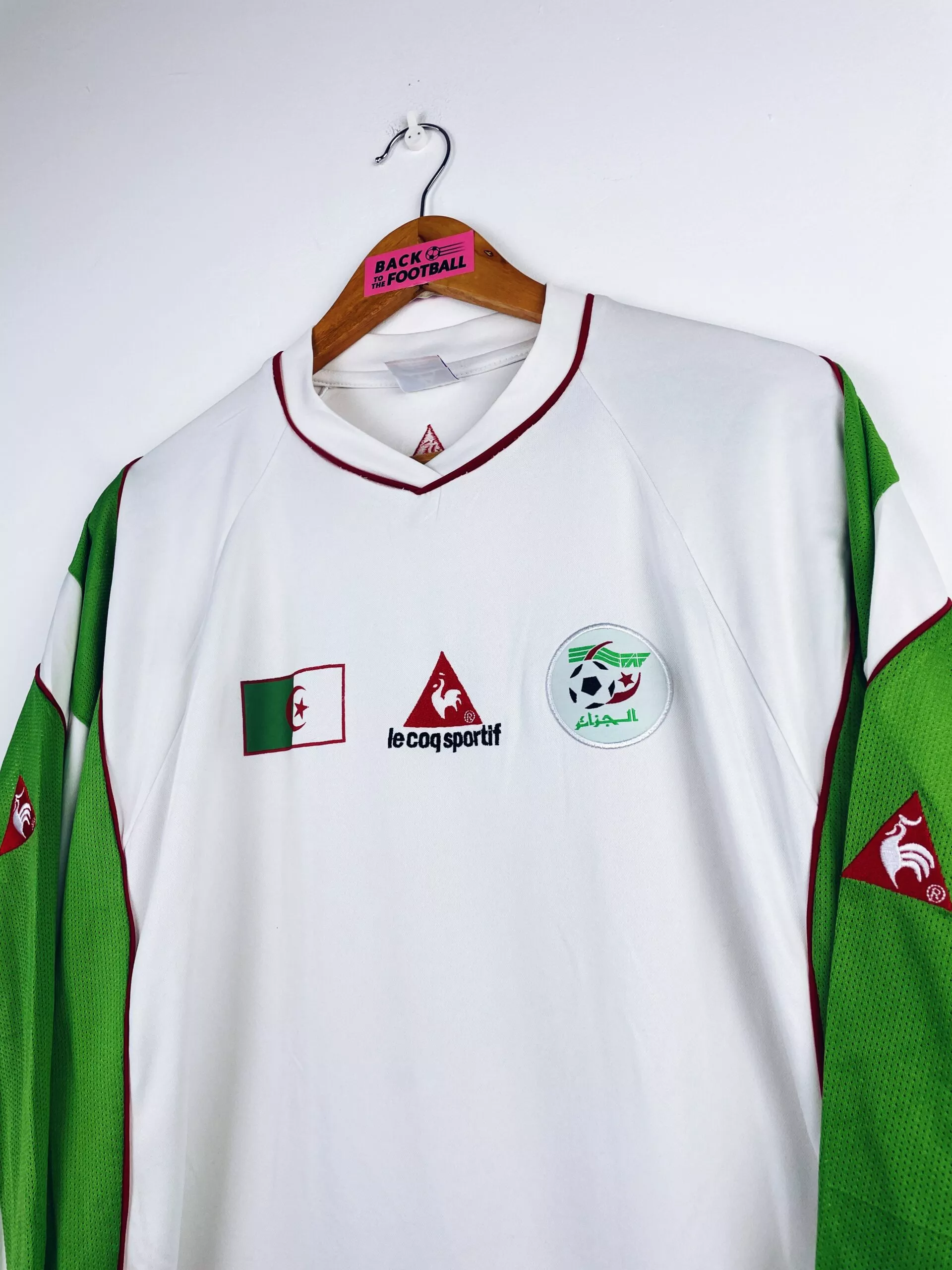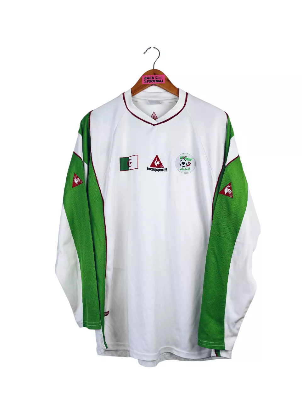 Taille : L Largeur : 53cm (aisselle à aisselle) Longueur : 72cm (base du col au bas) Etat : 7.5/10, très bon état mais de très légères traces derrière l’épaule (voir photo) Le maillot : maillot vintage domicile de l’Algérie 2004 en manches longues. L’écusson et le logo Le Coq Sportif sont brodés, le drapeau de l’Algérie est floqué. Joli maillot rétro de l’Algérie. Histoire : les Fennecs sortent deuxièmes de leur groupe lors de la CAN 2004, derrière le Cameroun. Ils sortiront en quart de finale face au Maroc, après les prolongations. QUelques joueurs : Ziani, Belmadi, Cherrad…