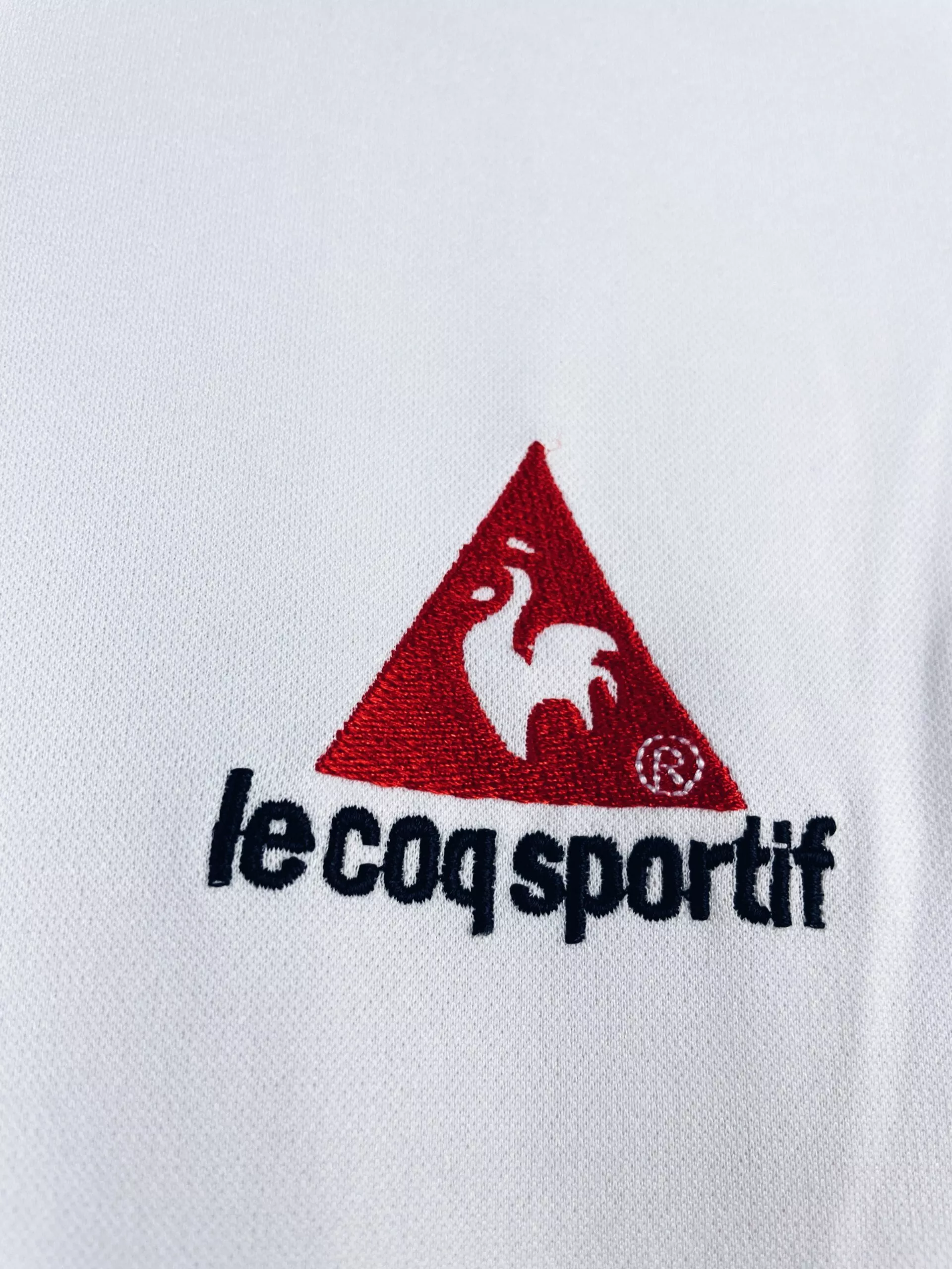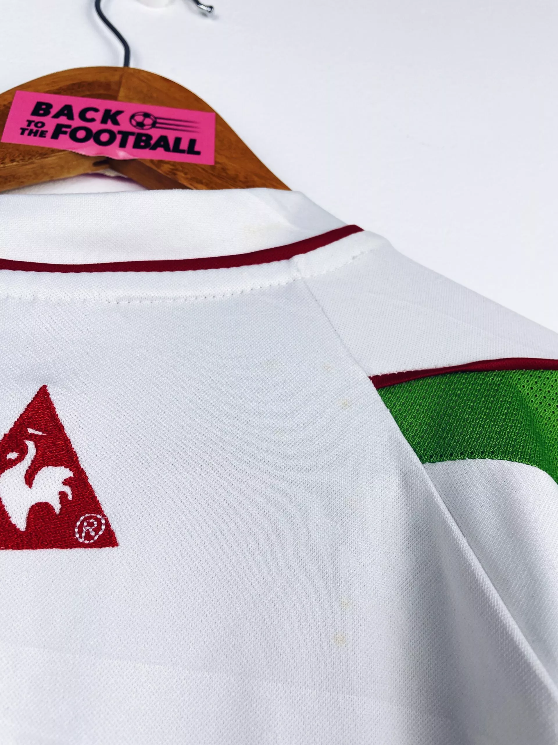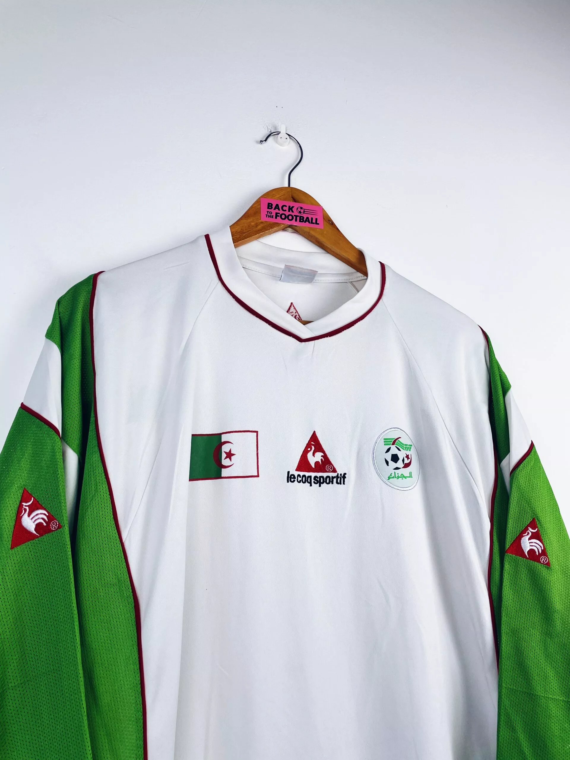 Taille : L Largeur : 53cm (aisselle à aisselle) Longueur : 72cm (base du col au bas) Etat : 7.5/10, très bon état mais de très légères traces derrière l’épaule (voir photo) Le maillot : maillot vintage domicile de l’Algérie 2004 en manches longues. L’écusson et le logo Le Coq Sportif sont brodés, le drapeau de l’Algérie est floqué. Joli maillot rétro de l’Algérie. Histoire : les Fennecs sortent deuxièmes de leur groupe lors de la CAN 2004, derrière le Cameroun. Ils sortiront en quart de finale face au Maroc, après les prolongations. QUelques joueurs : Ziani, Belmadi, Cherrad…