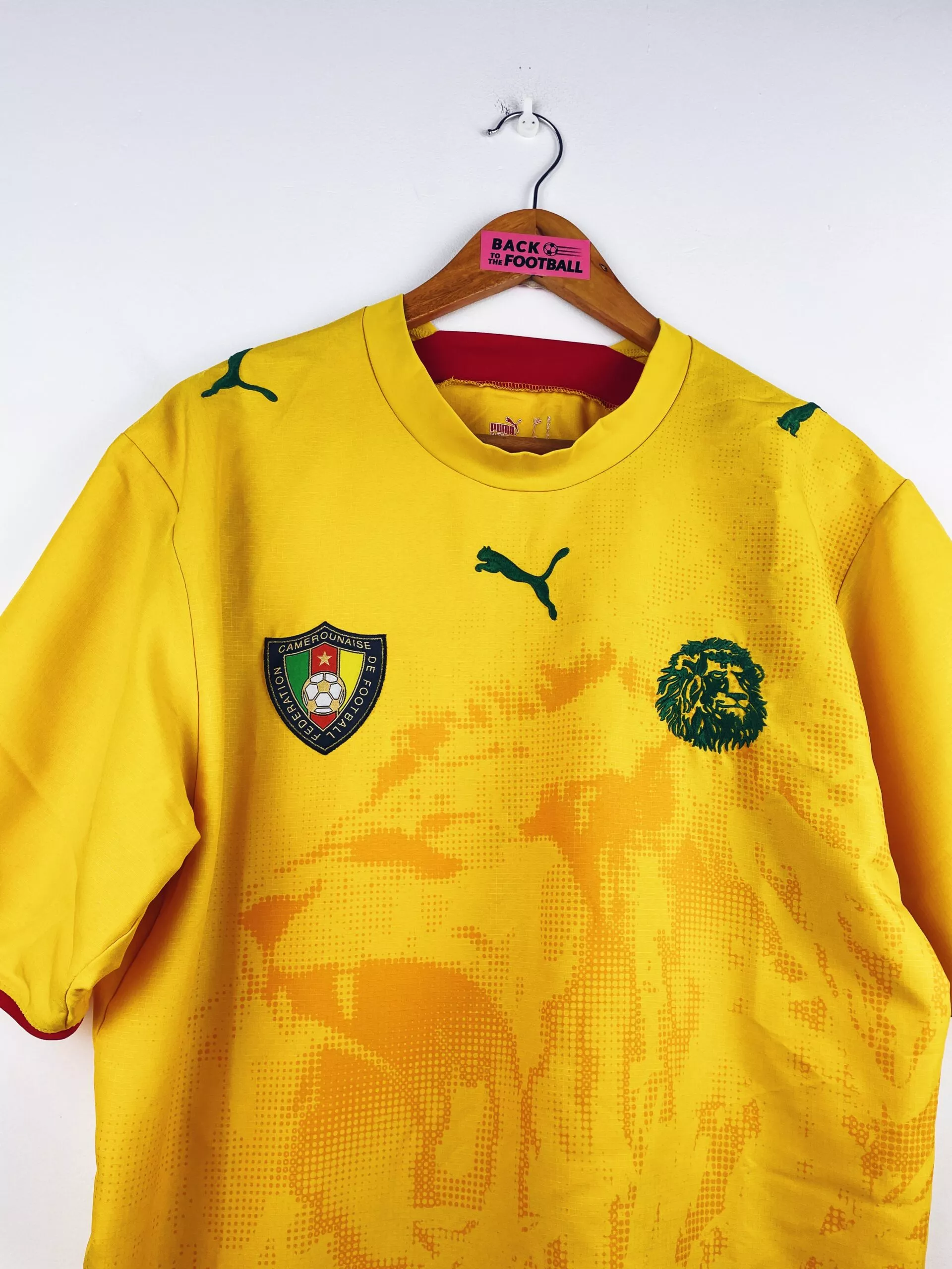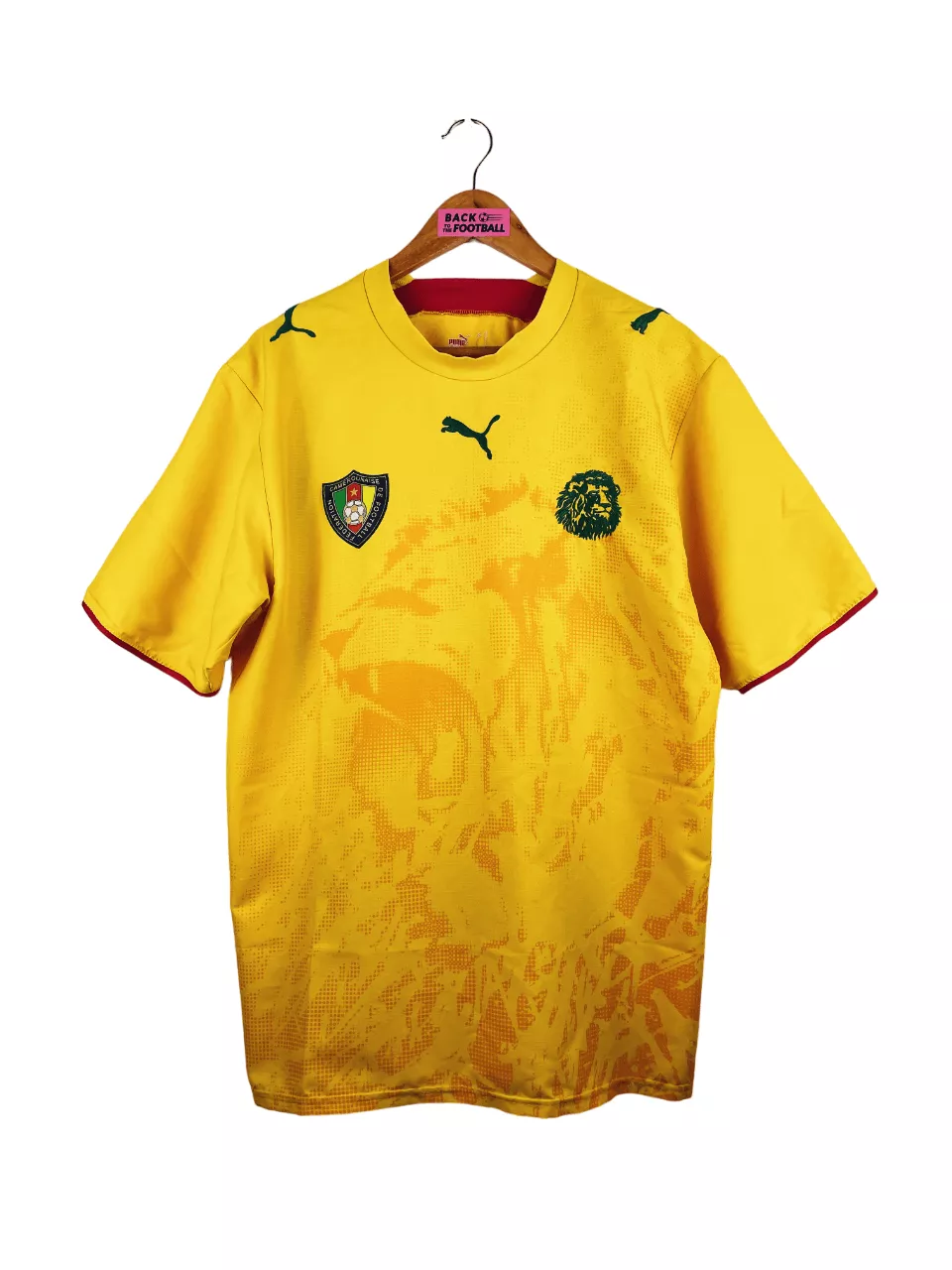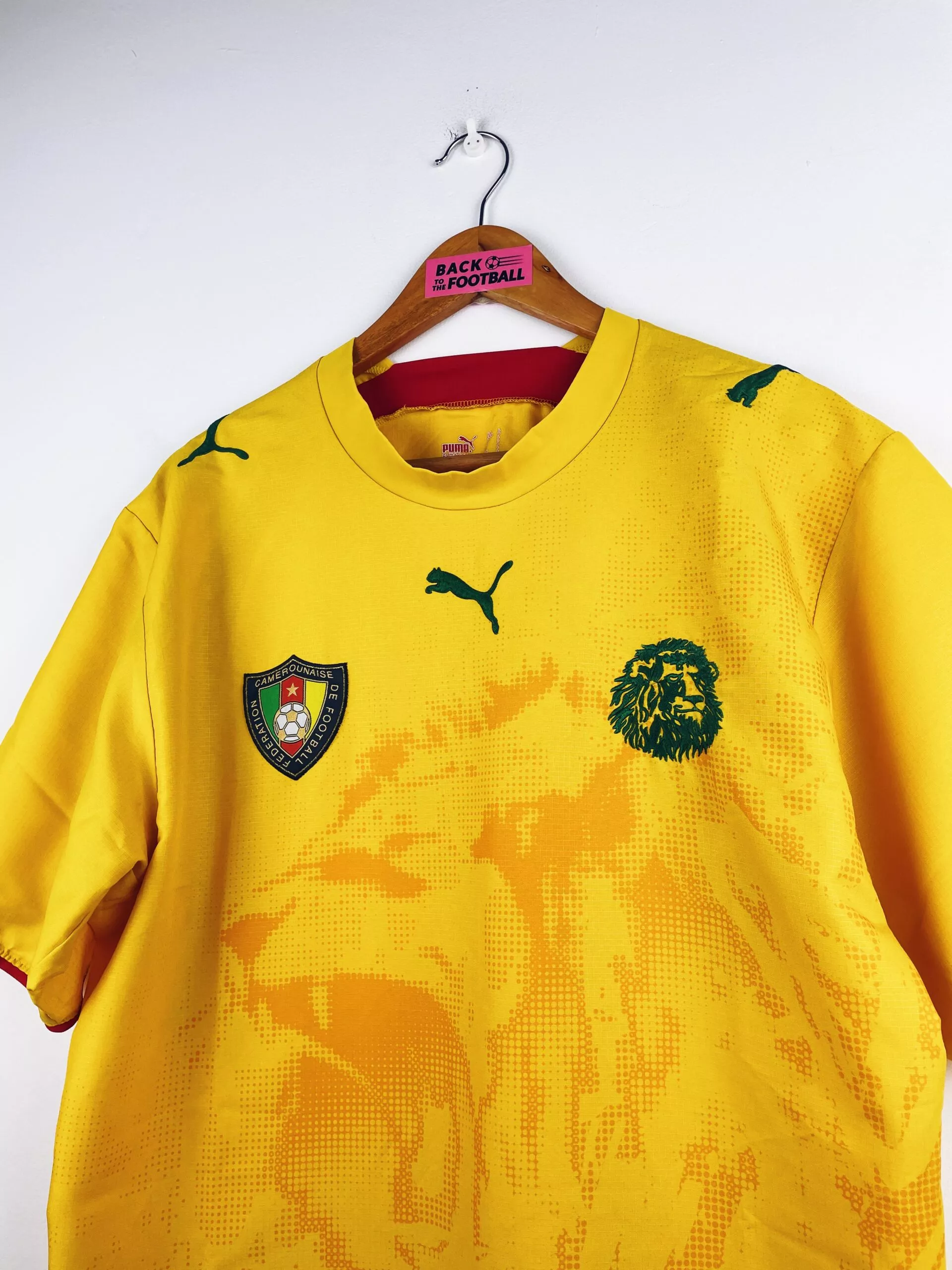Taille : L Si tu veux plus de détails, tu peux nous contacter par mail ou sur les réseaux 😉 Etat : 8.5/10, excellent état Le maillot : maillot vintage extérieur du Cameroun 2006. Les écussons et le logo Puma sont brodés. On peut voir un lion rugissant en motif. Très beau maillot rétro du Cameroun ! Histoire : le Cameroun termine à la 1ère place de son groupe à la CAN 2006. En quarts, les Lions indomptables font match nul 1-1 contre la Côte d’Ivoire. Après 11 tirs au but, Eto’o loupe le sien lors de son 2ème passage…