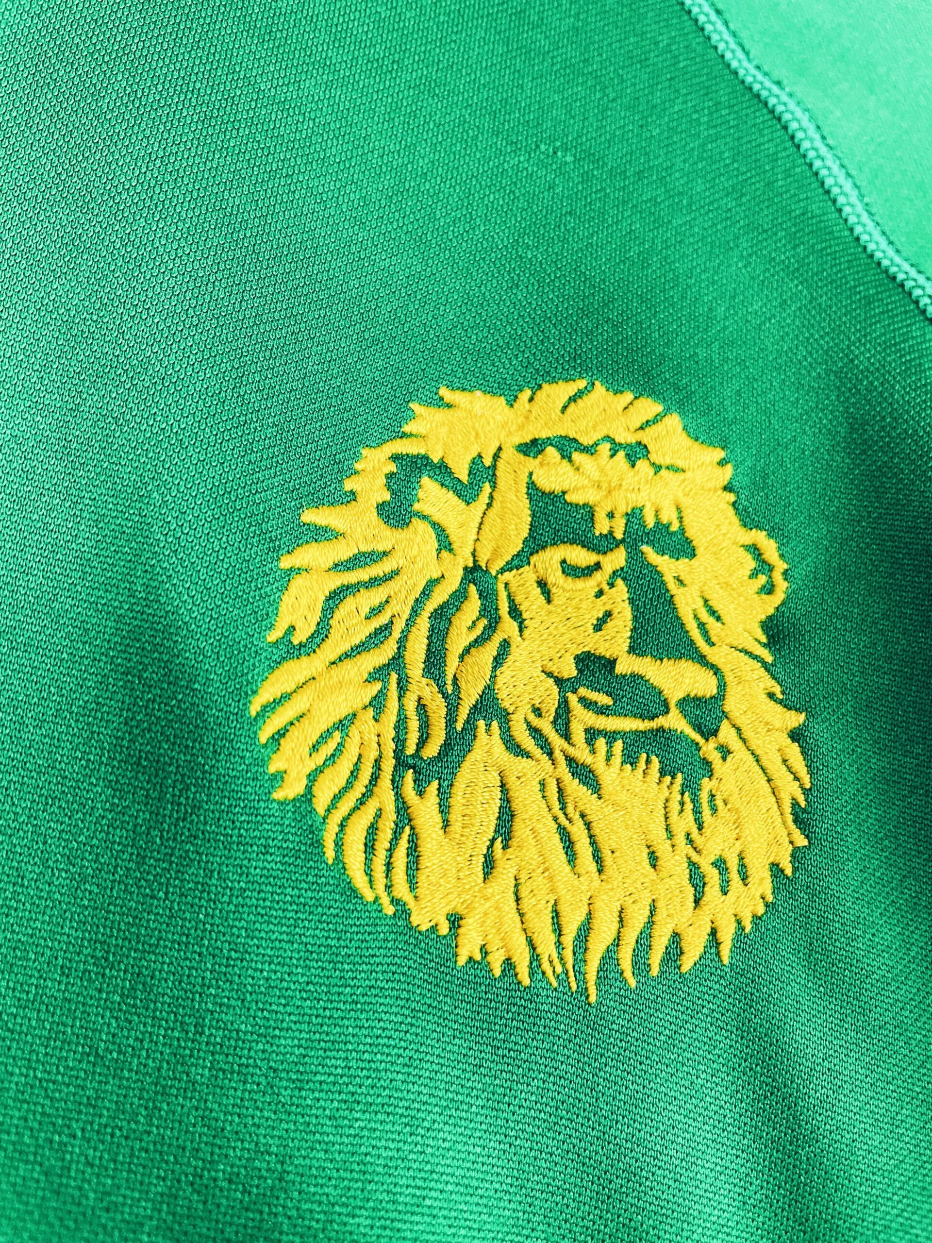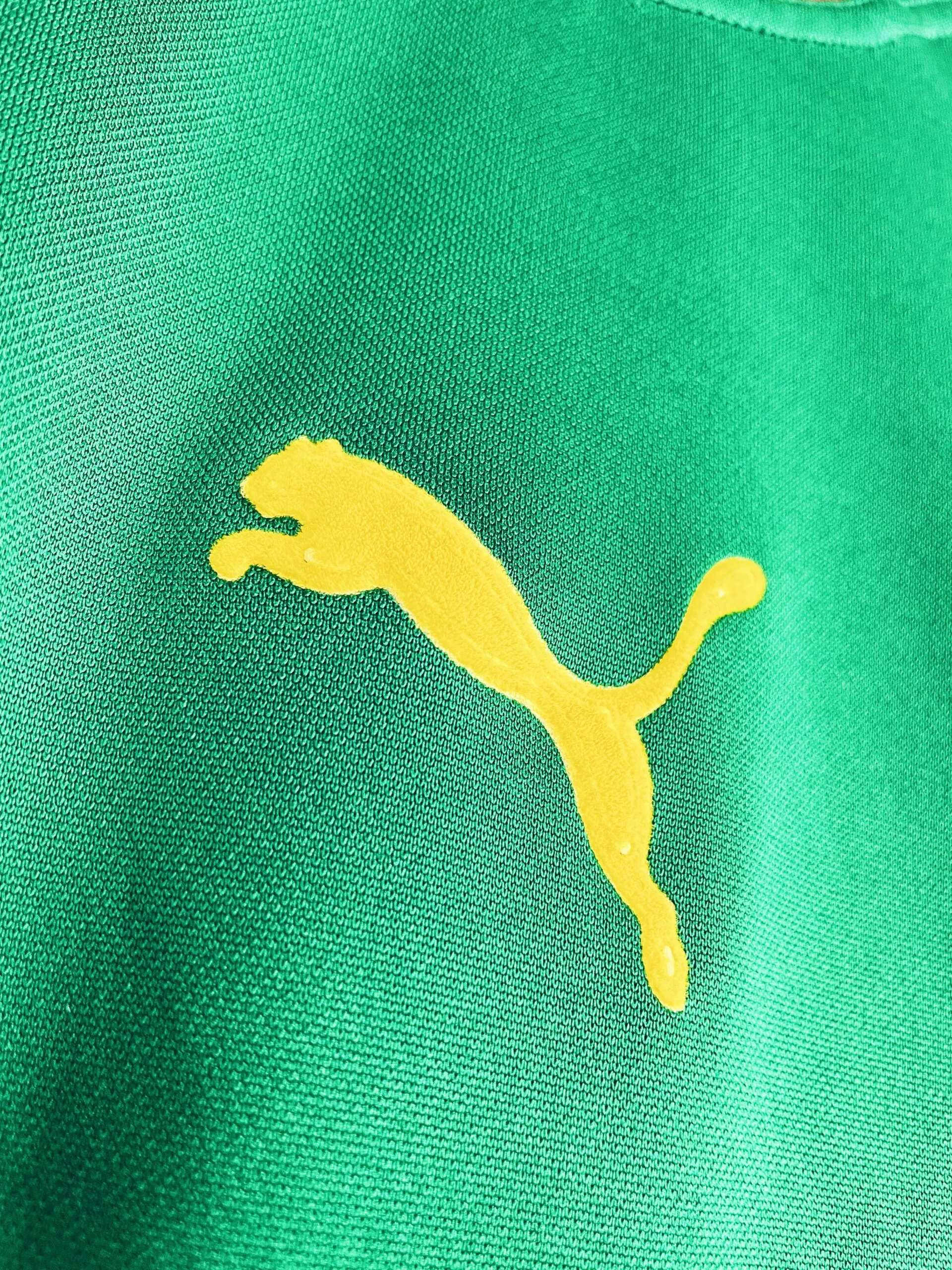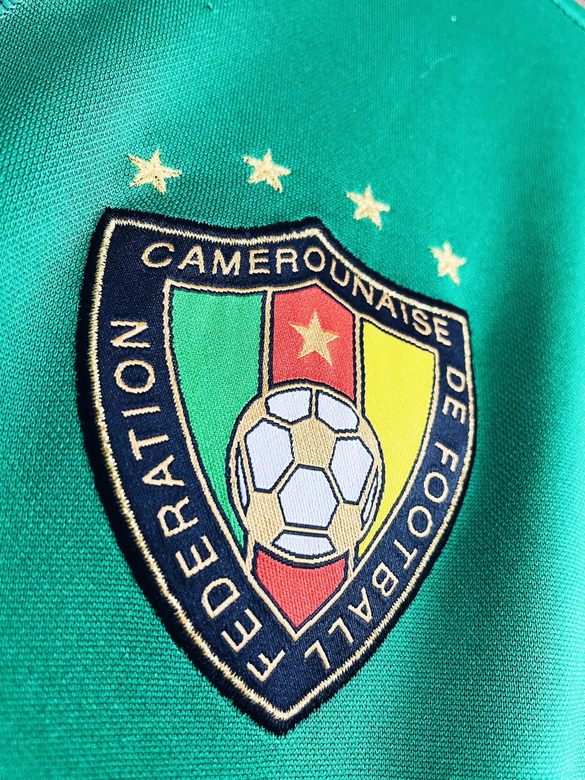 Taille : M Etat : 7.5/10, très bon état mais des bouloches sur la manche et un accro sur le devant (voir photos) Le maillot : maillot vintage domicile du Cameroun pour la CAN 2004. L’écusson et le lion sont brodés. Les logo Puma sont en feutrine. Les griffes sur les côtes sont magnifiques ! Très beau maillot rétro du Cameroun ! Histoire : le Cameroun est très attendu, ayant gagné les 2 dernières CAN 2000 et 2002. Les Camerounais sortent premiers de leur groupe, devant l’Algérie, l’Egypte et le Zimbabwe avec 6 buts marqués en 3 matchs. Mais ils…
